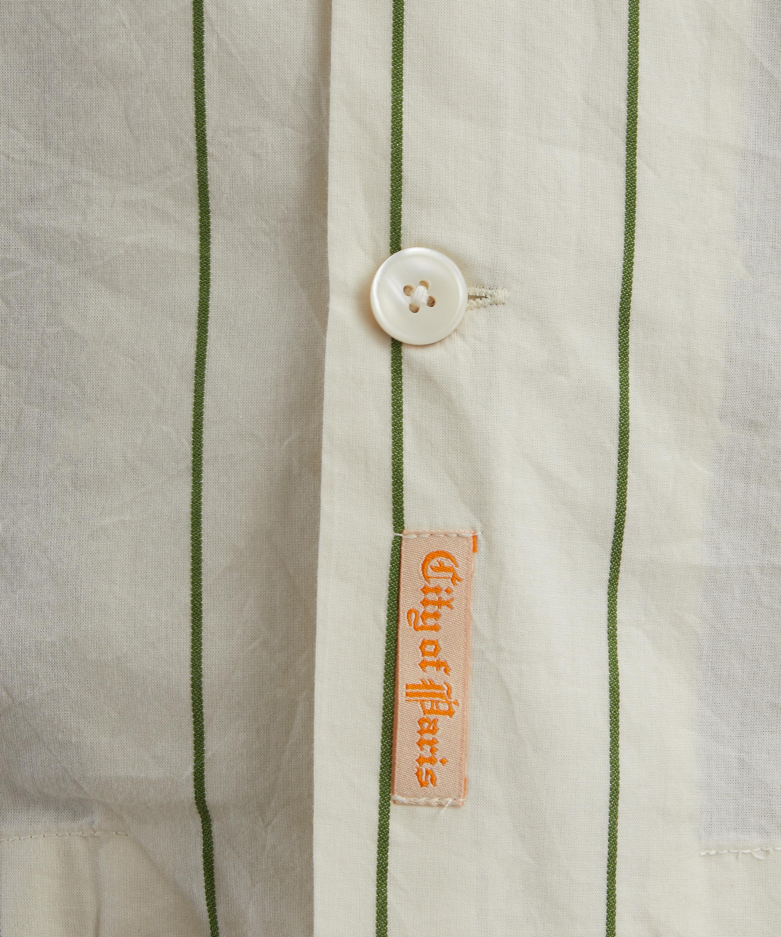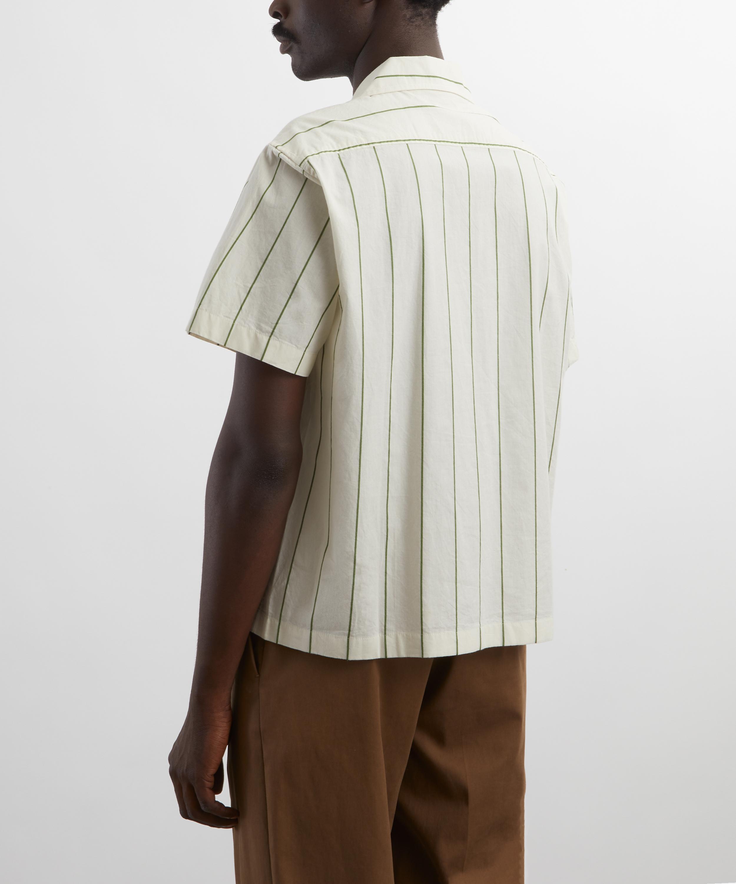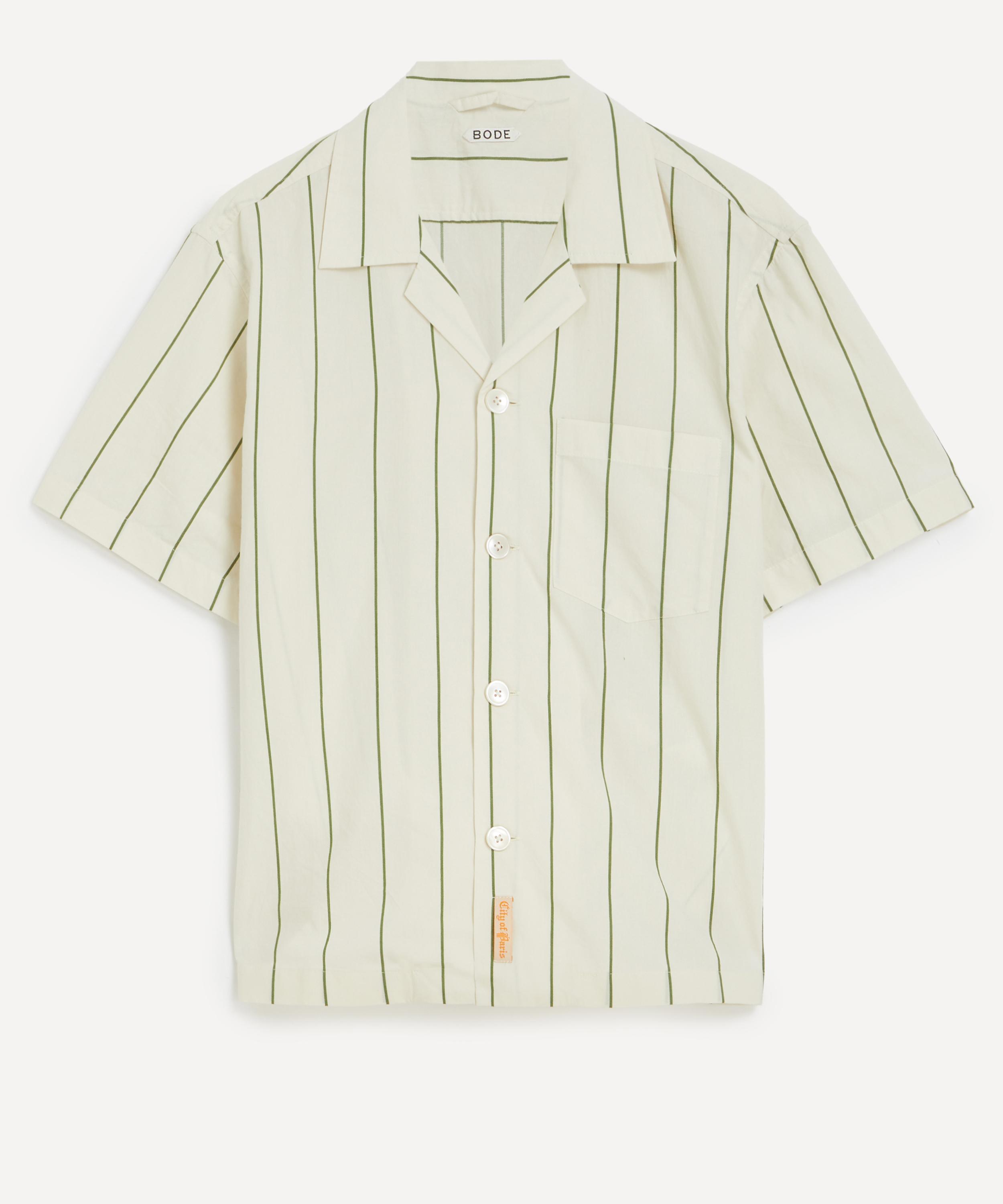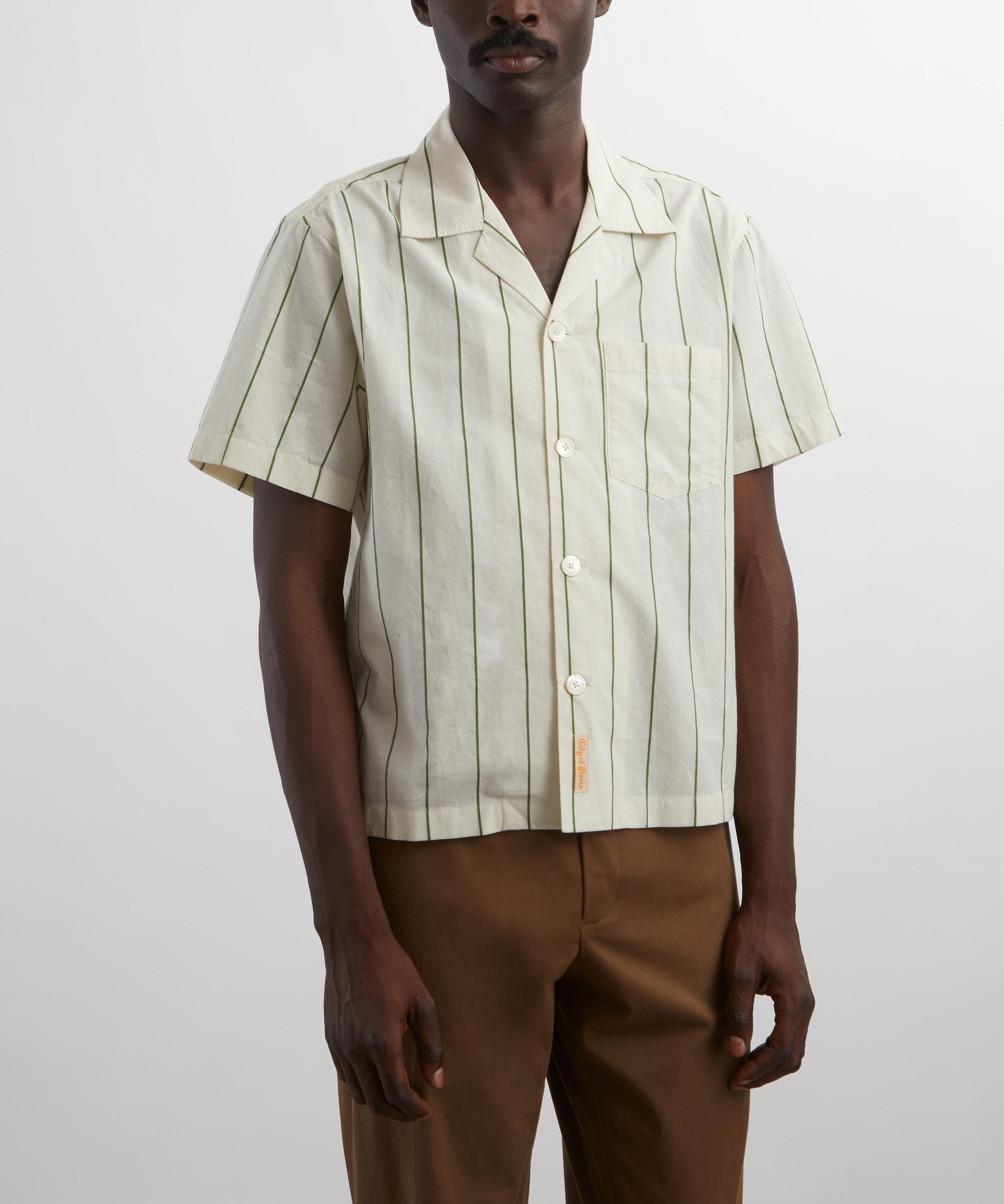 Crafted from soft cotton with green stripes, this short-sleeve shirt takes inspiration from a 1930s shirting sample book. Designed in a relaxed, boxy fit, it features a classic camp collar and chest pocket for a refined yet laid-back finish.