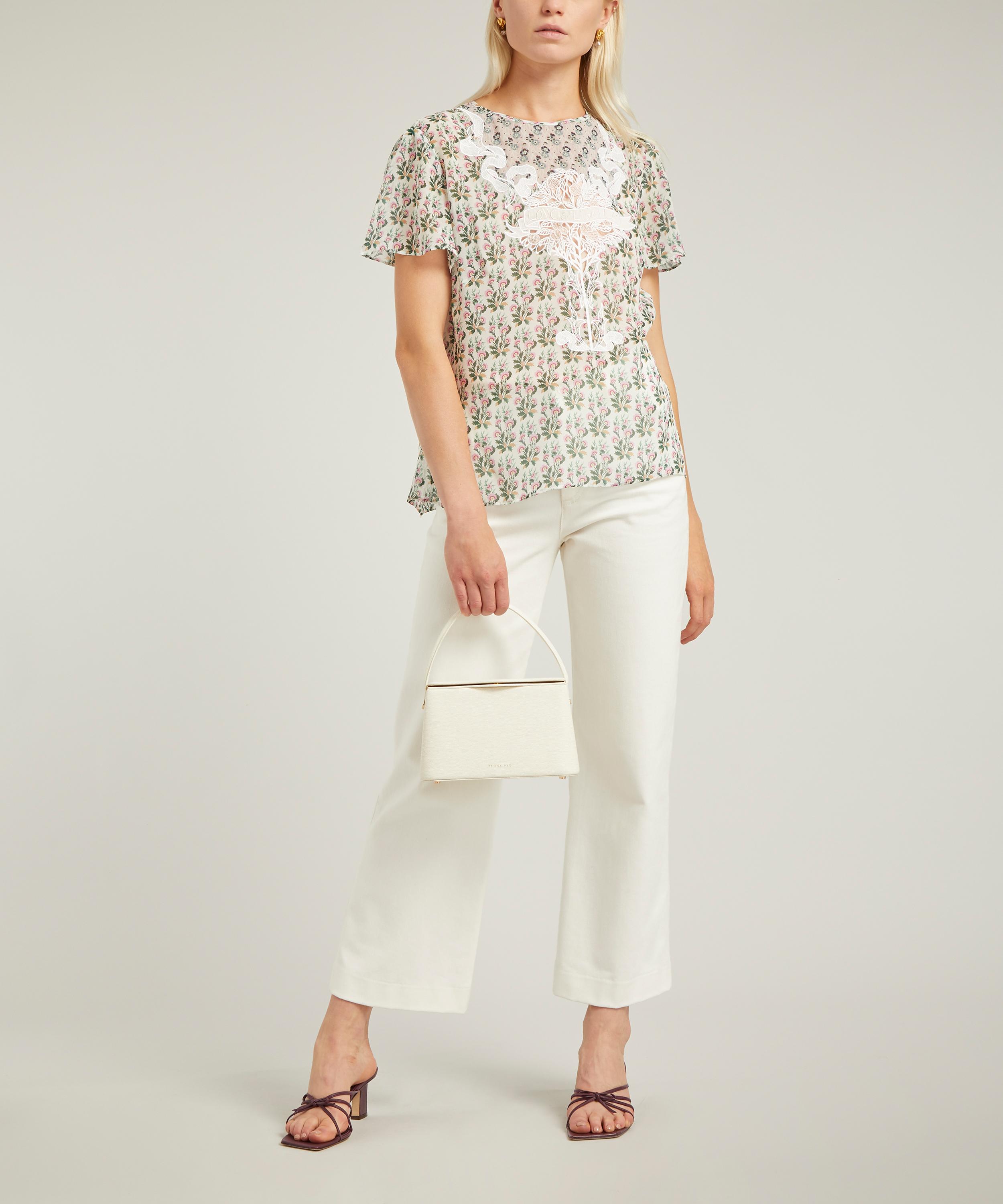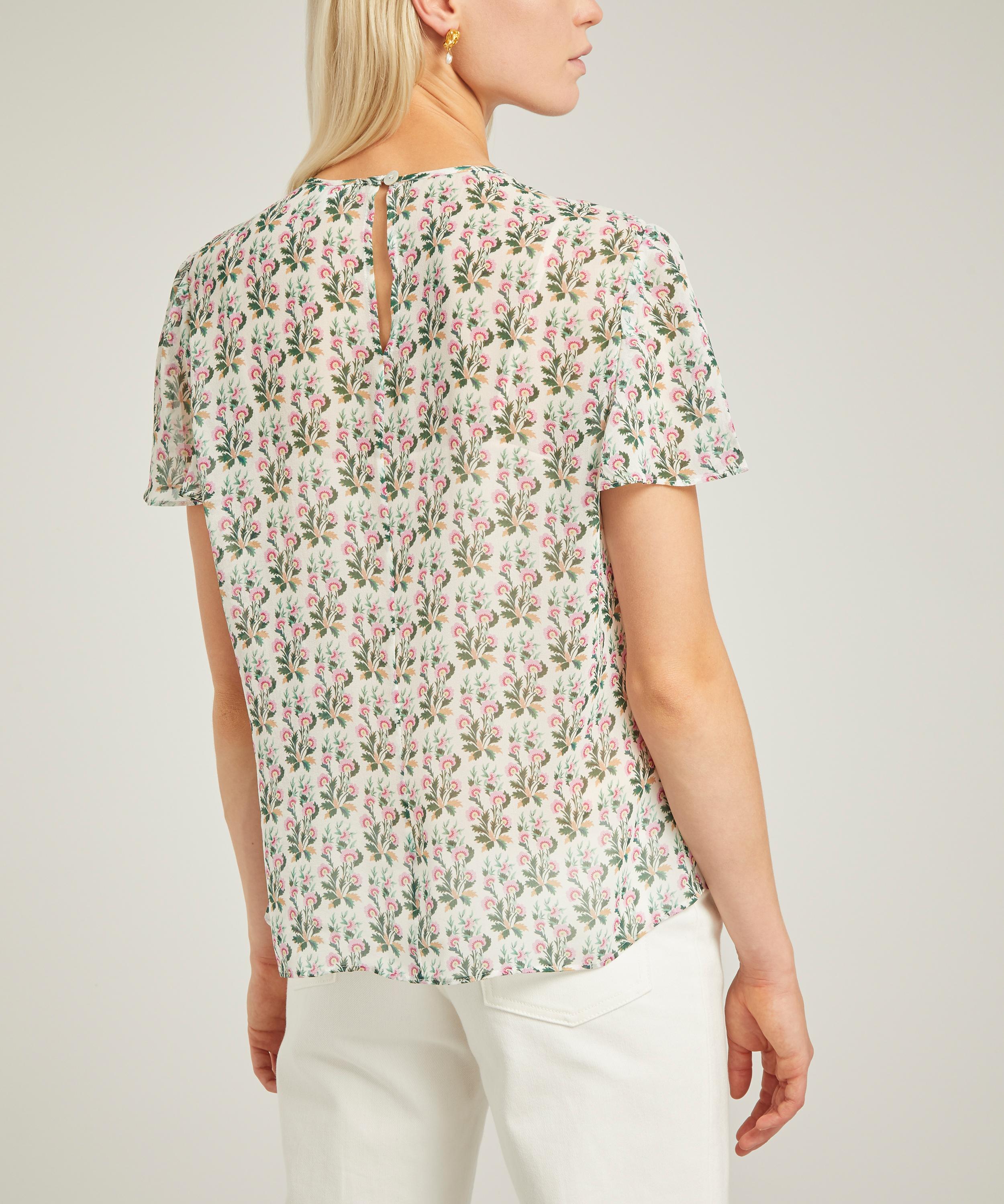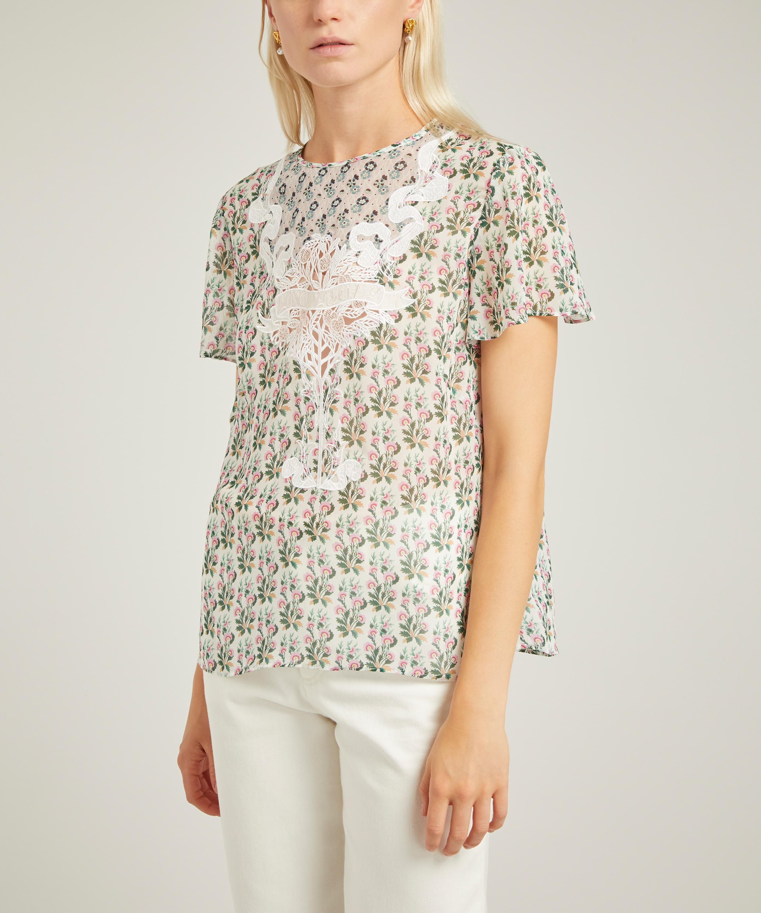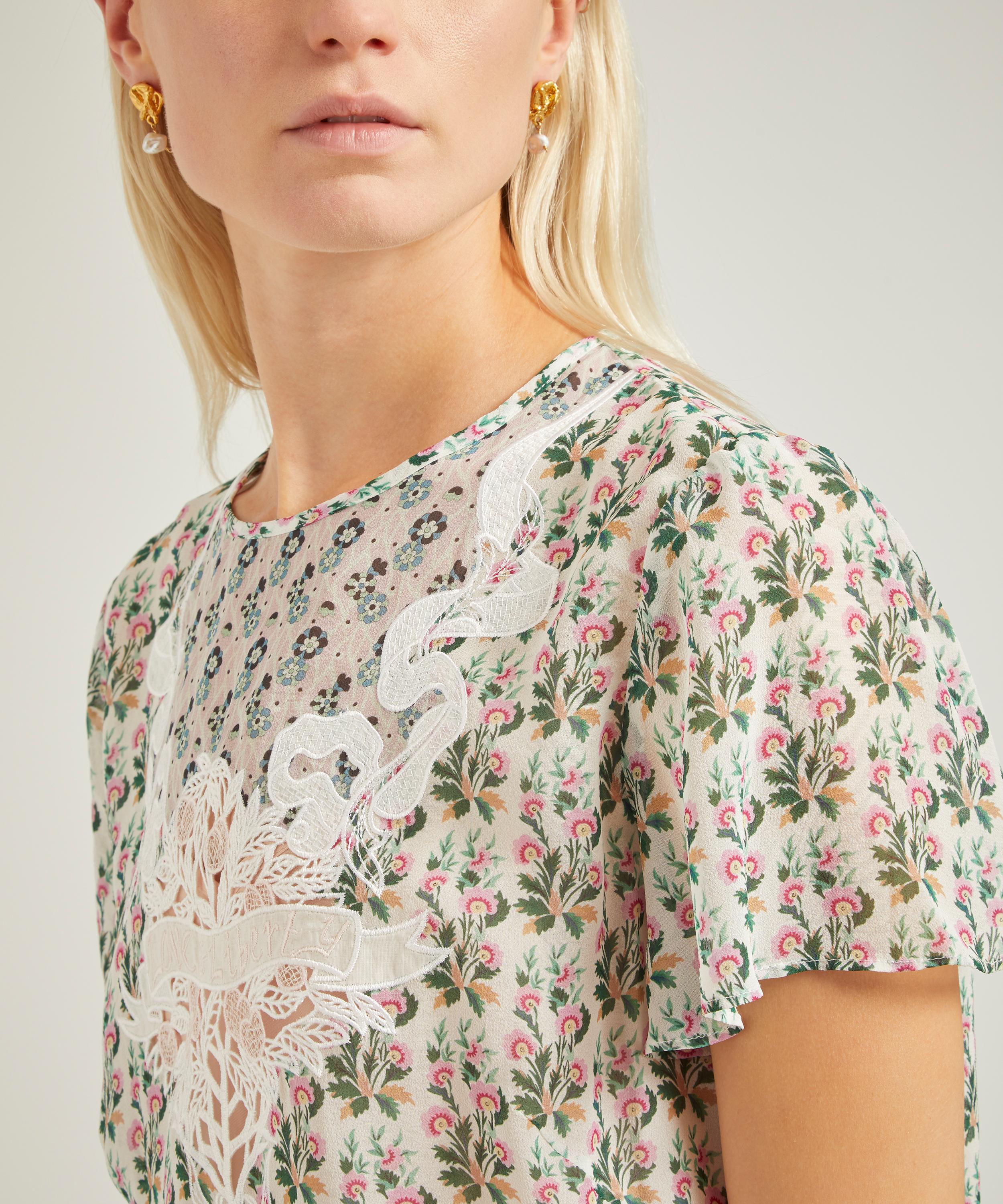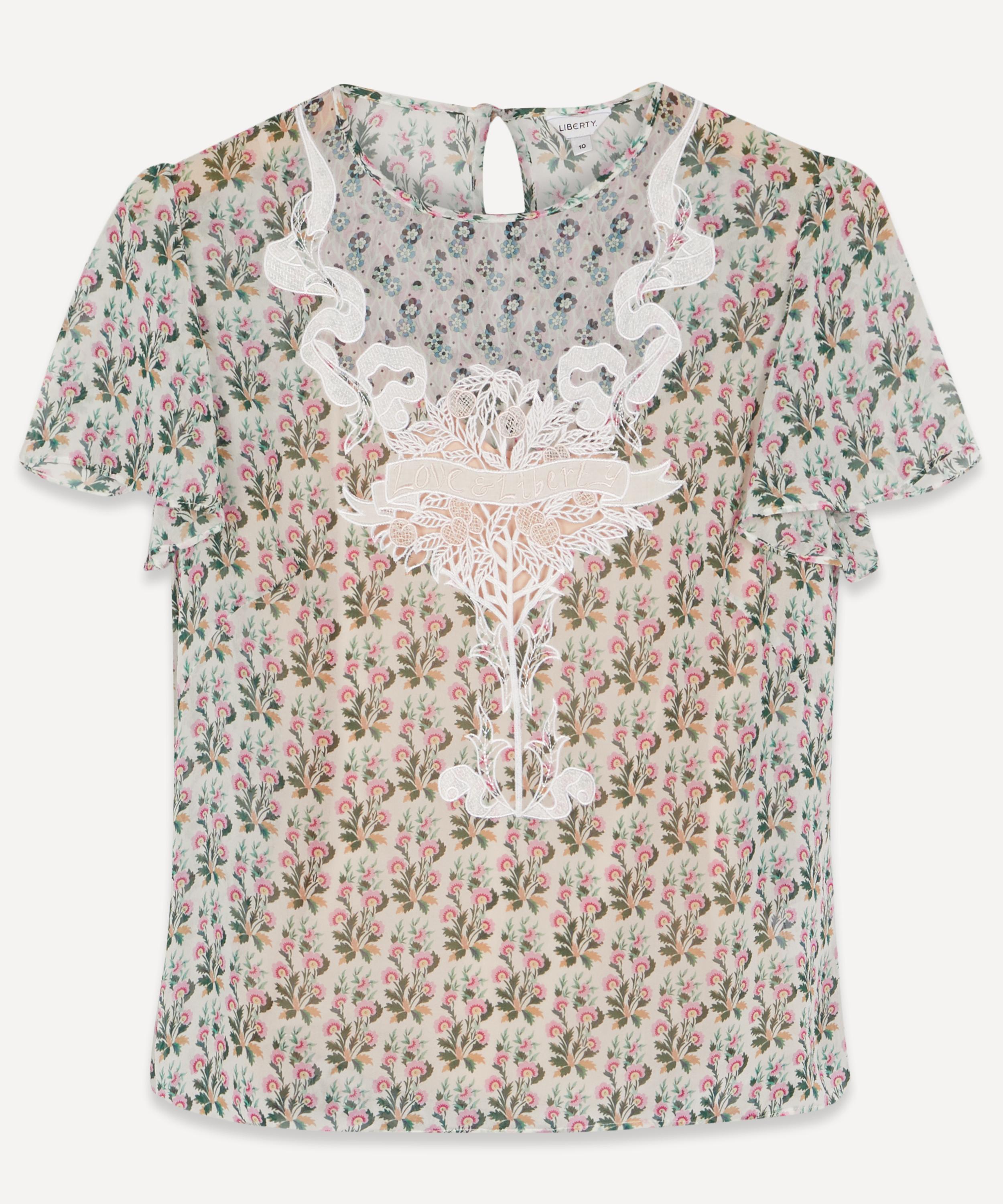 Designed in-house, the Everly silk T-shirt from Liberty features our Celia print, finished with intricate bodice embroidery inspired by an archival peach tree artwork.