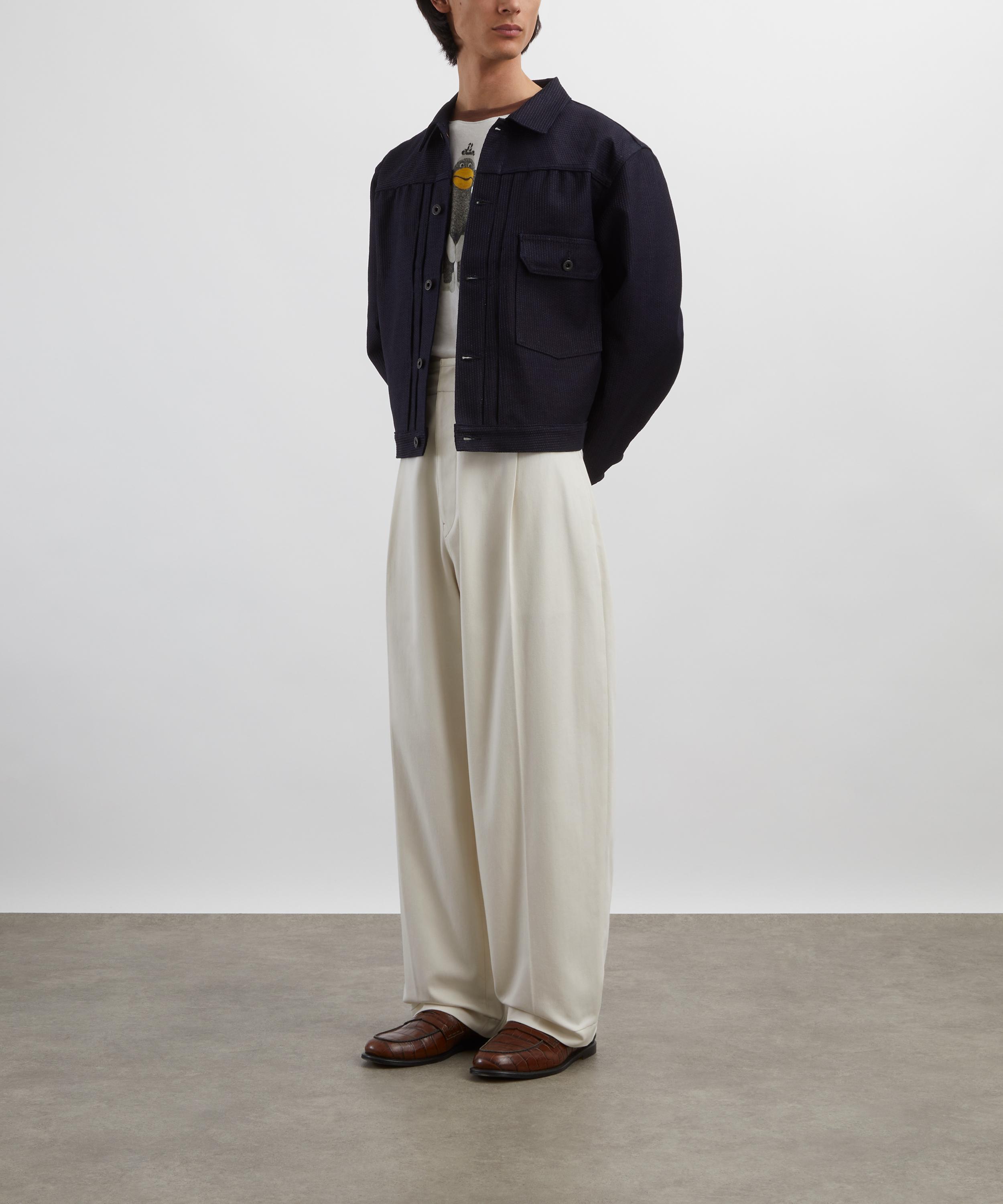 Crafted from KAPITAL’s signature Century Denim, this blouson jacket is made from a distinctive Sashiko Yarns Stitch-patterned fabric, woven with three mixed dyes for a rich, multi-tonal effect. Featuring a boxy, slightly cropped silhouette, this piece draws inspiration from classic utilitarian styles, enhanced with a functional flap pocket on the chest for added detail practicality.