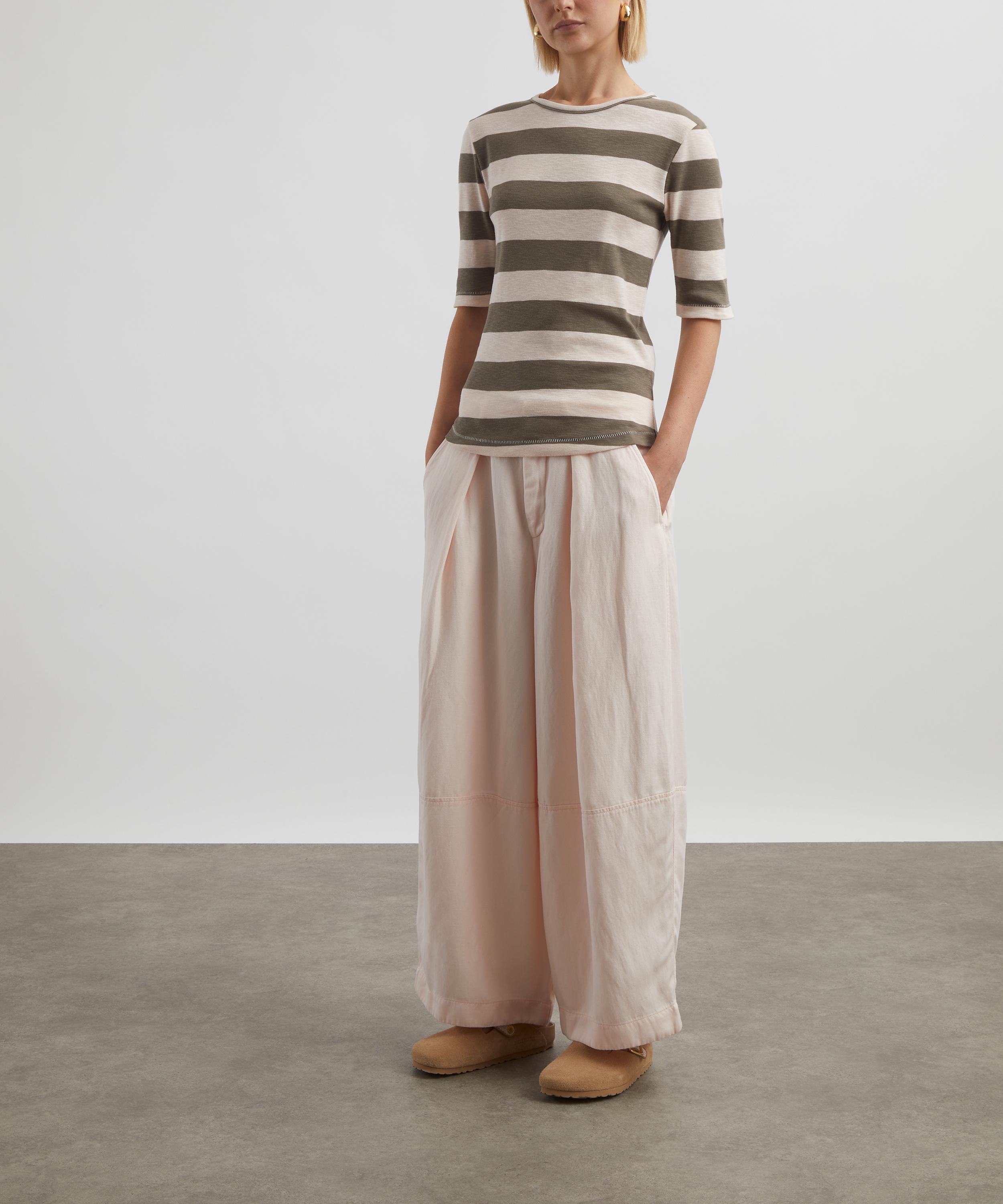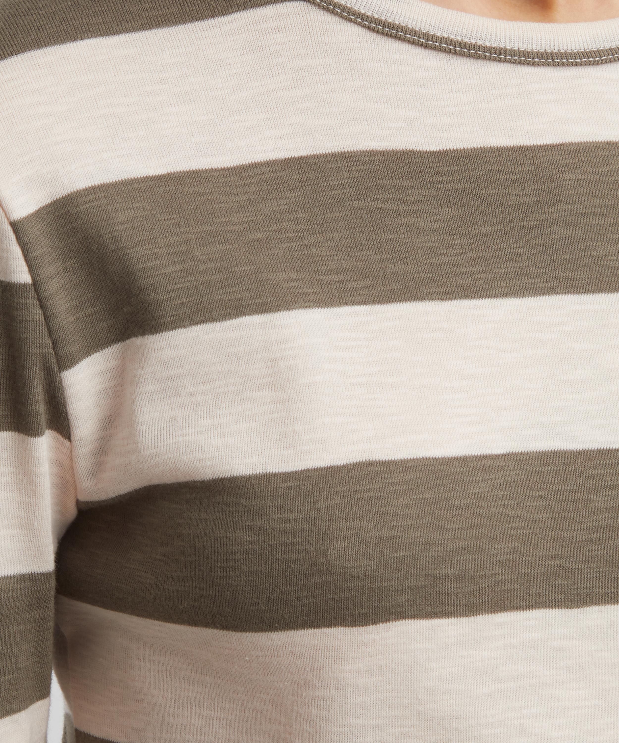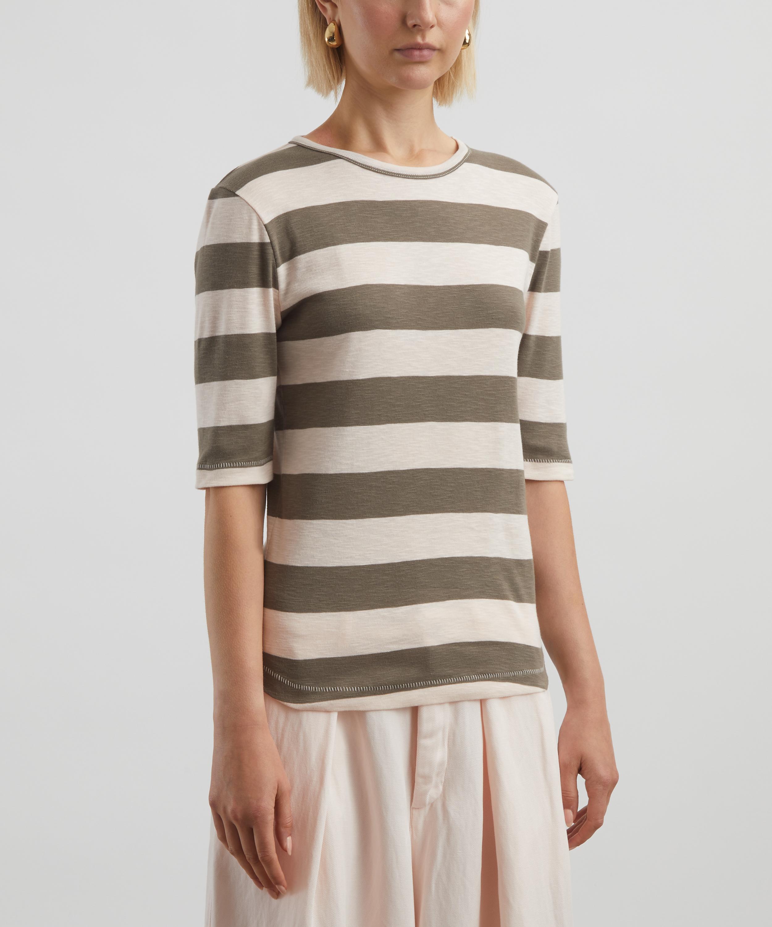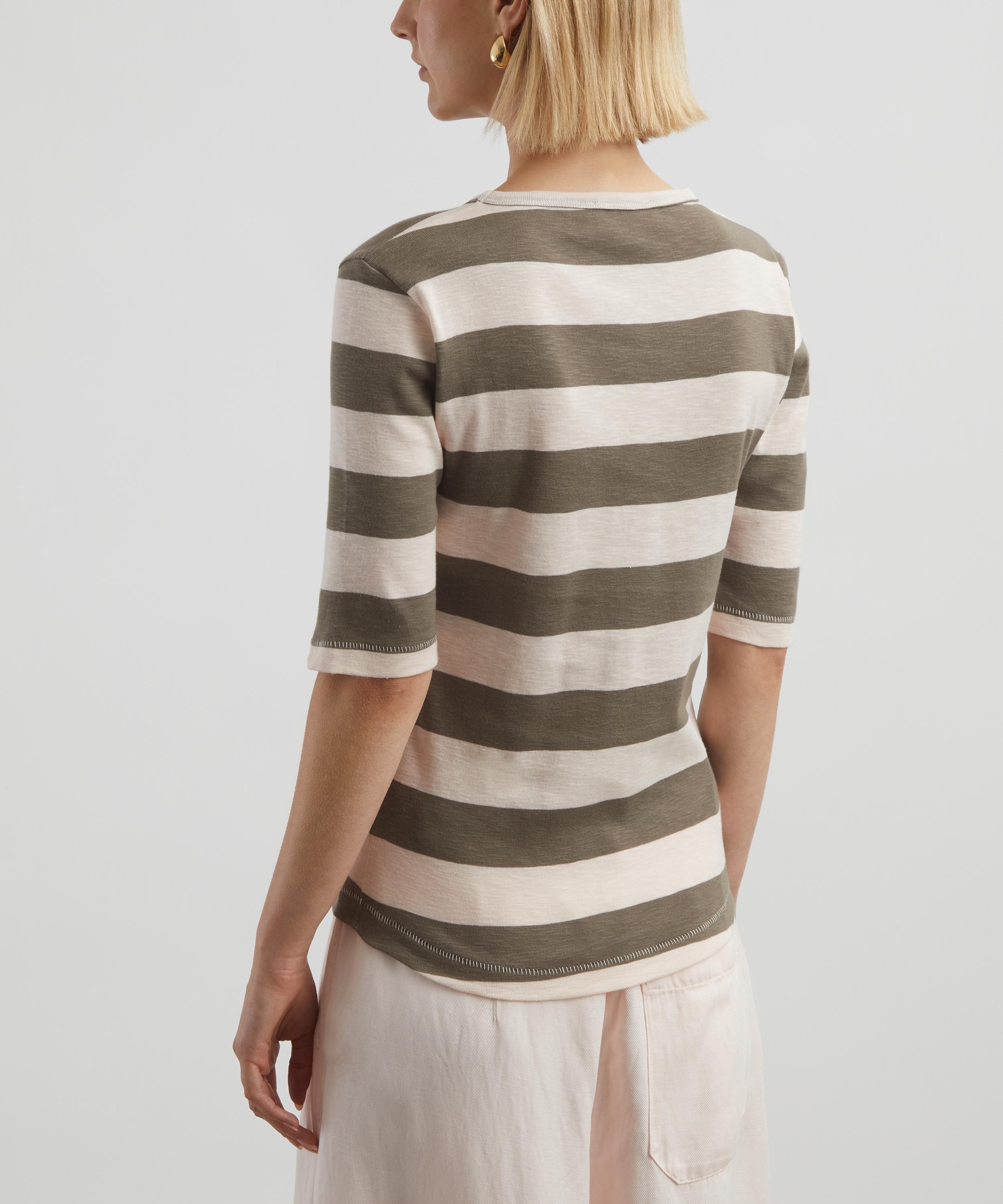 Crafted from striped dyed cotton slub jersey, this top boasts a slim fit complete with baseball style top stitching and a classic curved hem. Finished with self fabric binding to the neck, style with tailoring or dark denim for an effortless way to add a contemporary edge to daily dressing.