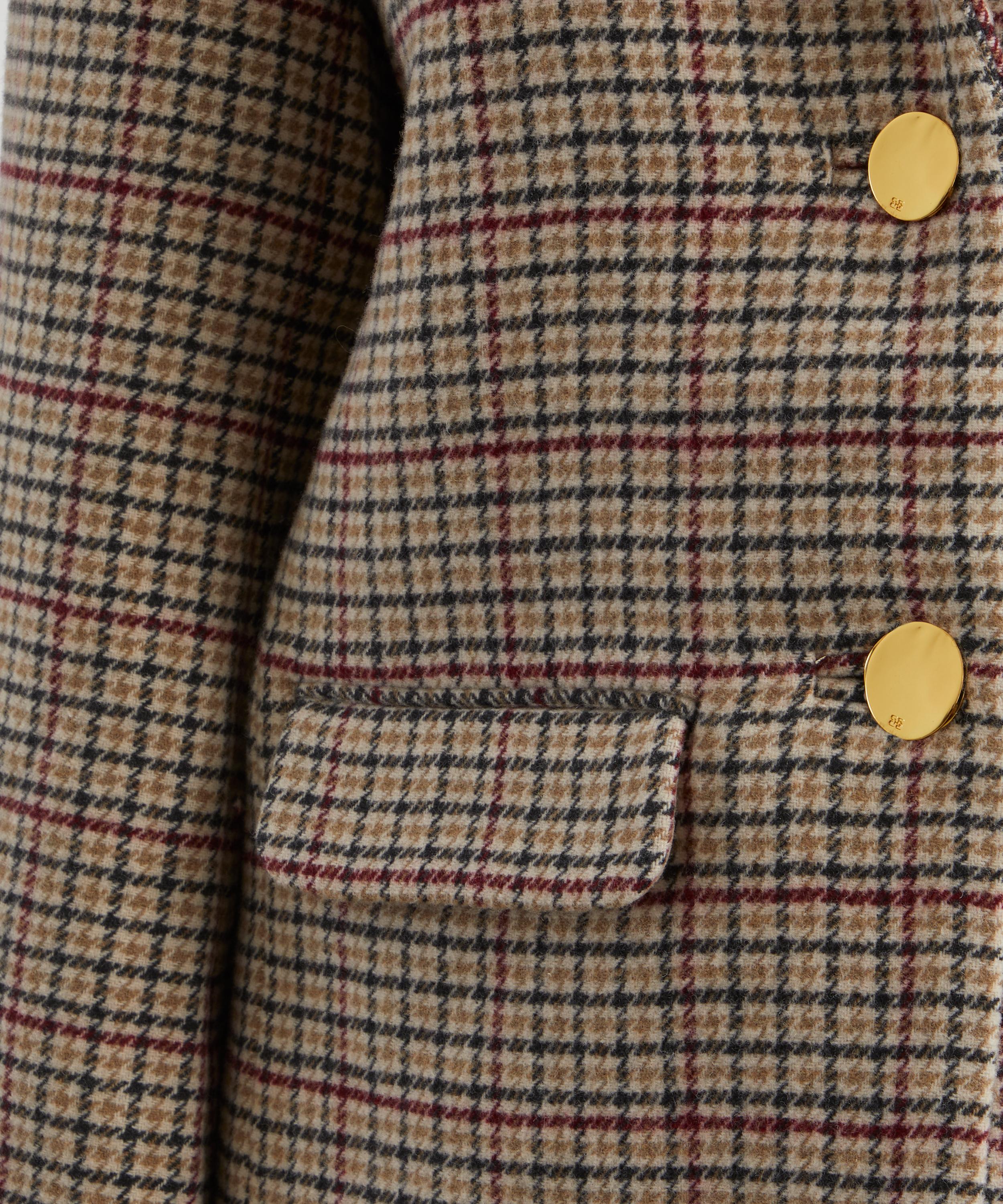 Crafted from a wool blend with a classic check pattern, this blazer offers an oversized, boxy fit. Inspired by traditional tailored styles, it features a notched collar, button closure, and practical pockets at the chest and front.