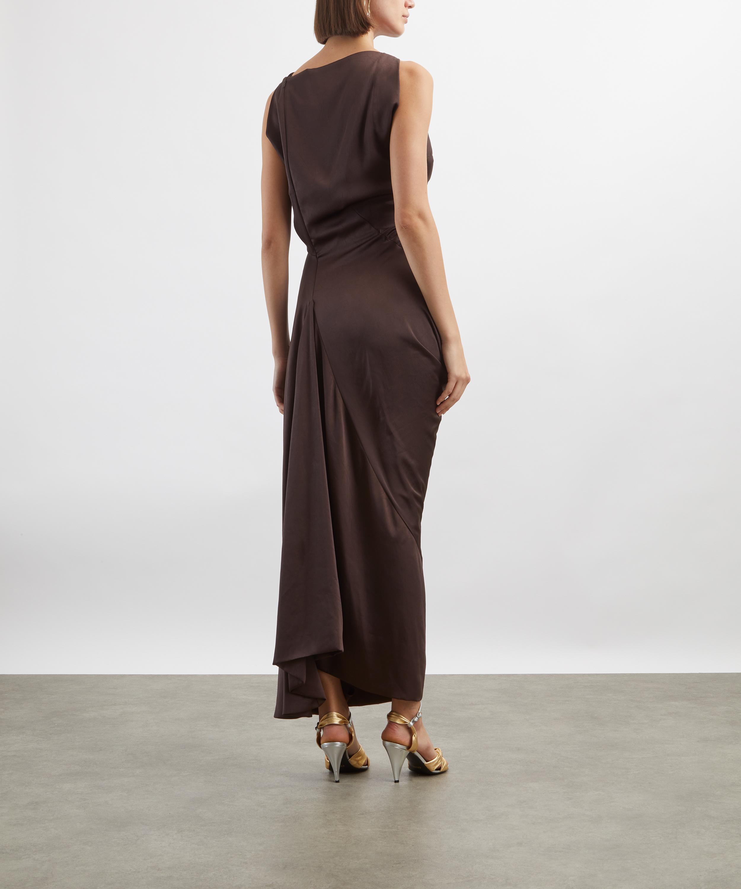 Crafted from lightly crinkled satin in a rich brown hue, the Long Fond dress features graceful drapery at the neckline and waist, falling into an elongated column silhouette finished with a fluid, asymmetric hemline.