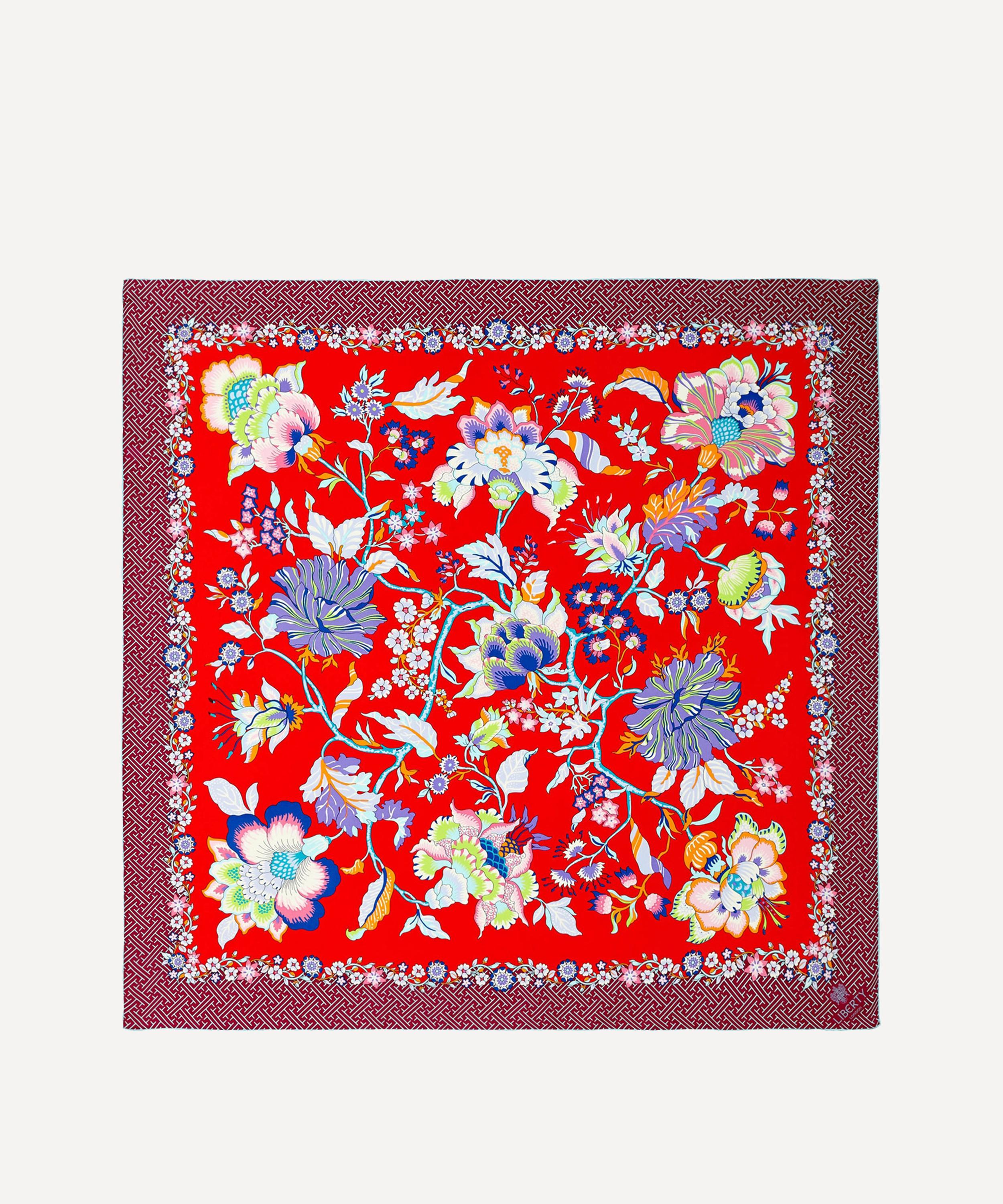 This classic silk square scarf is a timeless and versatile investment. Christelle is a medium sized oriental floral trail with tree of life style flowers. These types of patterns are based on the early Indian chintzes that first came to Europe in the 17th century. Christelle first appeared in Liberty collections in the early 1990s as a furnishing fabric. Here, the oriental mood of the flowers is emphasized by the geometric, Chinese inspired border.