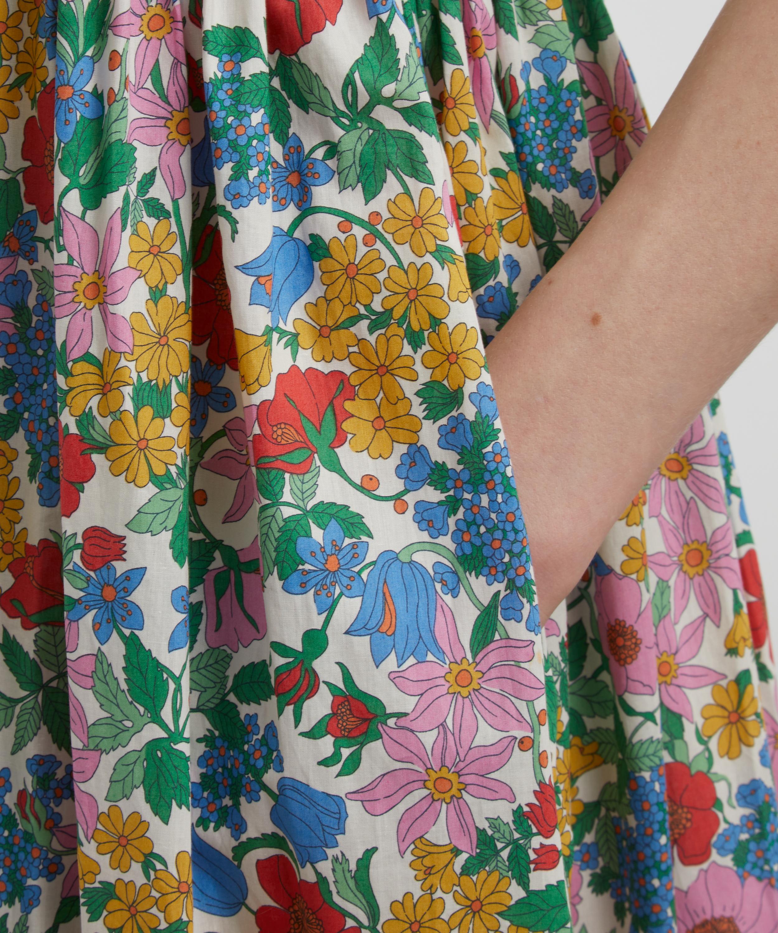Printed in our very own cutting-edge Liberty fabric mill in northern Italy, this particular style of dress showcases the Clarabell print - inspired by the vibrant beauty of summer gardens, Clarabell features intricate trails of anemones, roses, bellflowers, daisies, and forget-me-nots, creating a captivating symphony of form and colour.