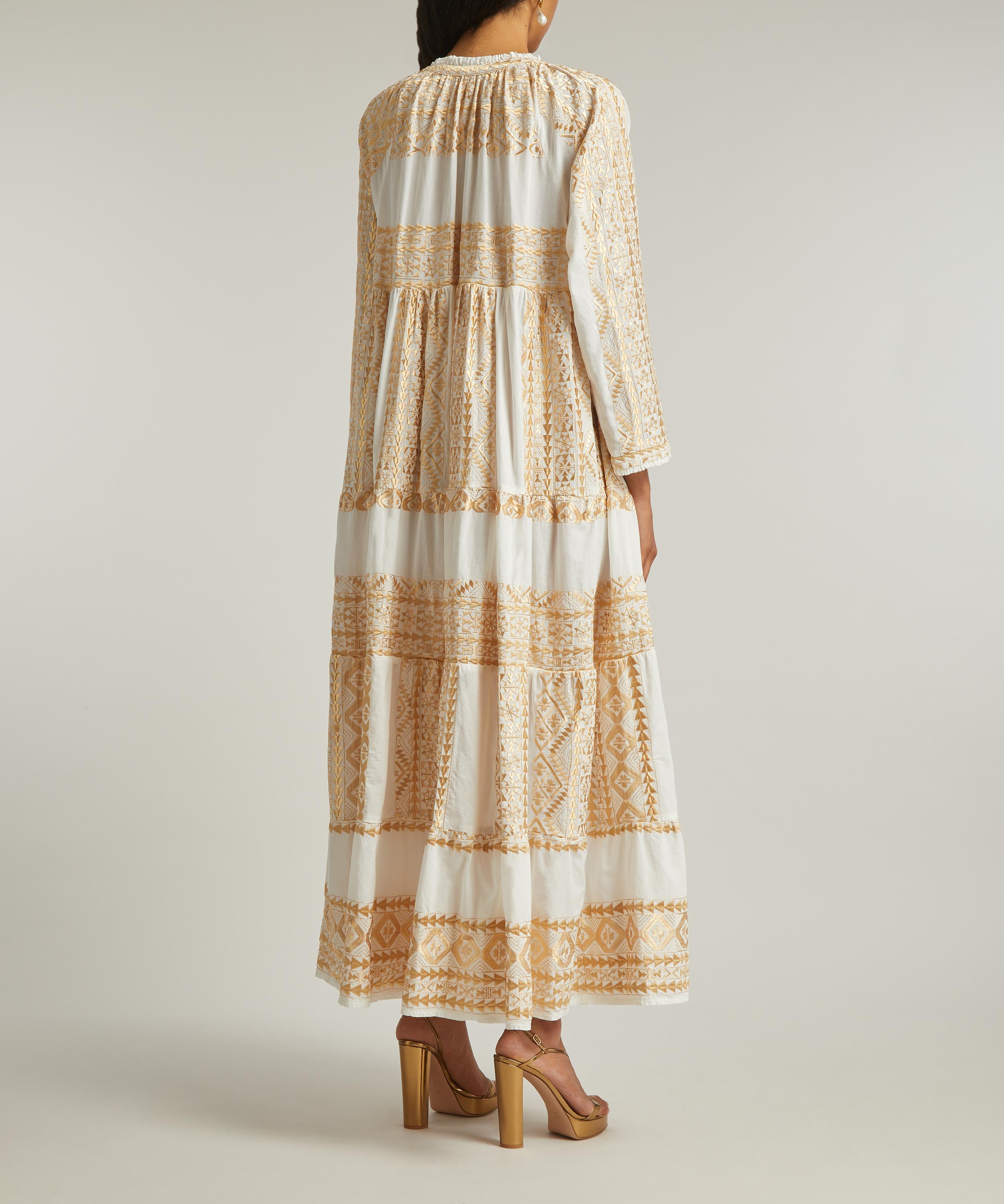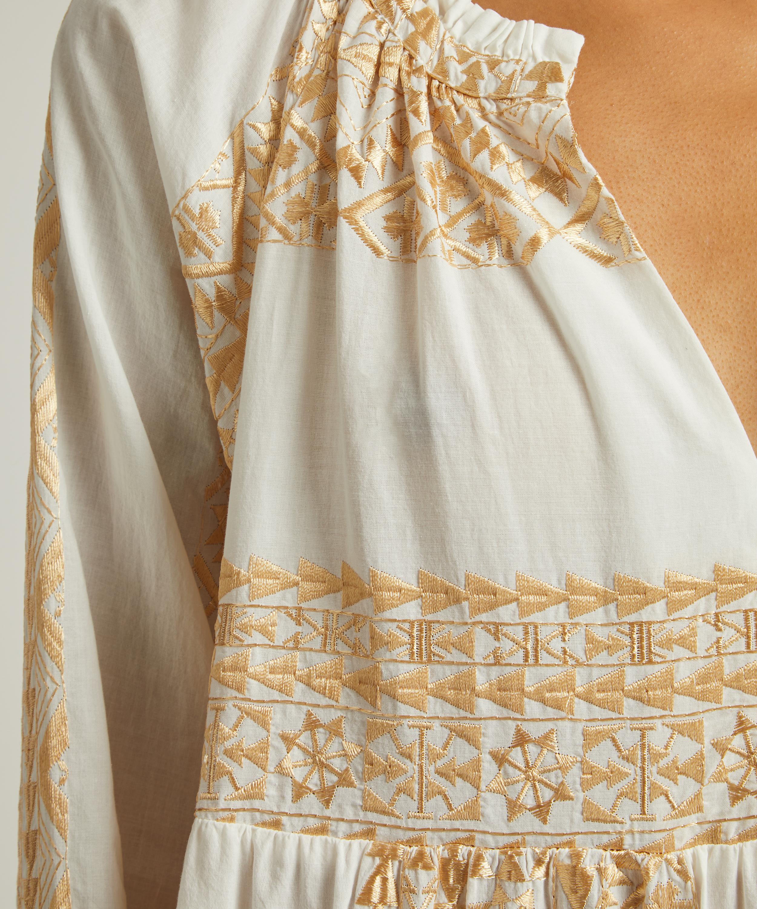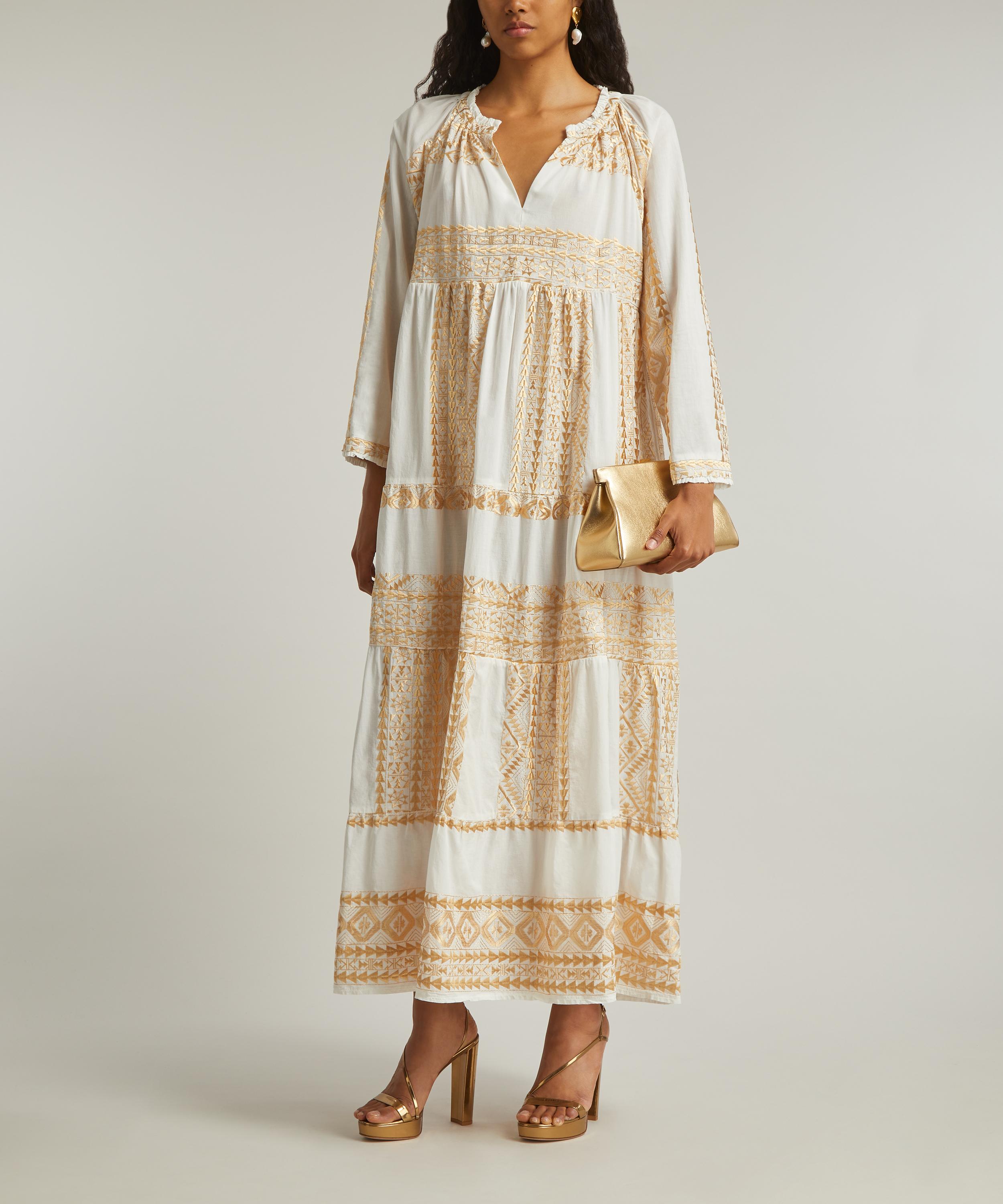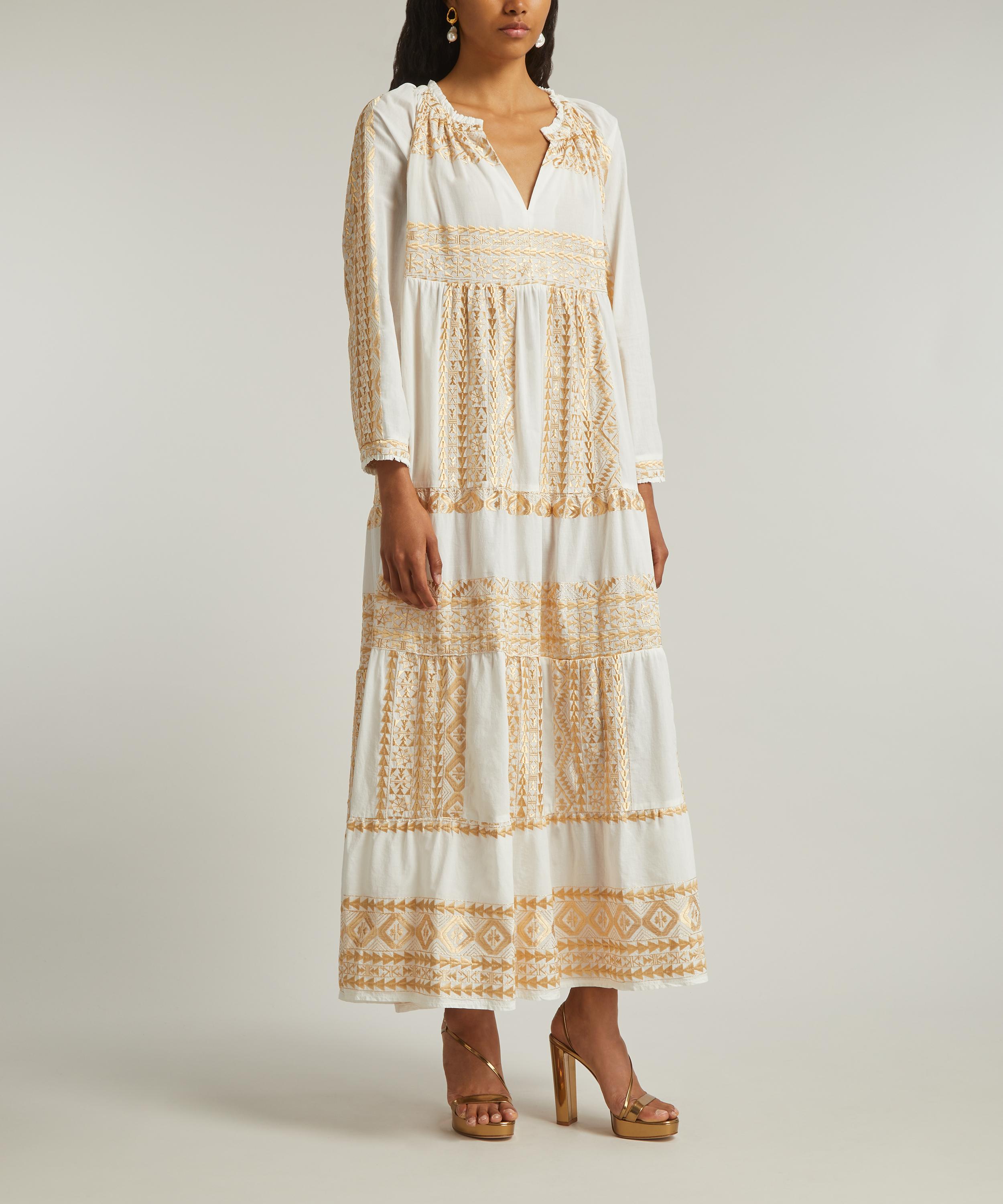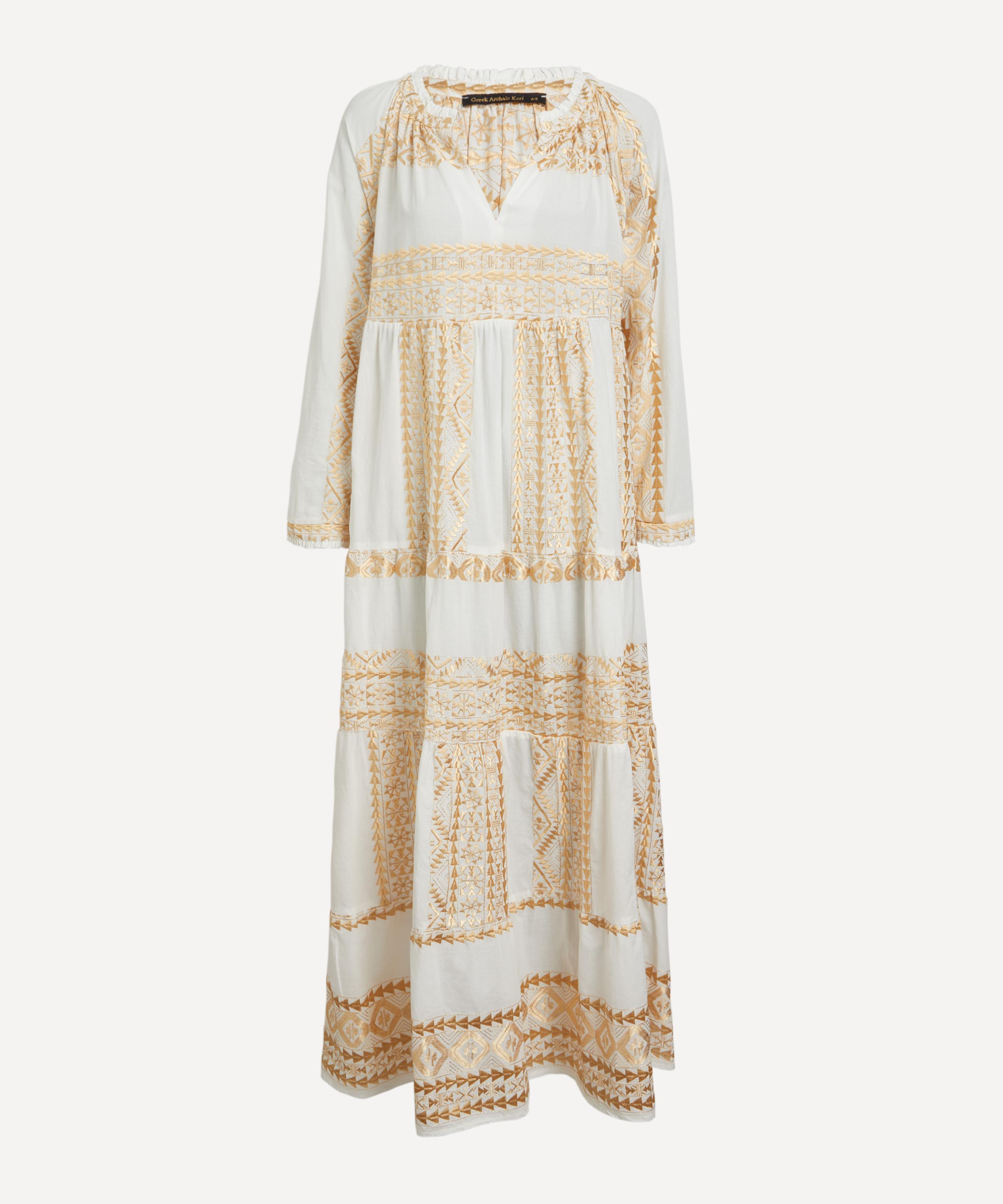Expertly crafted in Greece from pure linen to a long, tiered silhouette, this empire-cut dress features a flattering open V-neckline with a ruffle trim, long cuffed sleeves and a floaty skirt, and is complete with an all-over geometric pattern embroidery.