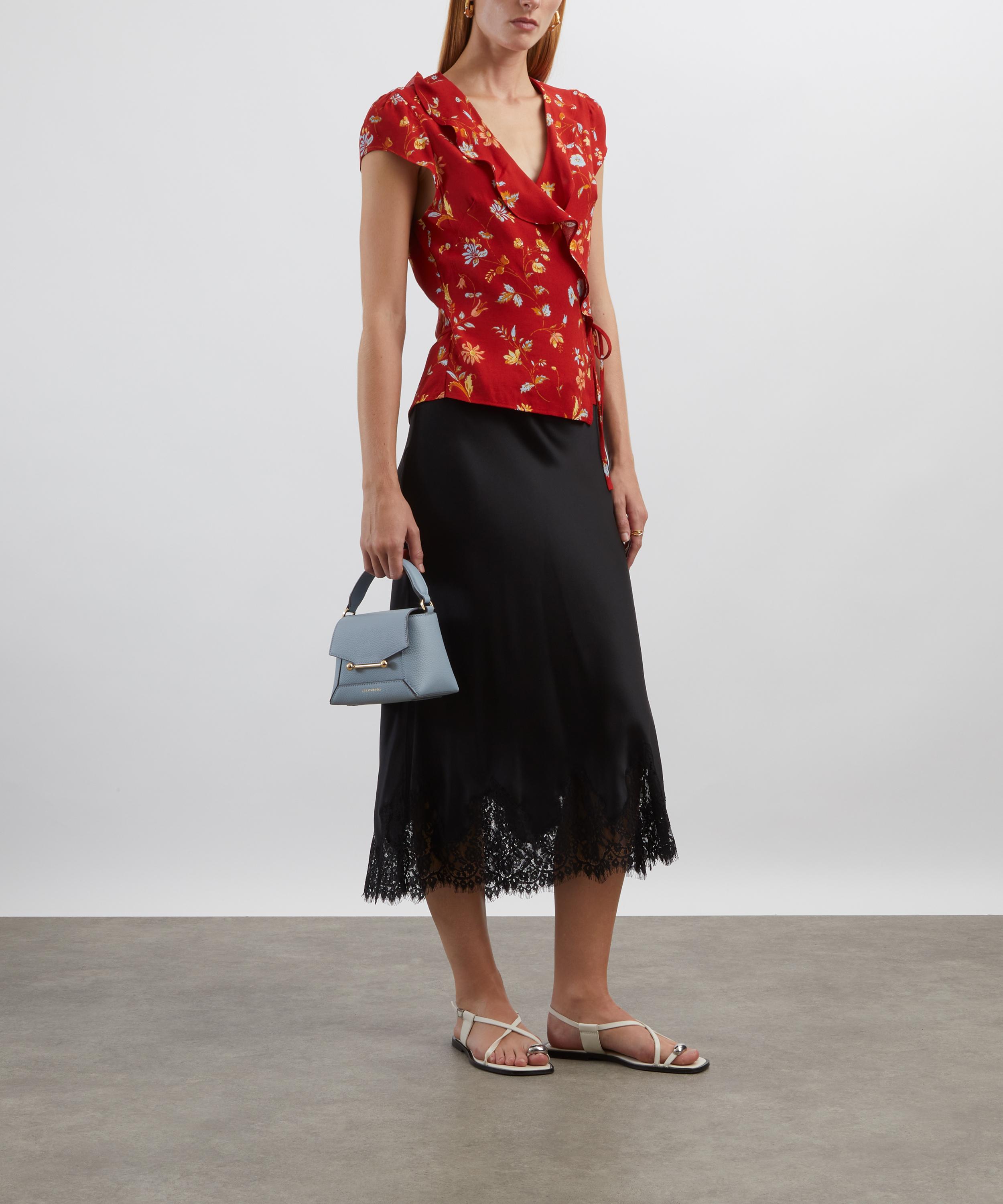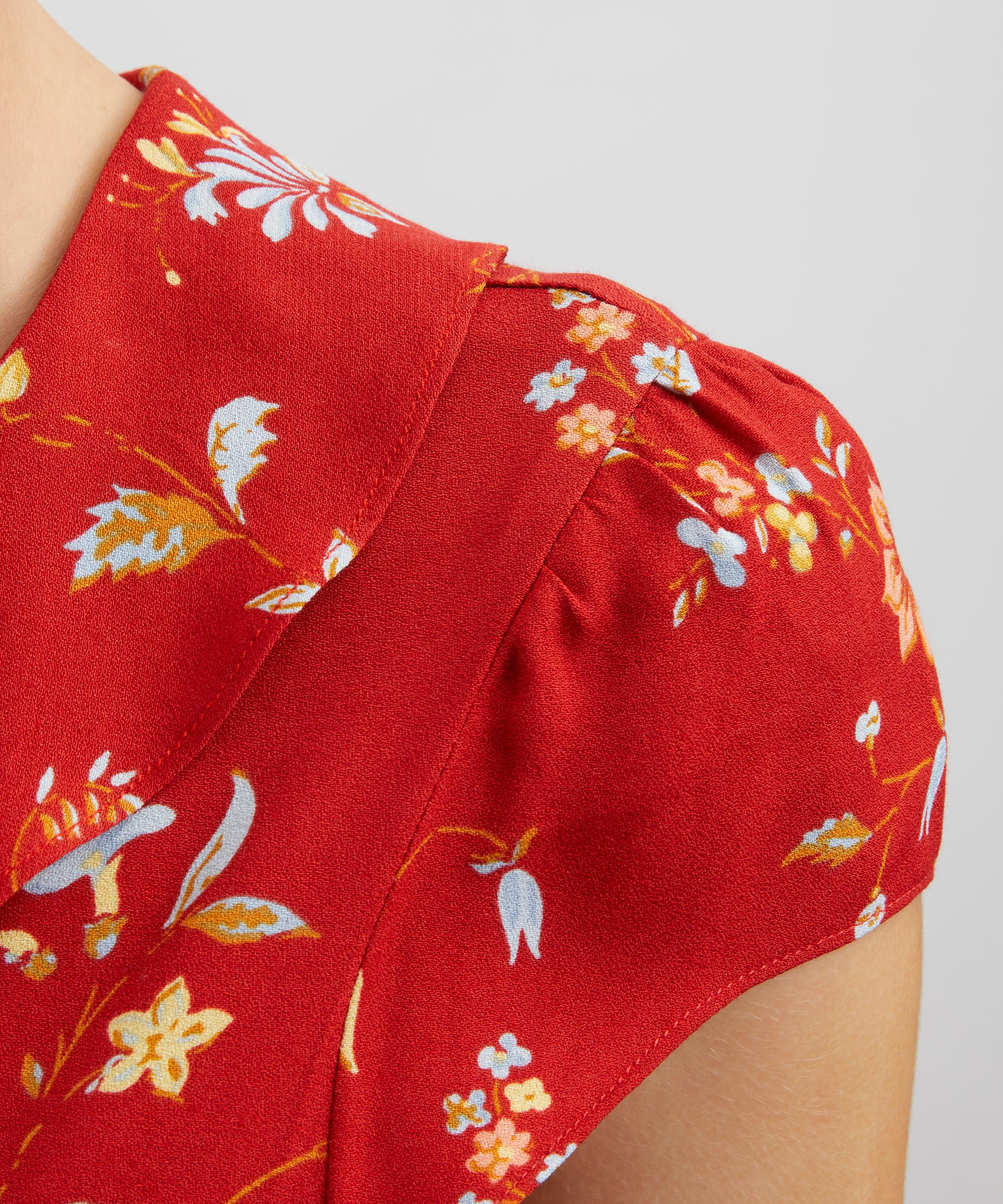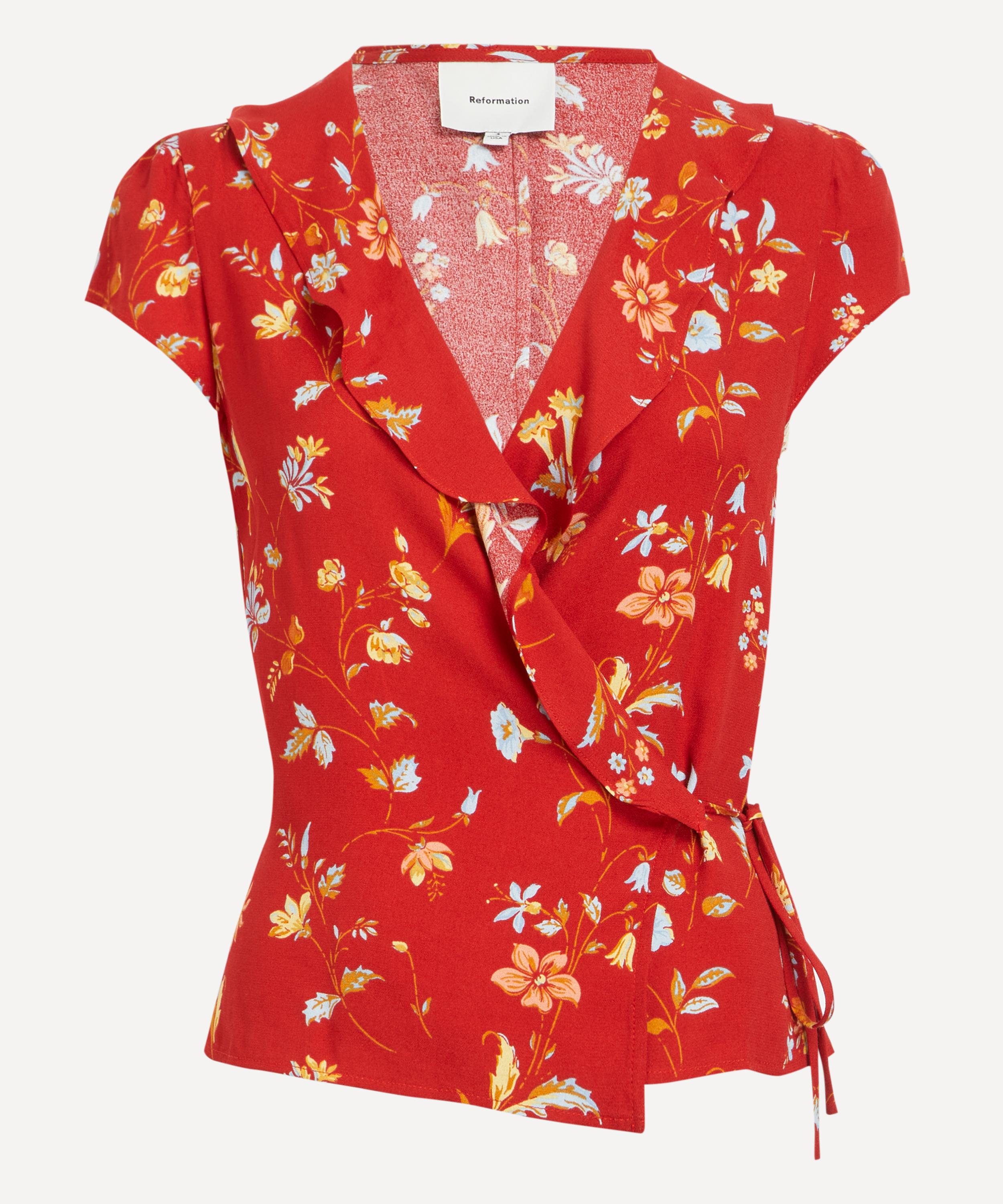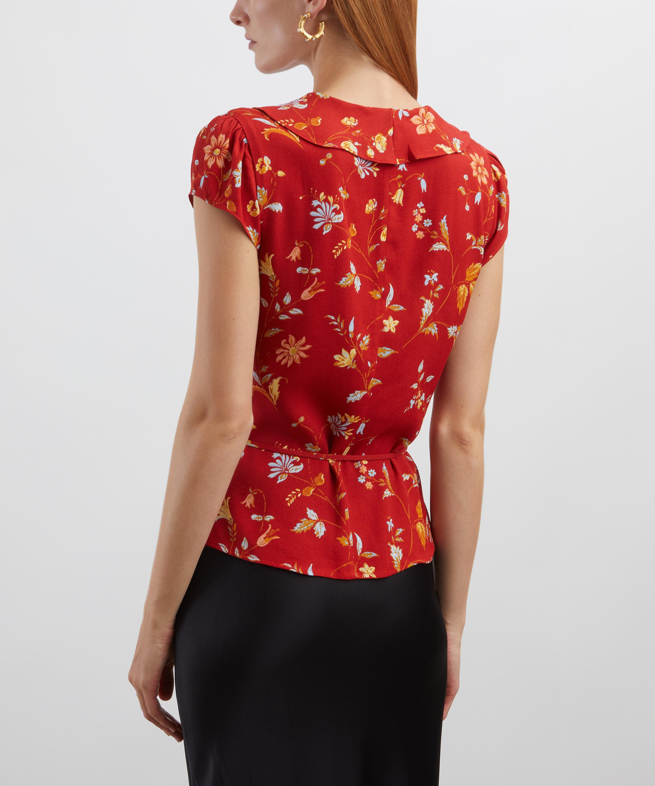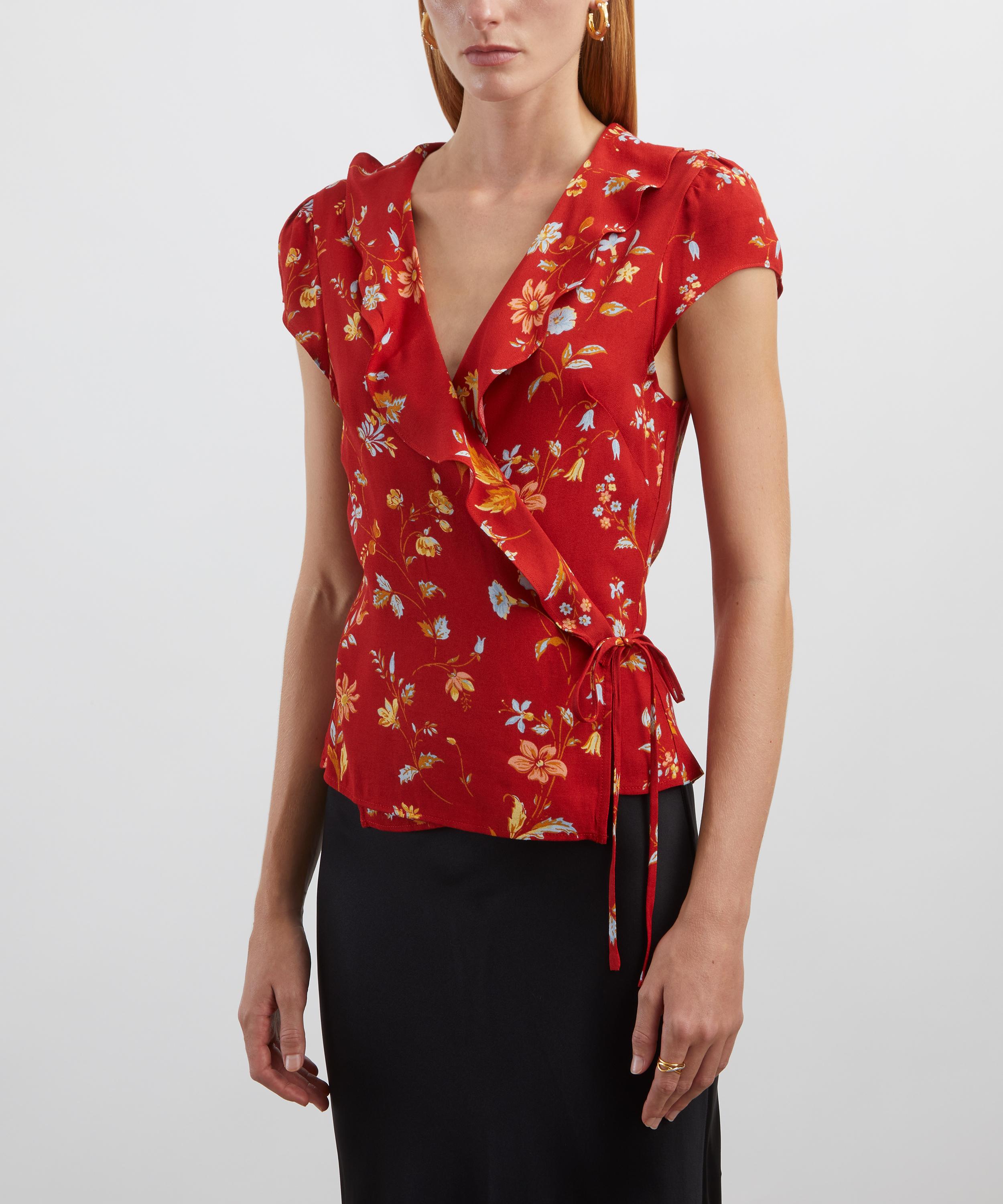 Crafted from lightweight, drapey crepe with a red floral print, the Clemence top is fitted through the bodice and features a ruffled V-neckline, short cap sleeves, and a wrap-over front with tie detailing for a flattering silhouette.