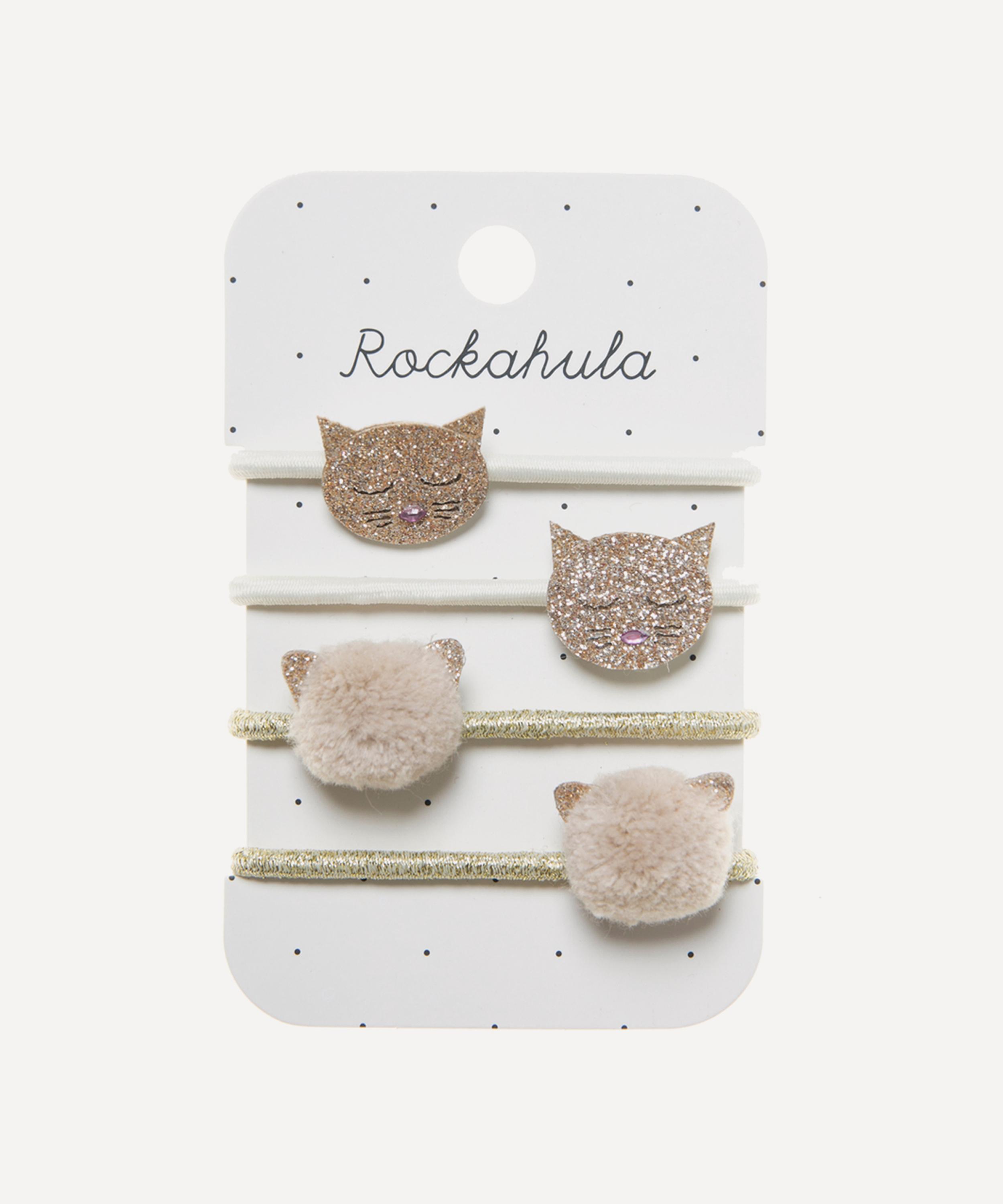 Tie up sections and plait pieces for creative and playful hair styles that will make getting ready fun. These light-hearted hair bobbles come in a set of four with pale pink pompoms and gold-tone glitter cat heads on cream and gold-tone metallic hair ties – exciting embellishment for any child.