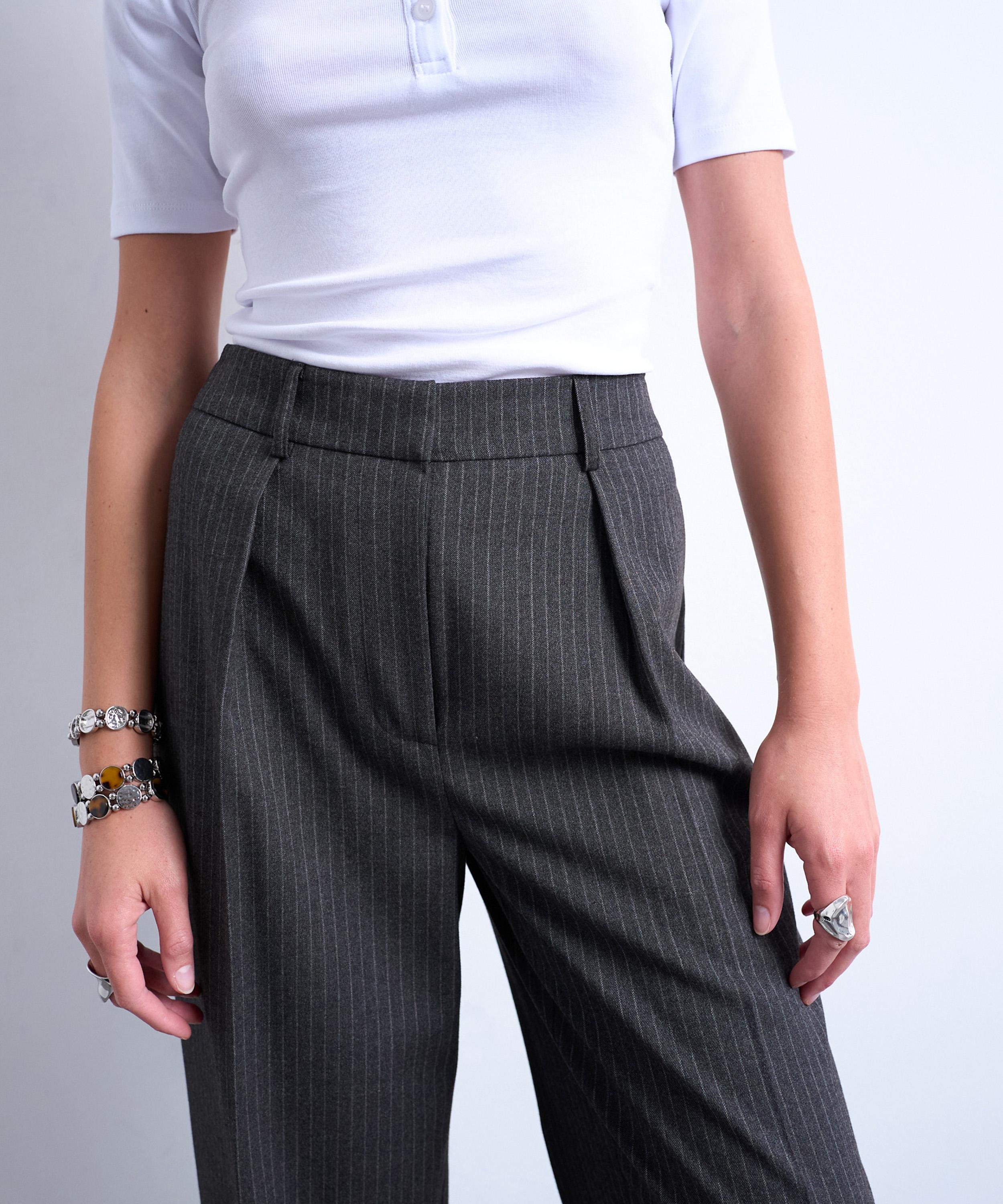 Crafted from a textured woven fabric adorned with a classic pinstripe design, these tailored trousers are designed with a wide-leg silhouette for a flatter, laid-back fit. Complete with belt loops, functional pockets, and a concealed fly, they’re a versatile staple suited for both work and play.