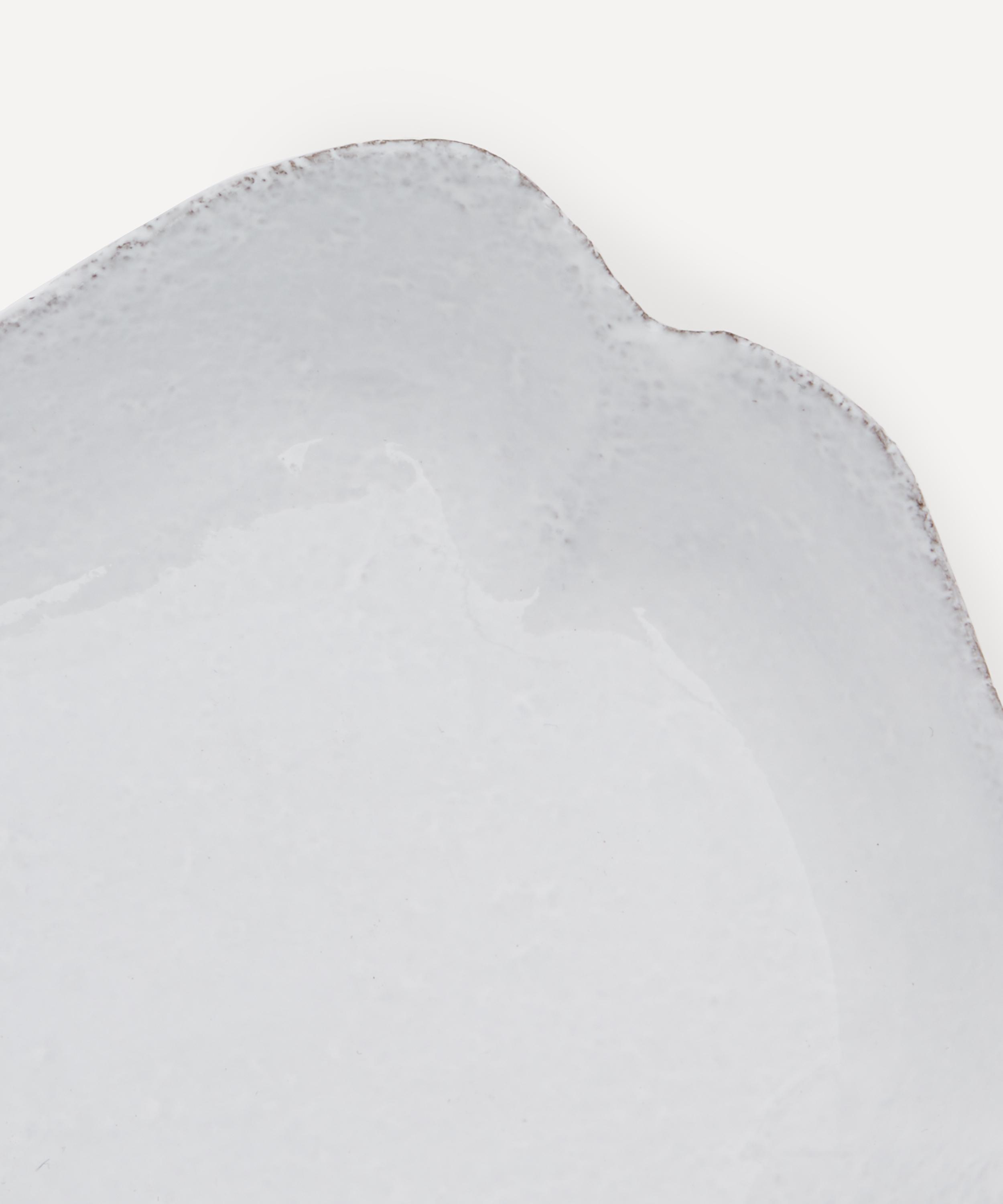 Votary of pre-industrial fabrication, Astier de Villatte is celebrated for being the one and only studio in Paris to hold and harbour the traditions of artisanal ceramic production. Restoring the ancestral systems of moulding and stamping, this dish is made using techniques from the Middle Ages which involve moulding a sheet of handmade clay, double firing the ‘biscuit’ piece and glazing the product in white enamel – a lengthy process that requires a drying time of up to one month. Characterised by a scalloped rim, exposed clay and subtle indentations, the dish is engraved with the brand’s signature crest - depicting an interlacing A & V - alongside the initials of one of the 40 master artisans who created it. Arrange with other serveware from the collection to breathe an air of authenticity into your table setting.