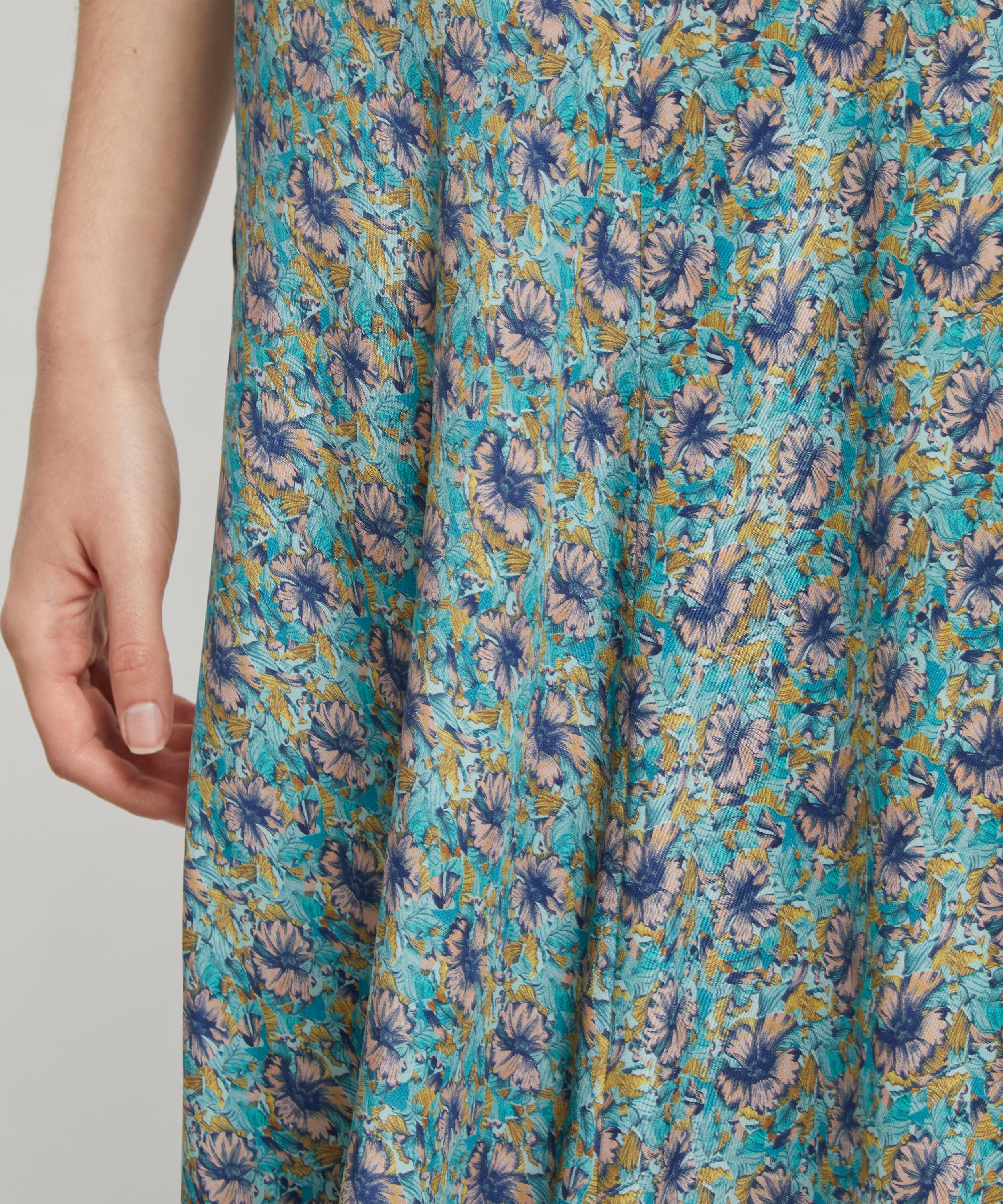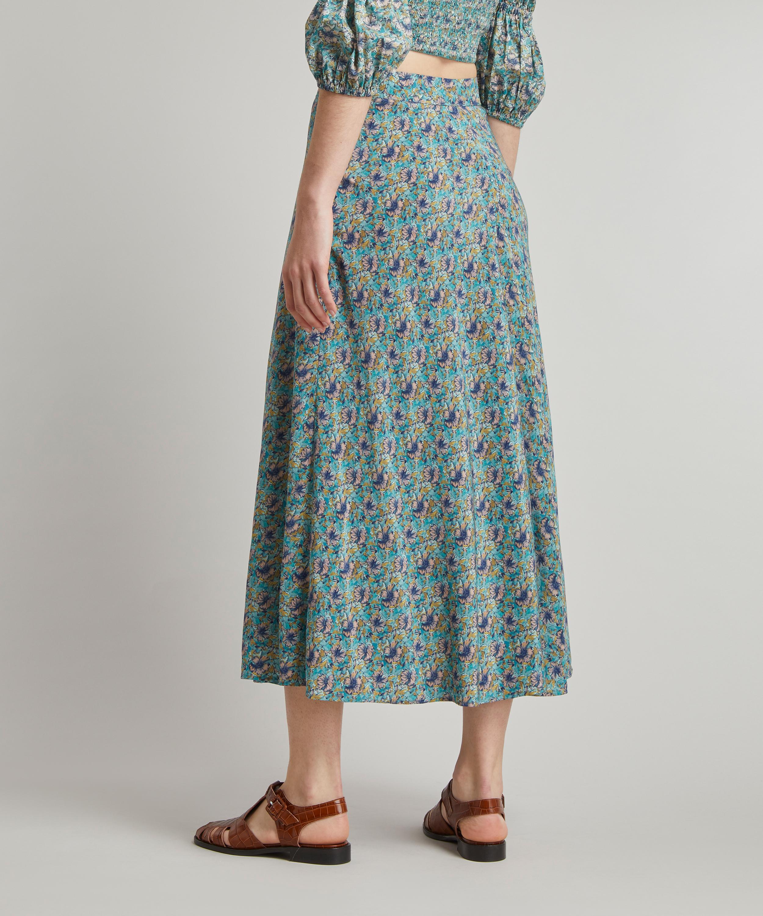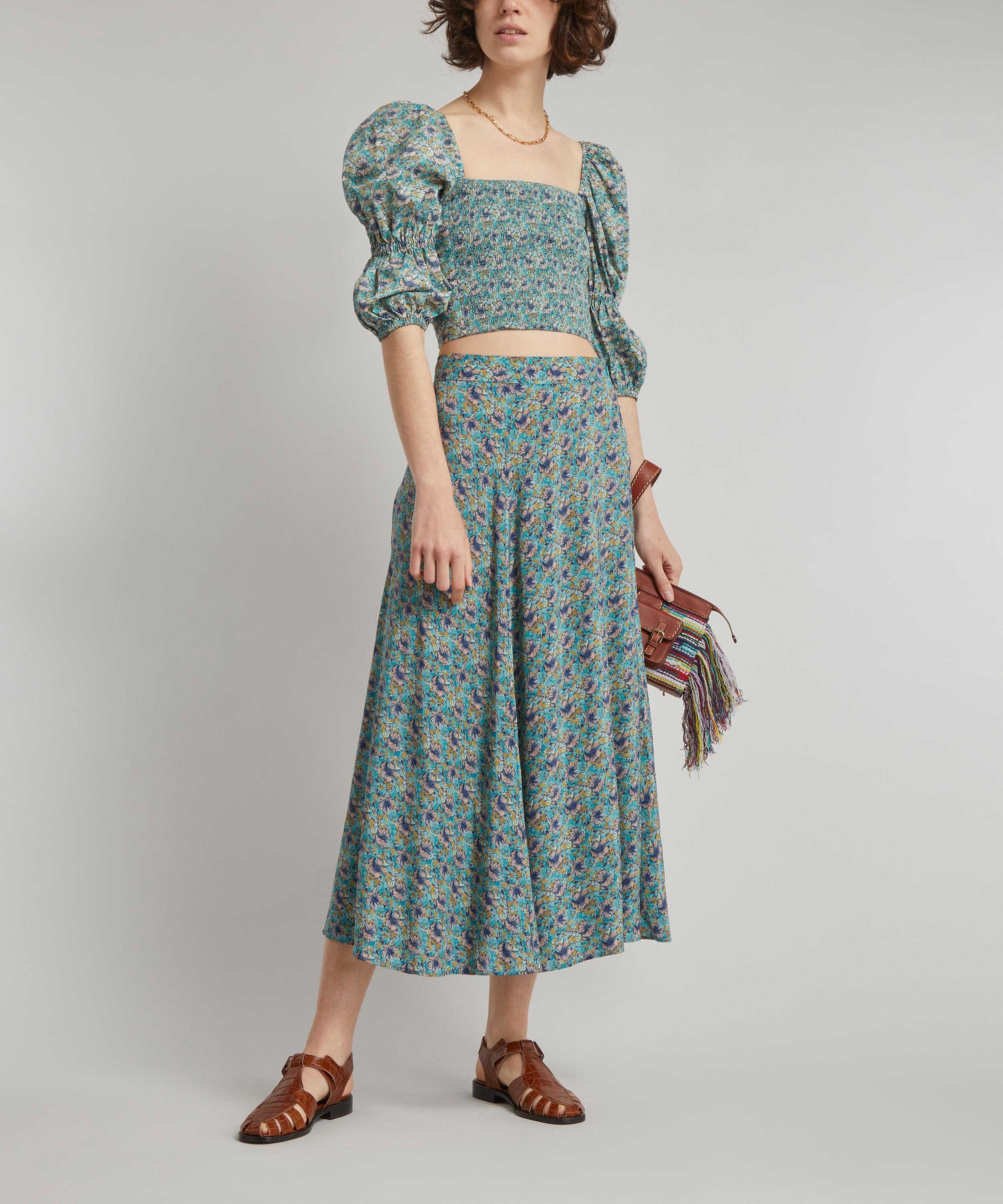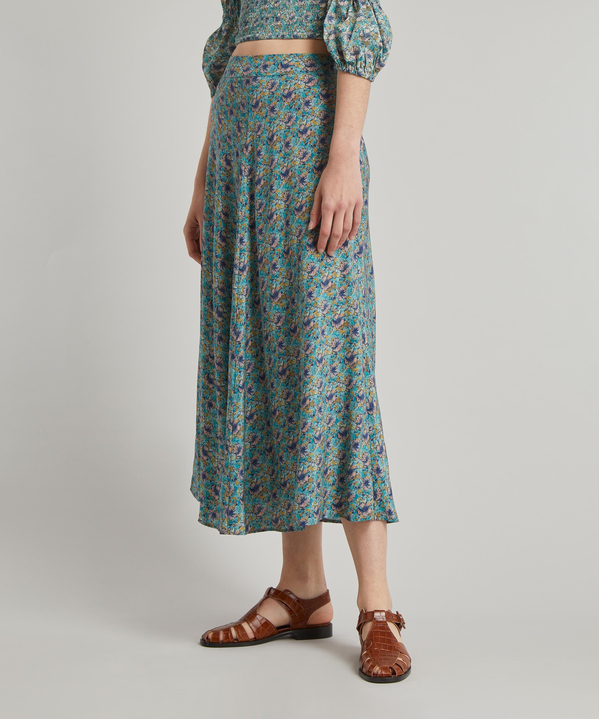 Designed in Australia and crafted from pure silk for a luxurious feel, the Collage Field skirt is embossed with the charming Liberty Fabrics’ Collage Field print – originally inspired by a piece of artwork created by the Liberty studio in the early 1990’s, this design portrays an abstract representation of mallow flowers surrounded by ornate foliage. Tailored to a loose midi-length, it has an elegant bias-cut circle silhouette skirt, giving it an effortless, flowy finish. Wonderfully whimsy, pair it with the matching Collage Field Liberty top and strappy sandals for a chic finish to your everyday edit.