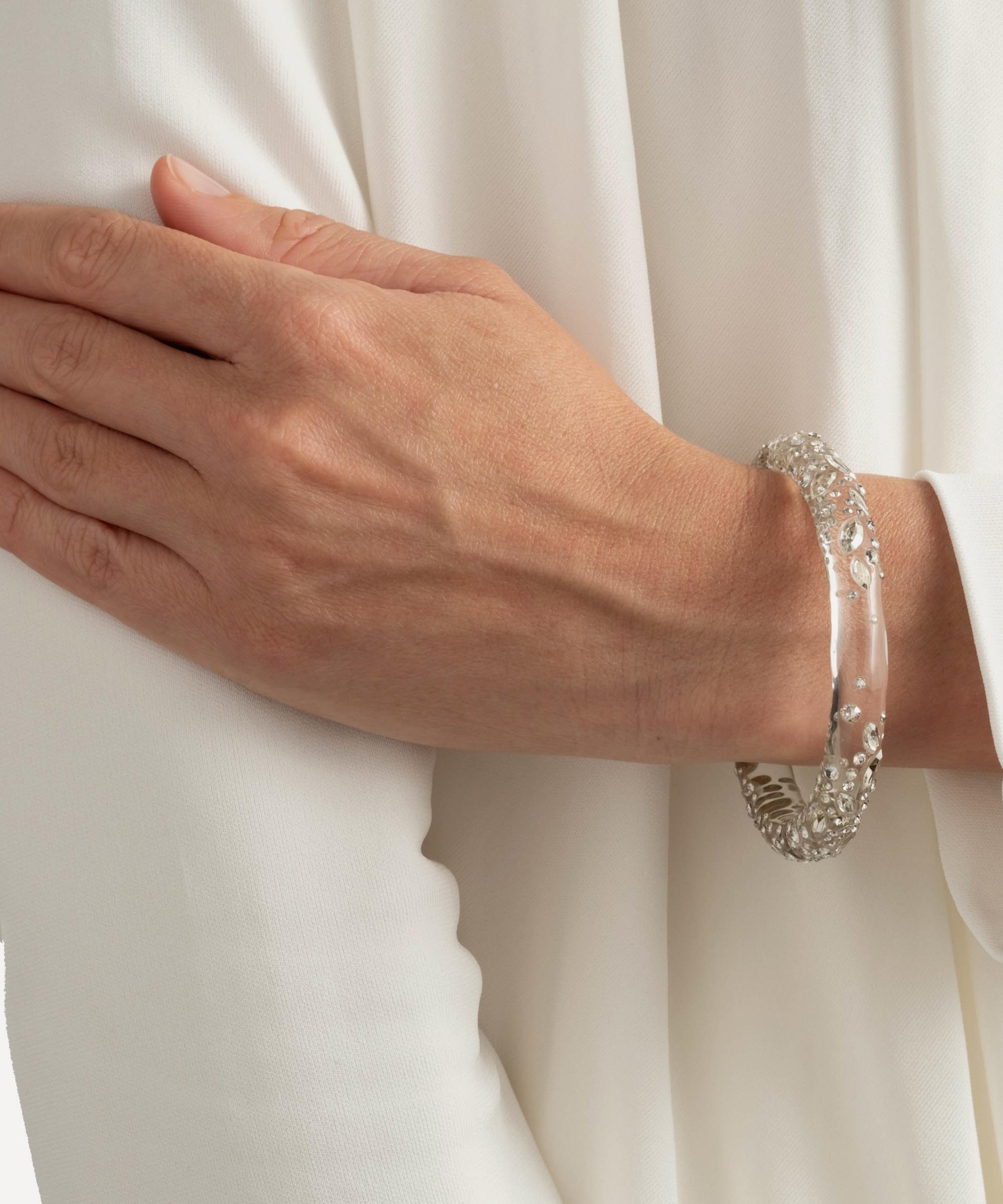 Exemplifying the label’s eponymous Lucite design, this bangle bracelet by Alexis Bittar will take your edit to new heights. This highly contemporary piece is crafted from hand-sculpted clear Lucite, accented with a high-polished finish – for a reflective watery lustre – and custom cut crystals atop rhodium-plated brass. Style it solo, or team it with other bangles.