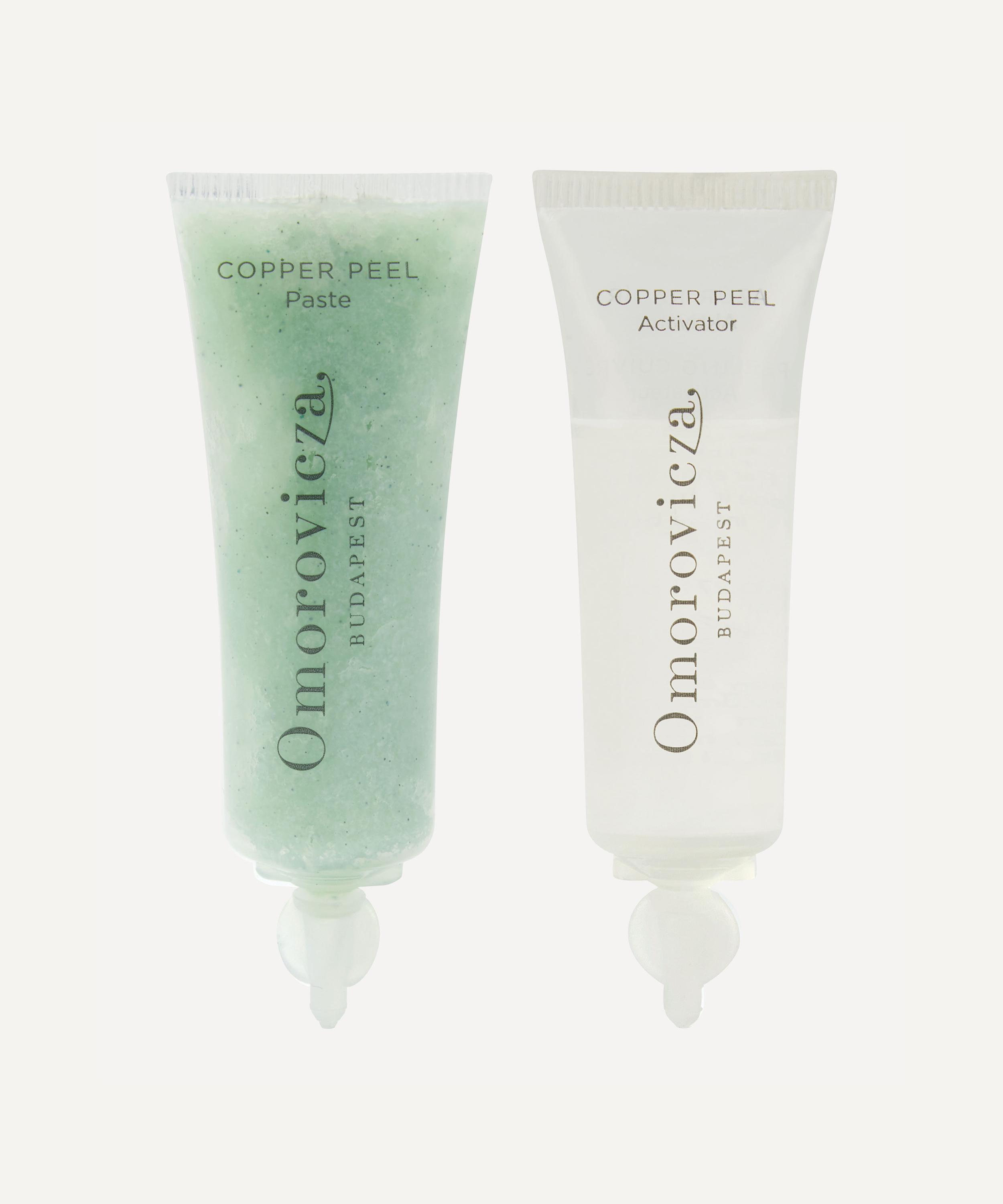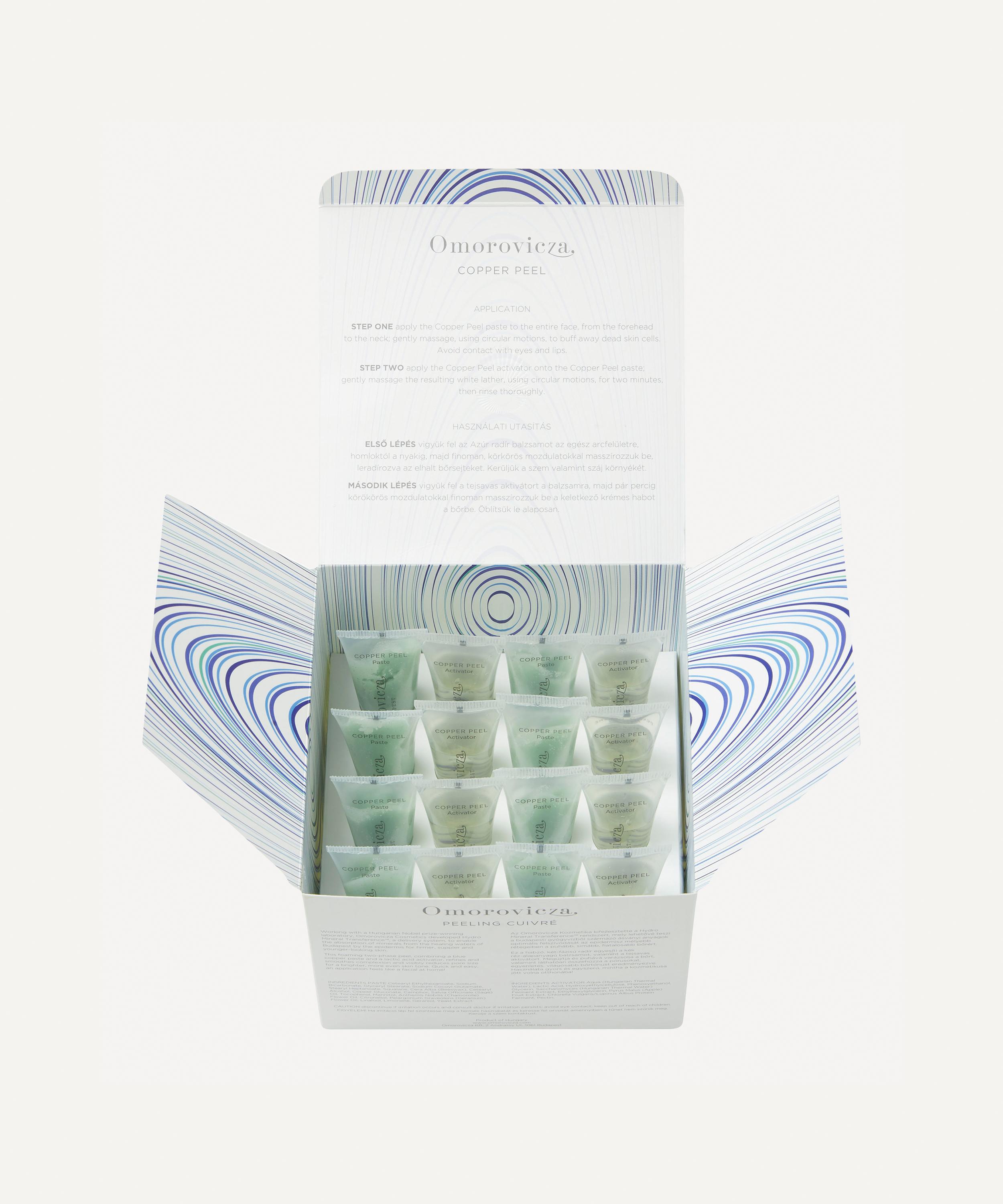 This foaming two-phase Omorvicza face peel combines a blue copper paste and a lactic acid activator, to polish and smooth the complexion and visibly reduce pore size for a brighter, more even skin tone.