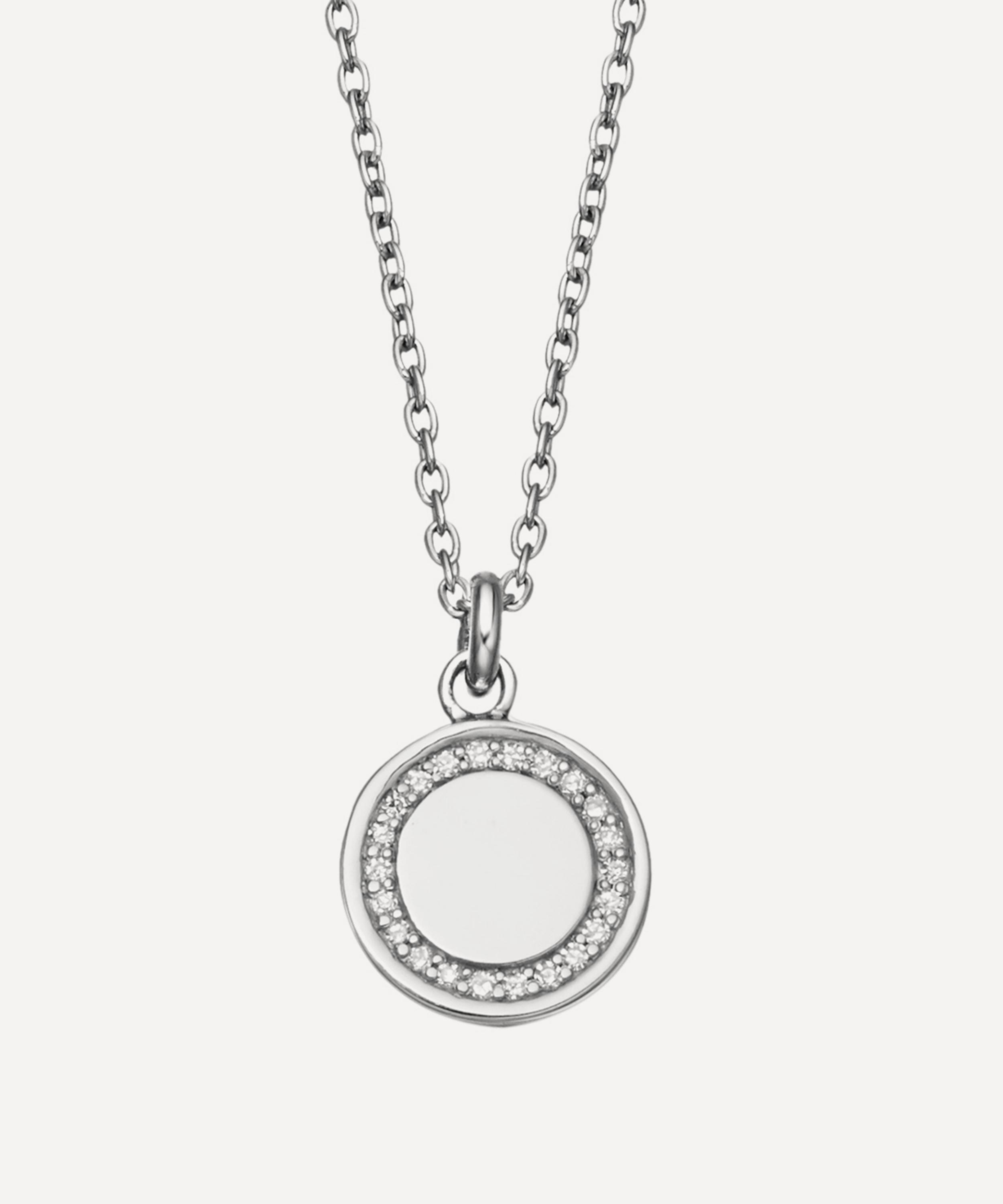 Showcasing the brand's signature Cosmos symbol that represents infinity, this delicate chain necklace features a small, engravable disc pendant with glittering pavé white sapphire edging. Perfect for gifting or adding to your own collection, style it with a cascading curation of layered gold chains or a coordinating Biography friendship bracelet for a subtly symbolic finish.