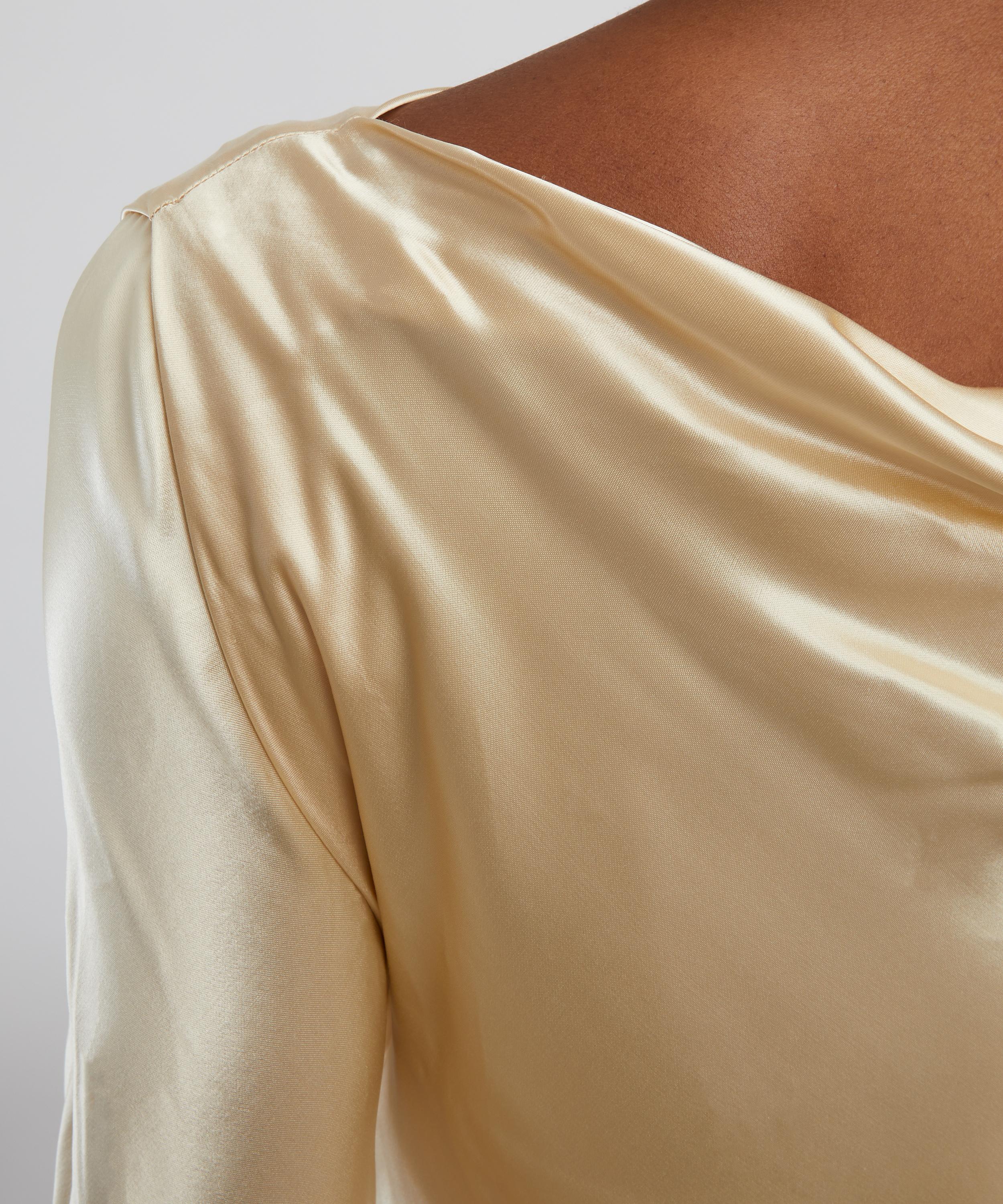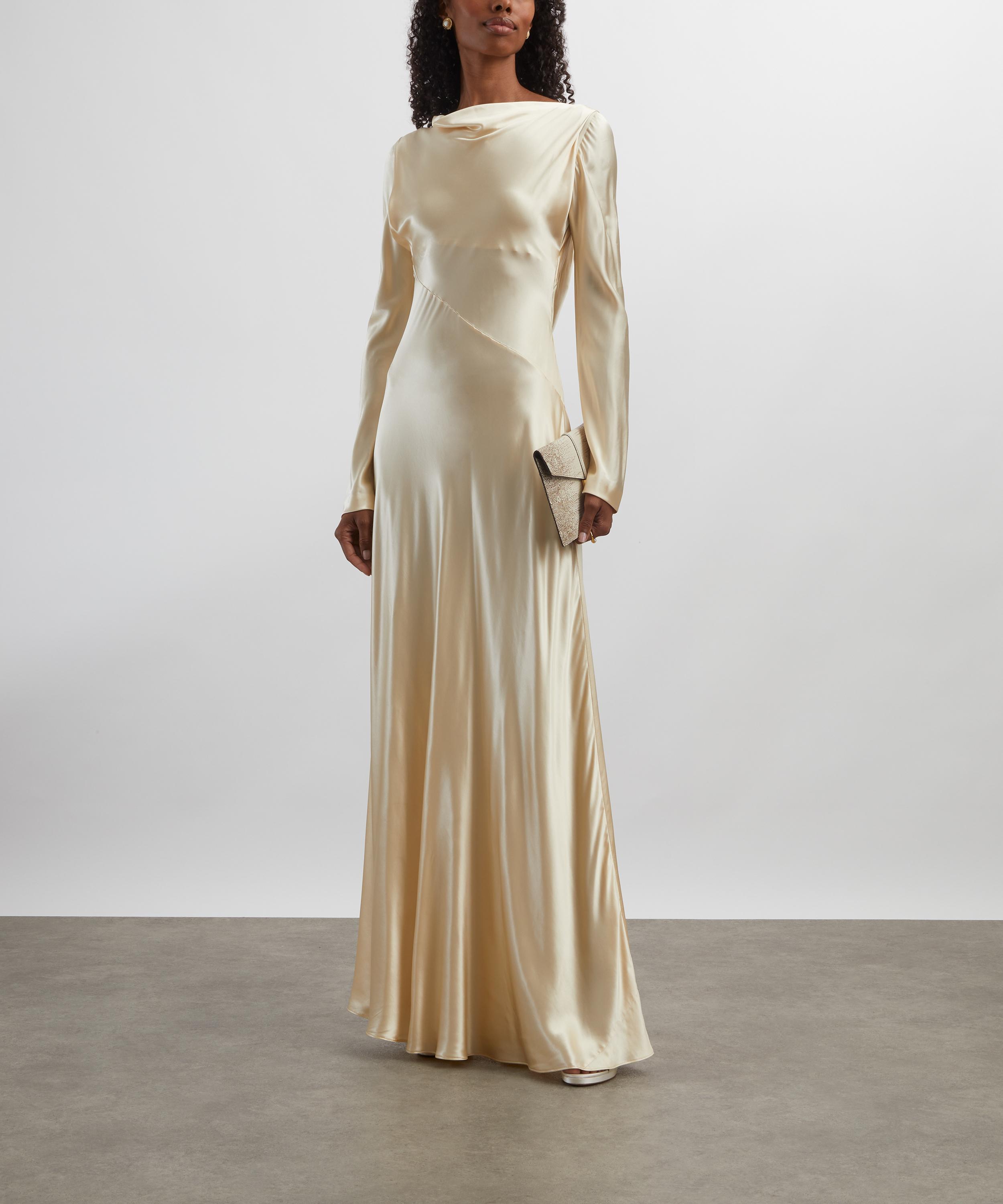With its sleek satin finish and artful construction, this floor-length dress exudes timeless Italian elegance. Graceful draping and a fluid silhouette define this elegant piece, enhanced by a softly cascading cowl neckline and long sleeves that add refined coverage. Cut on the bias, the triangular waist seam skims the body with a flattering, figure-enhancing flow.