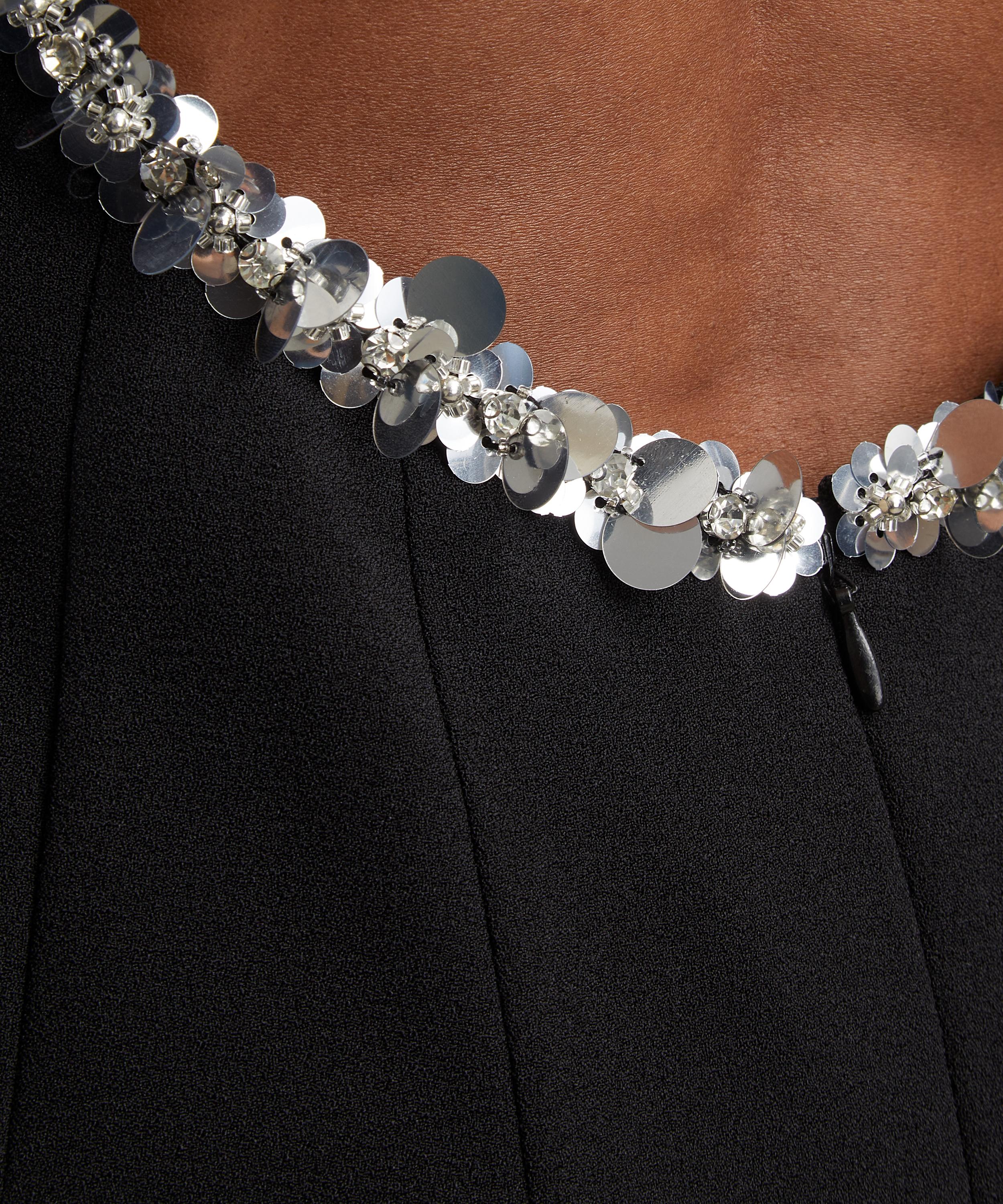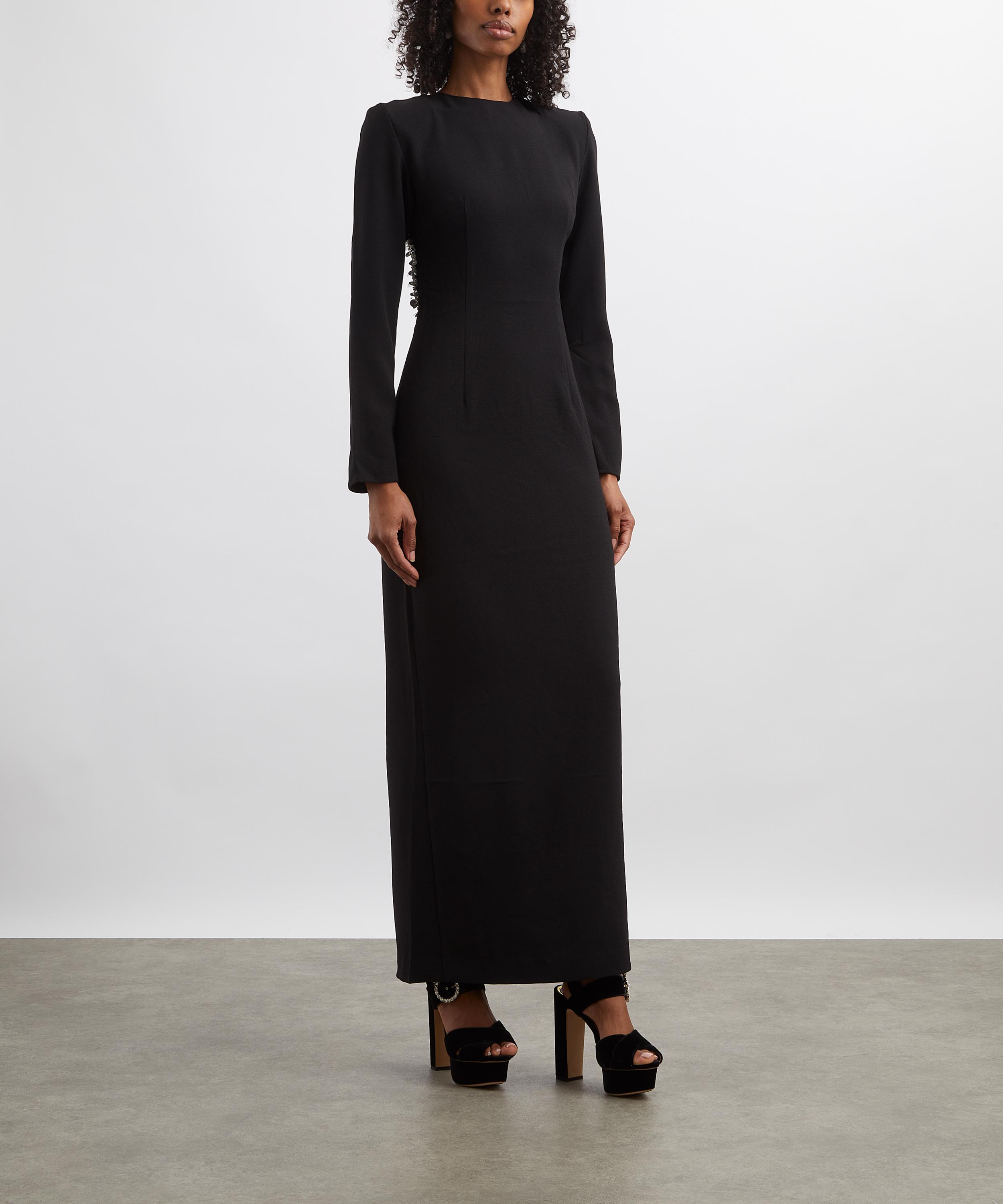Cut from black crepe, this fitted maxi dress stuns with structured shoulders, long sleeves, and an open back framed by delicate crystal embellishments.