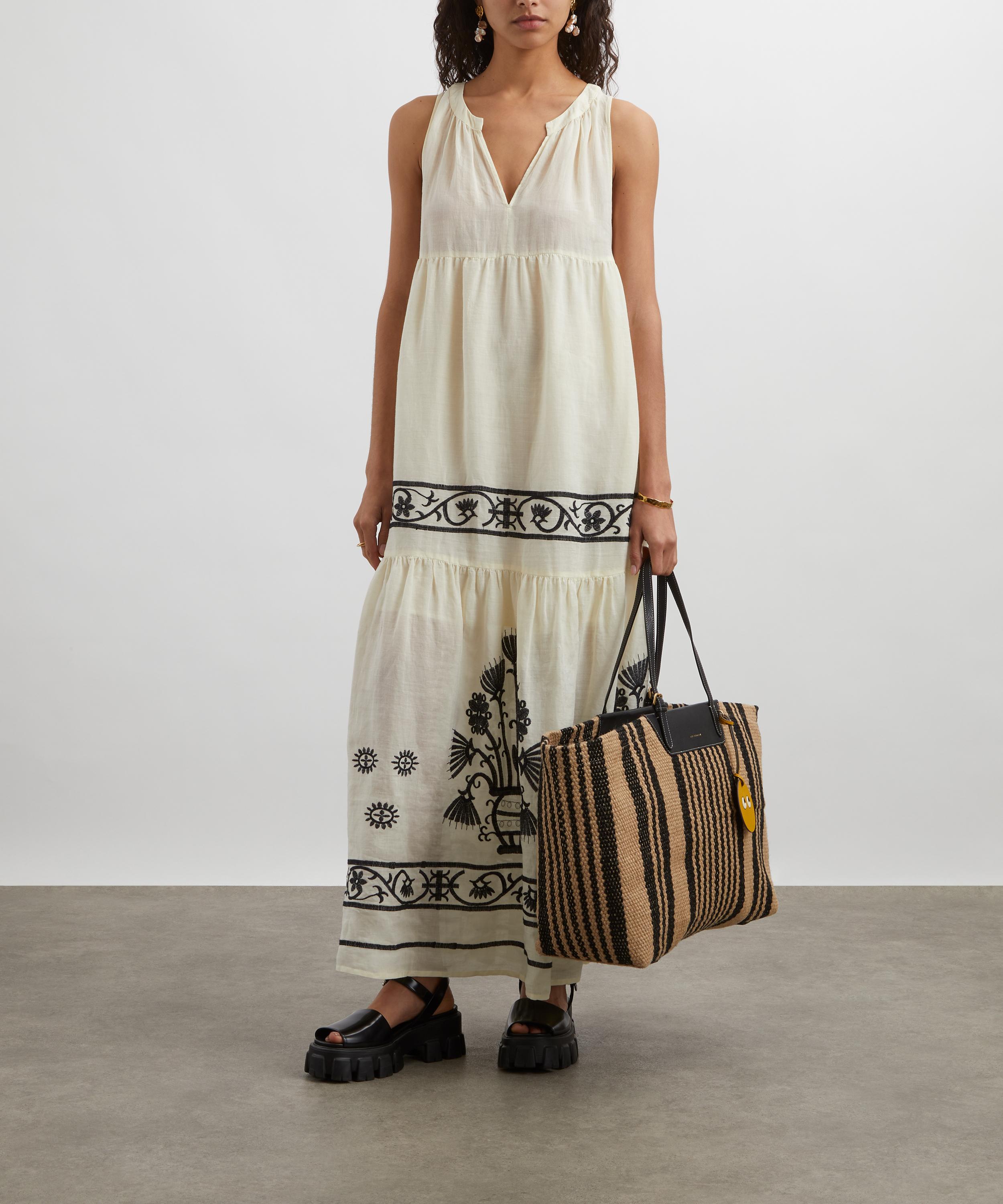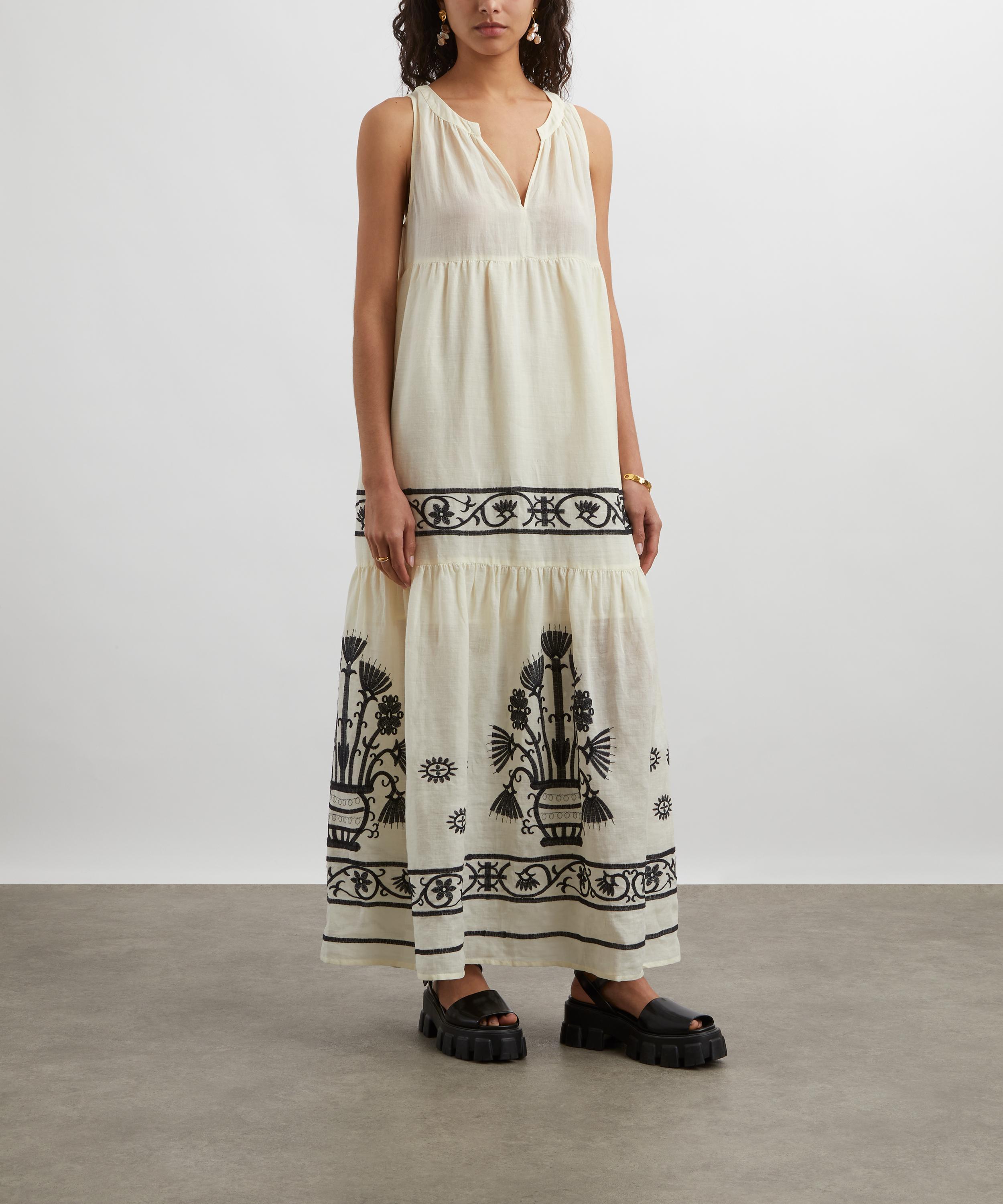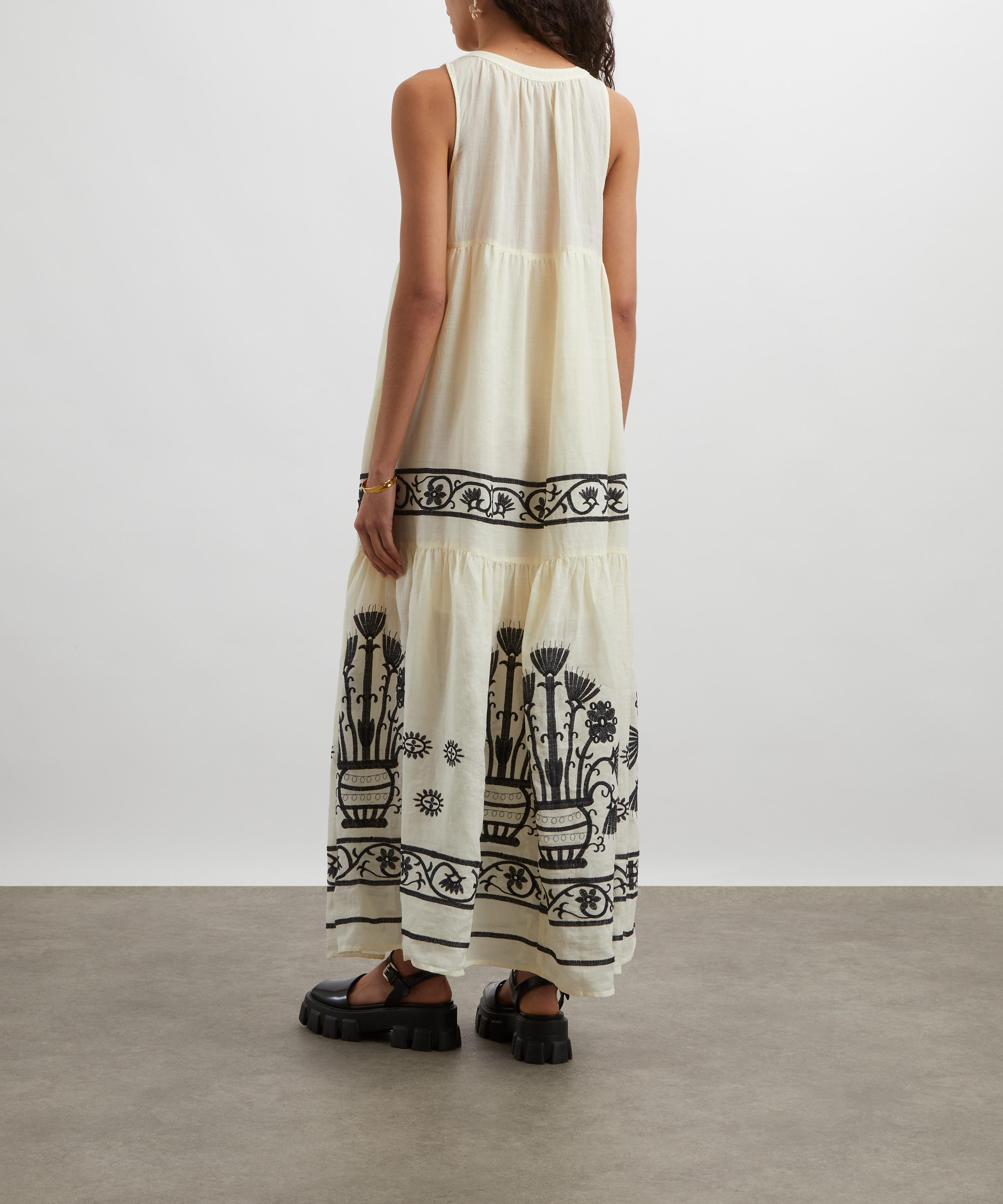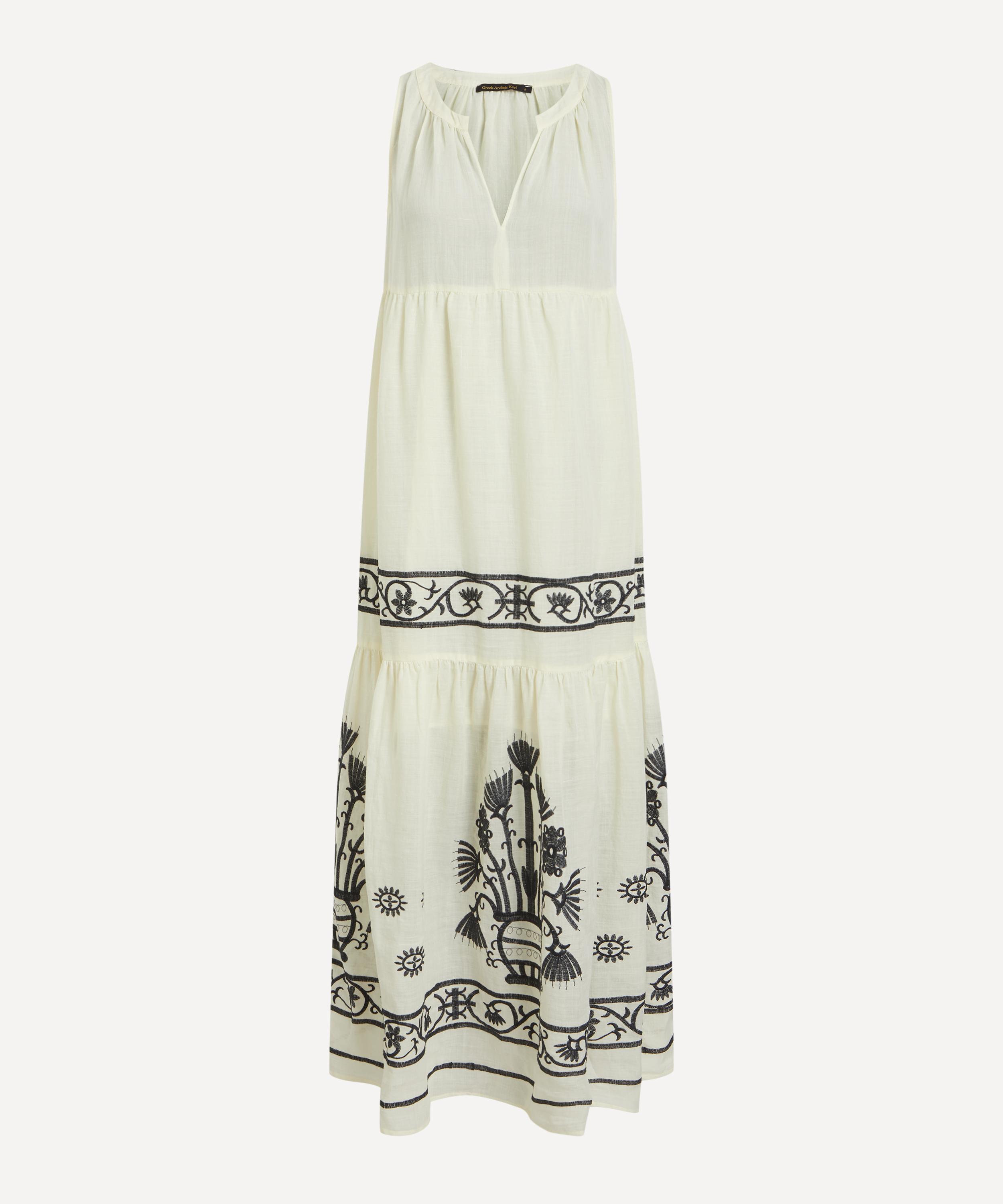 The Crete Embroidered Sleeveless Tiered Dress by Athenian label Greek Archaic Kori infuses your new-season wardrobe with the sun-drenched elegance of the Mediterranean.