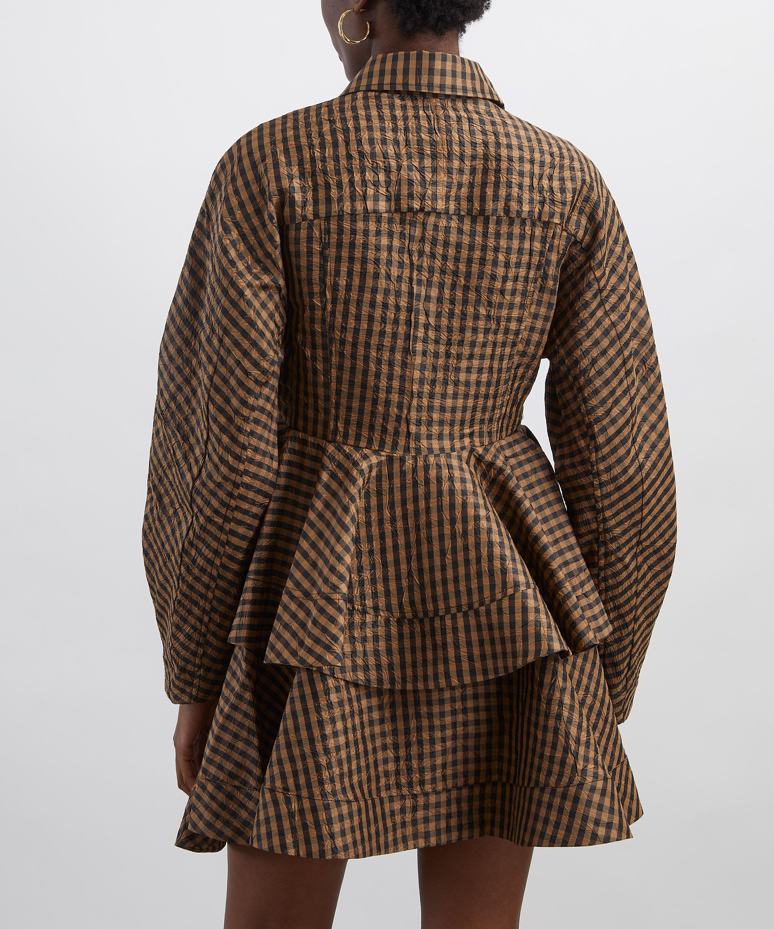 Cut from a crinkled brown check fabric, this long-sleeve shirt is defined by its peplum silhouette. Pair it with the coordinating Crinkled Check Mini Circle Skirt for an effortlessly preppy, chic look.