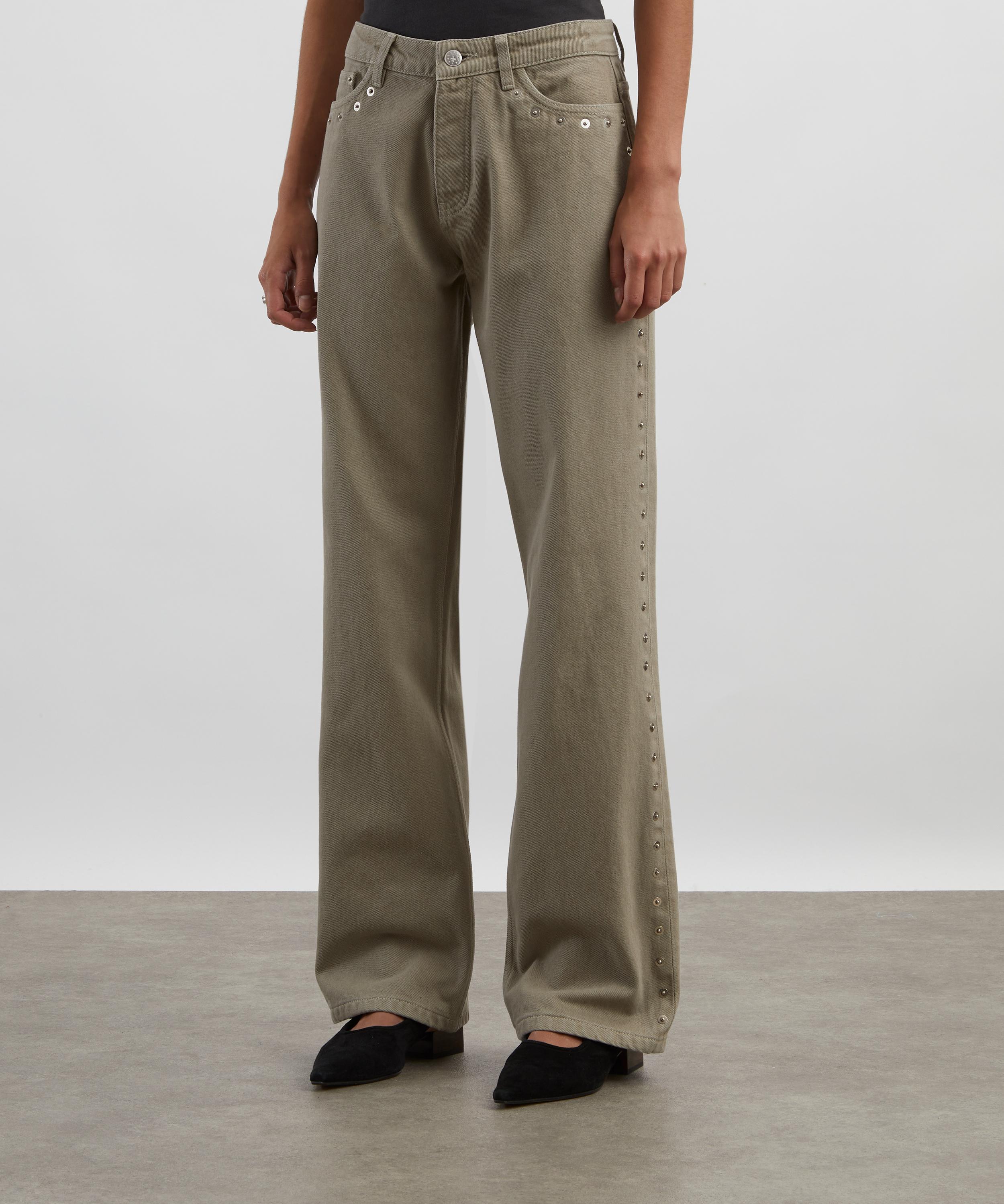 Crafted from cotton denim, the Crowd Trousers feature a low-rise, loose-fit silhouette accented with studded detailing along the sides, adding a bold, vintage-inspired edge.