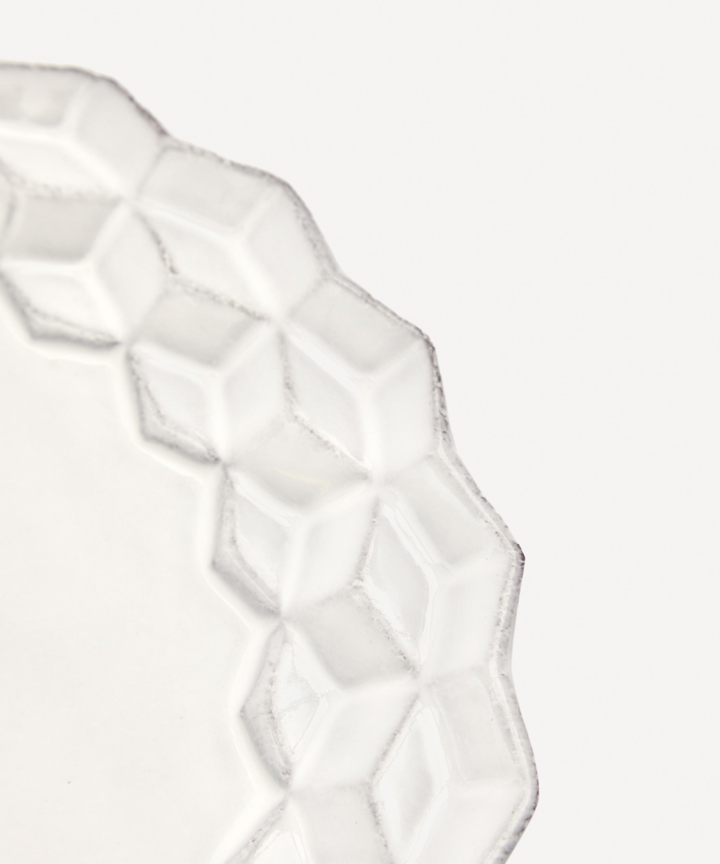 Votary of pre-industrial fabrication, Astier de Villatte is celebrated for being the one and only studio in Paris to hold and harbour the traditions of artisanal ceramic production. Restoring the ancestral systems of moulding and stamping, the Cube side plate is made using handcrafting techniques from the Middle Ages which involve moulding a handmade sheet of clay, double firing the ‘biscuit’ piece and glazing the product in white enamel – a lengthy process that involves a drying time of up to one month. Its repeating structure evokes the geometry of the natural world, from honeycomb sheets to turtle shells and minute cell formations. Each handmade piece tells a beautiful story, it romances and imparts a sense of nostalgia into its owner. Arrange with other glazed plates in the collection to breathe an air of authenticity into your dining collection.