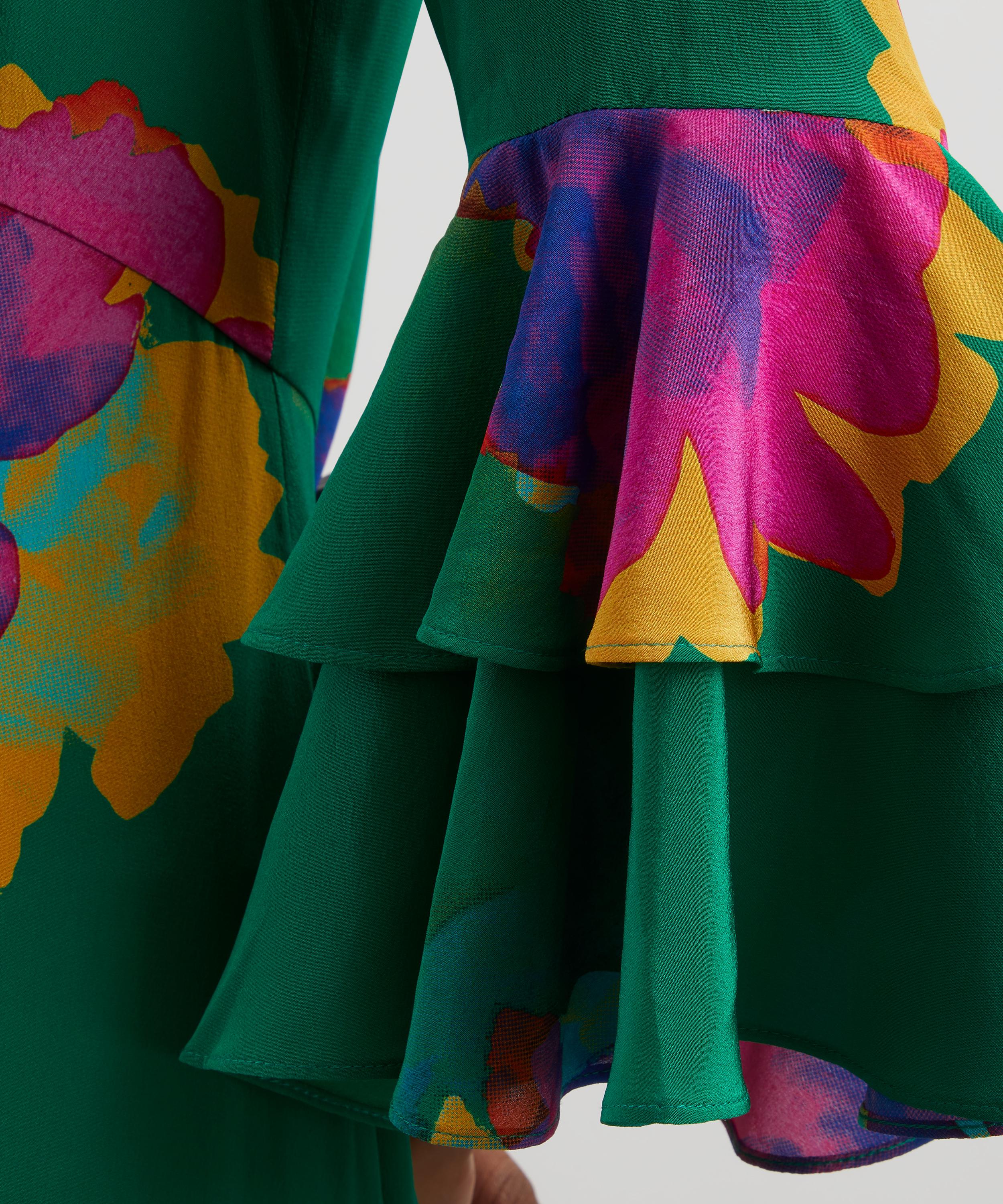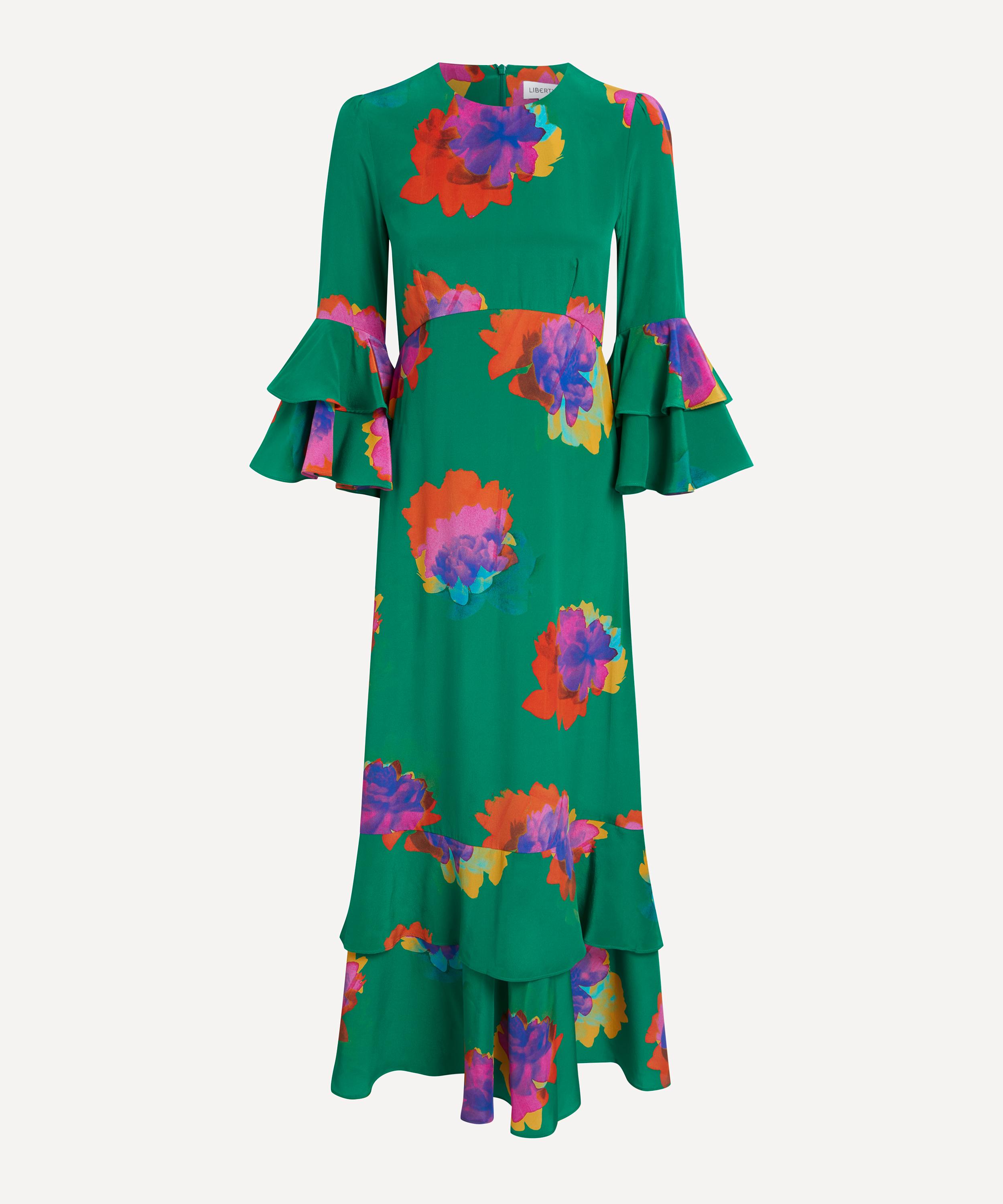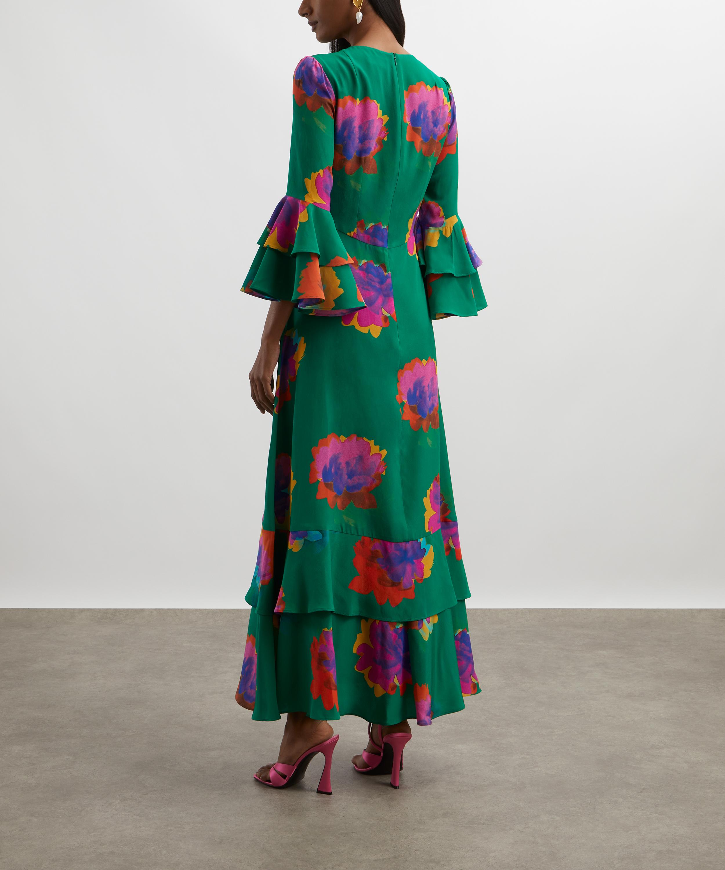 Flourishing with screen-printed florals, this best-selling style is updated for the new season in our captivating Cunningham print. Cut from luscious silk crepe de chine, this sleek maxi dress is designed to fit and flatter all shapes with its elegant empire waistline, and sweeping A-line skirt. A true statement piece, its flouncy pagoda sleeves and tiered hem add a playful touch.