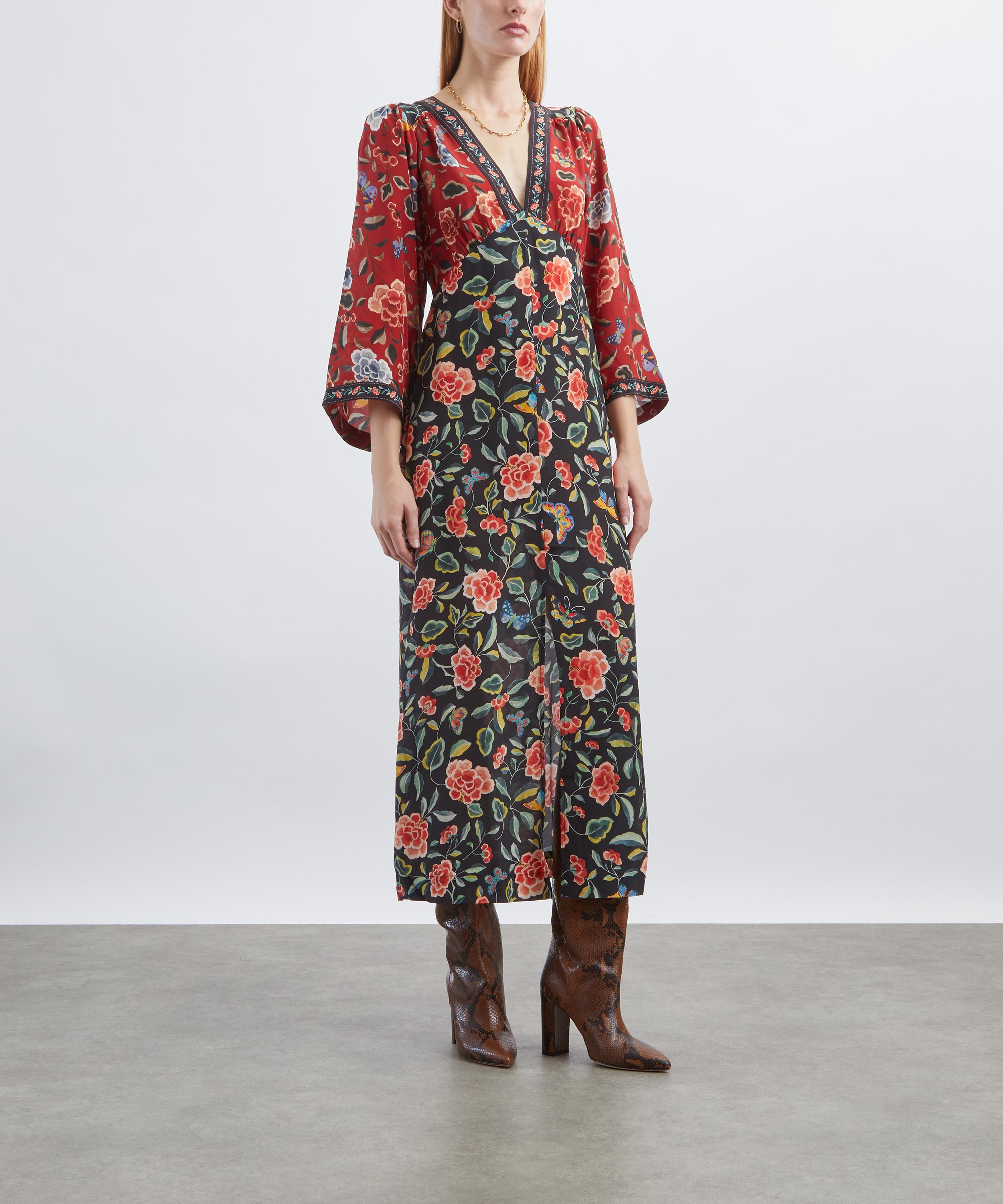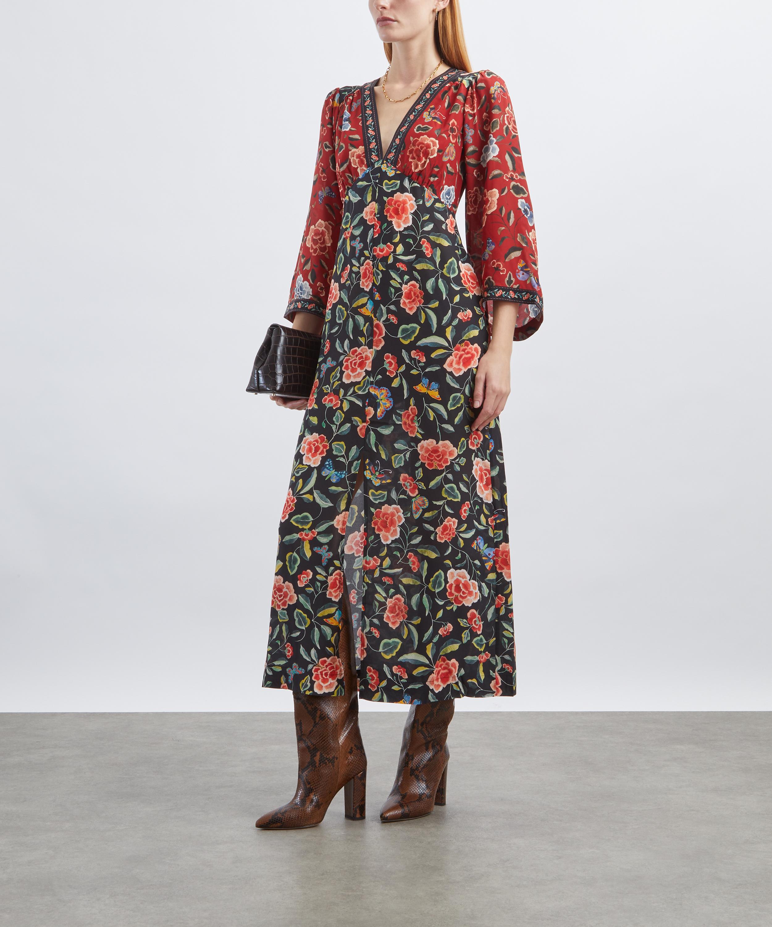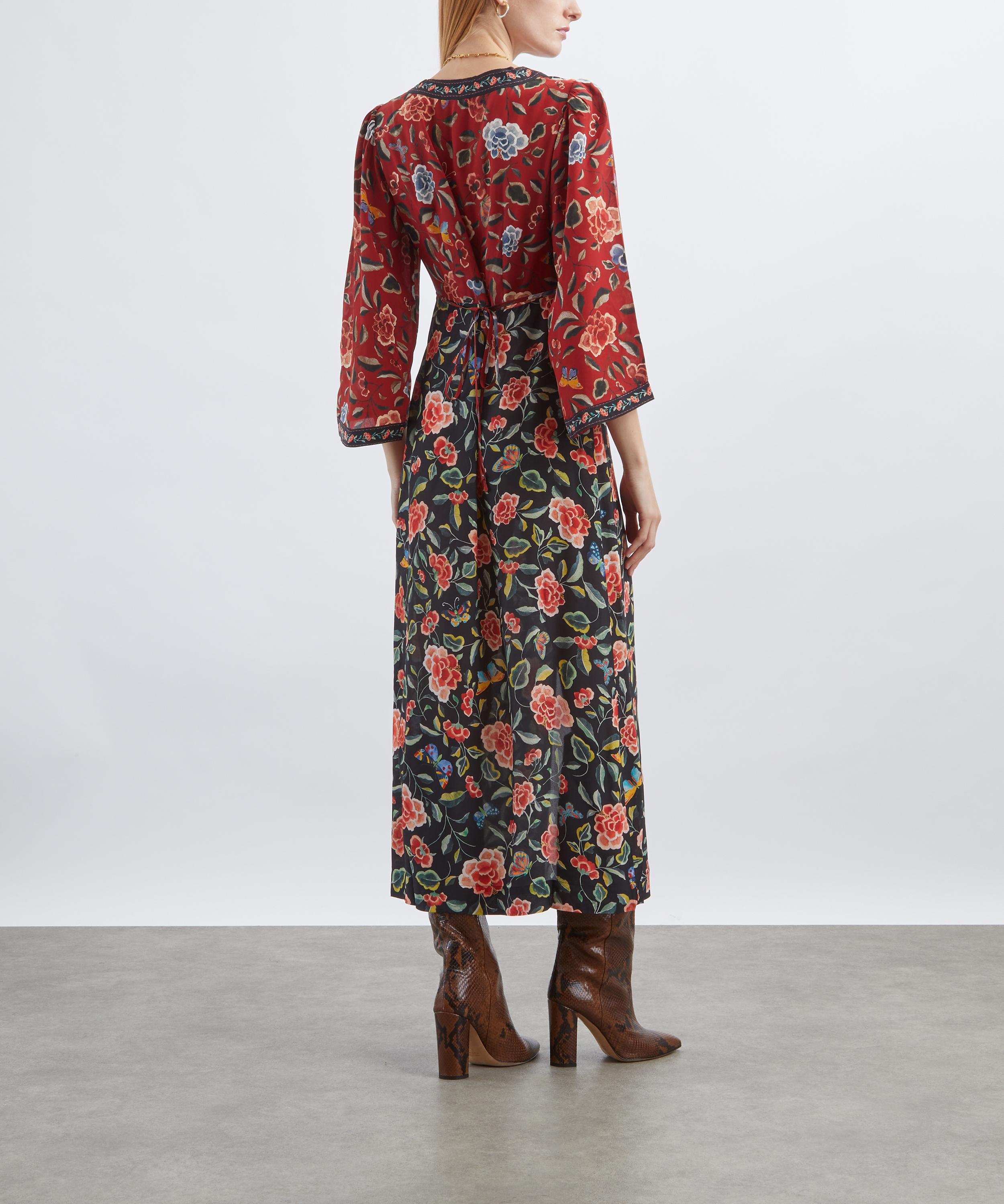 Crafted from lightweight crêpe de chine adorned with chinoiserie-inspired florals, the Dahlia dress features a V-neckline, empire waist, and three-quarter-length sleeves. Effortlessly flattering, tie fastenings at the back allow for a softly defined silhouette.