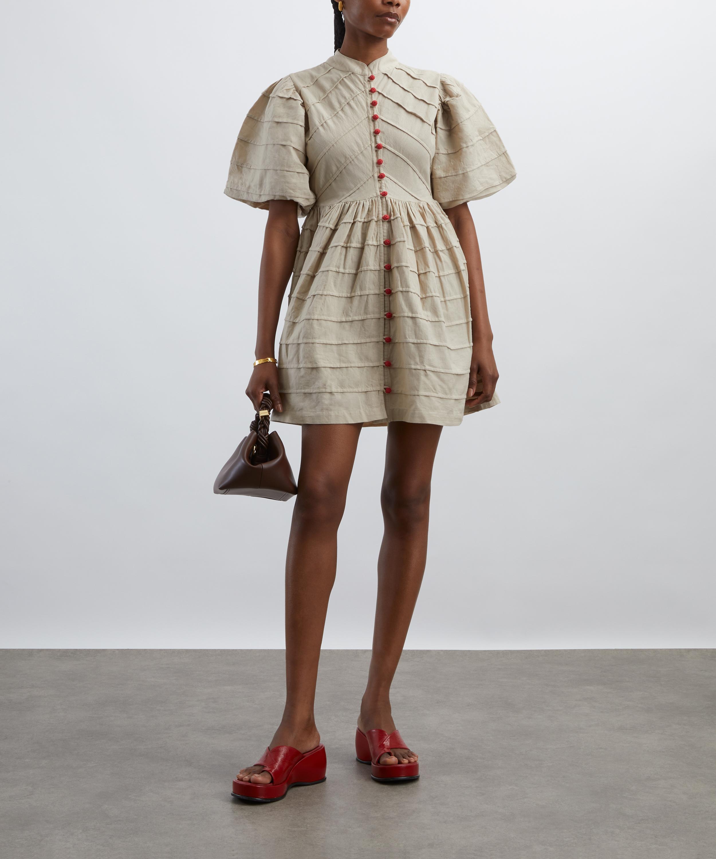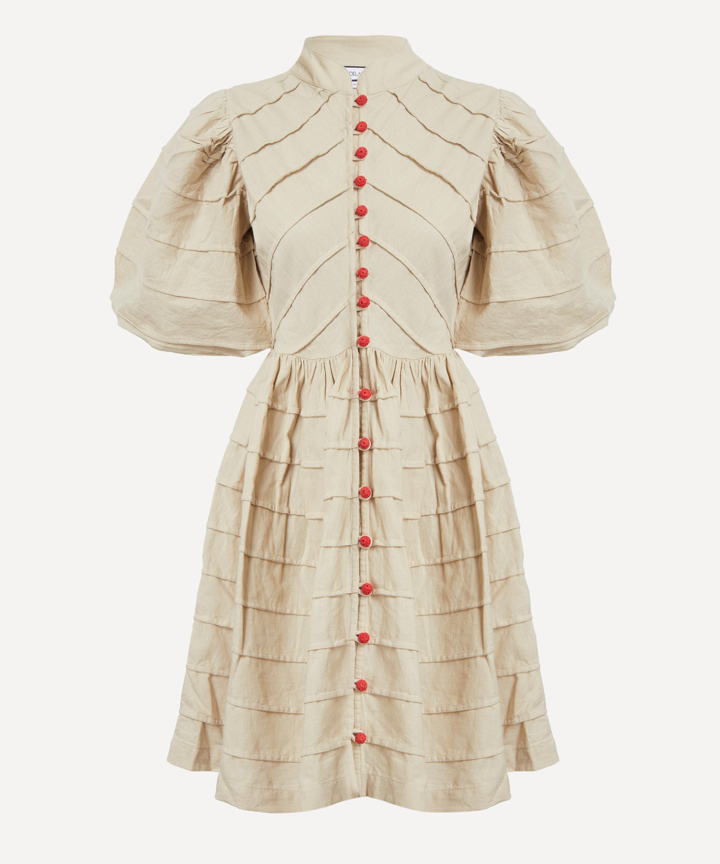 Crafted in India from soft cotton in a delicate nude tone, this elegant mini dress features a flattering silhouette with voluminous sleeves, a cinched waist, and a puffed skirt. Tiers of pintuck detailing add texture and charm, while red buttons down the front offer a playful pop of colour.