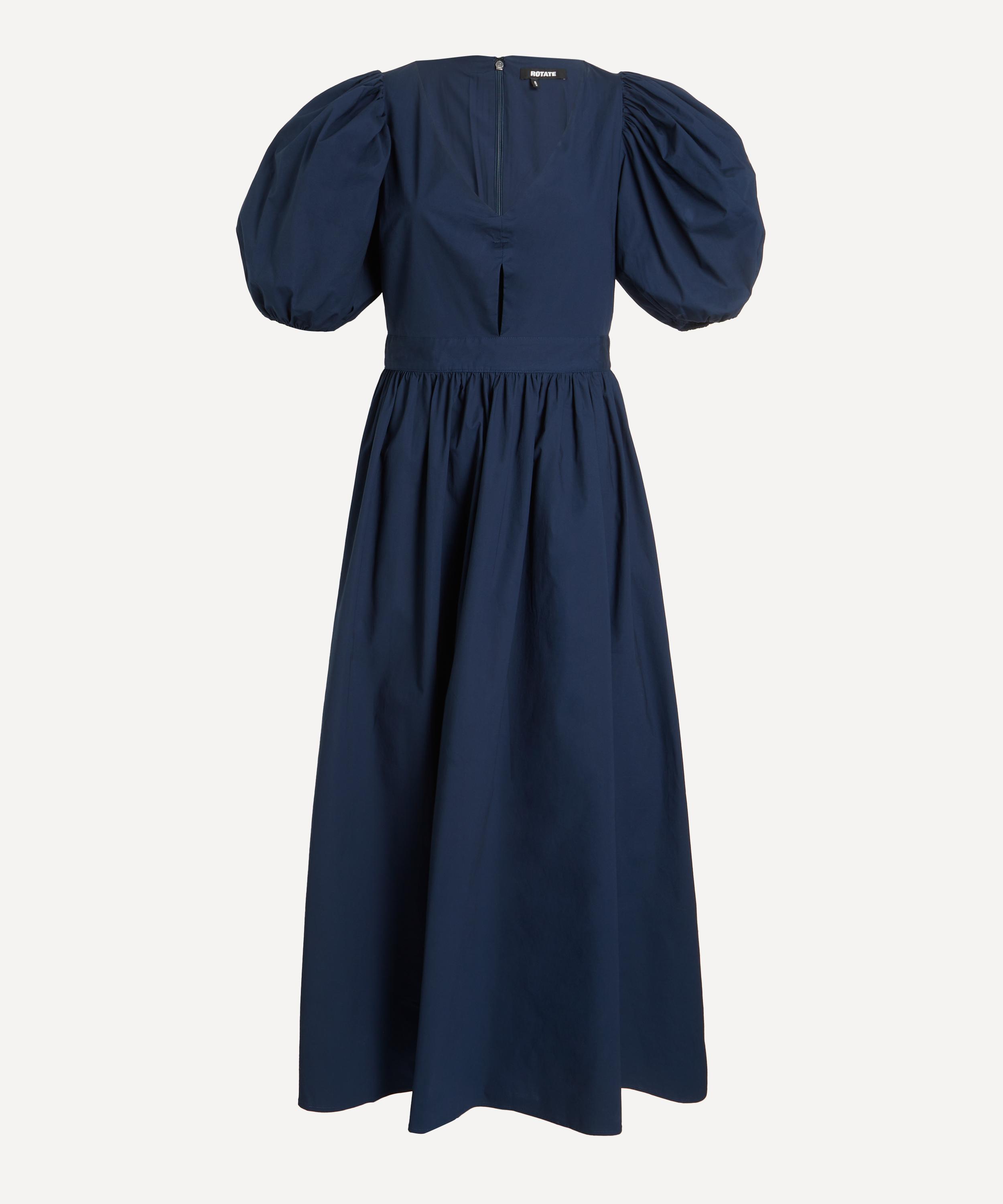 The Dark Blue Puff-Sleeve Midi Dress from ROTATE Birger Christensen brings a bold dose of Copenhagen cool to your evening wardrobe.