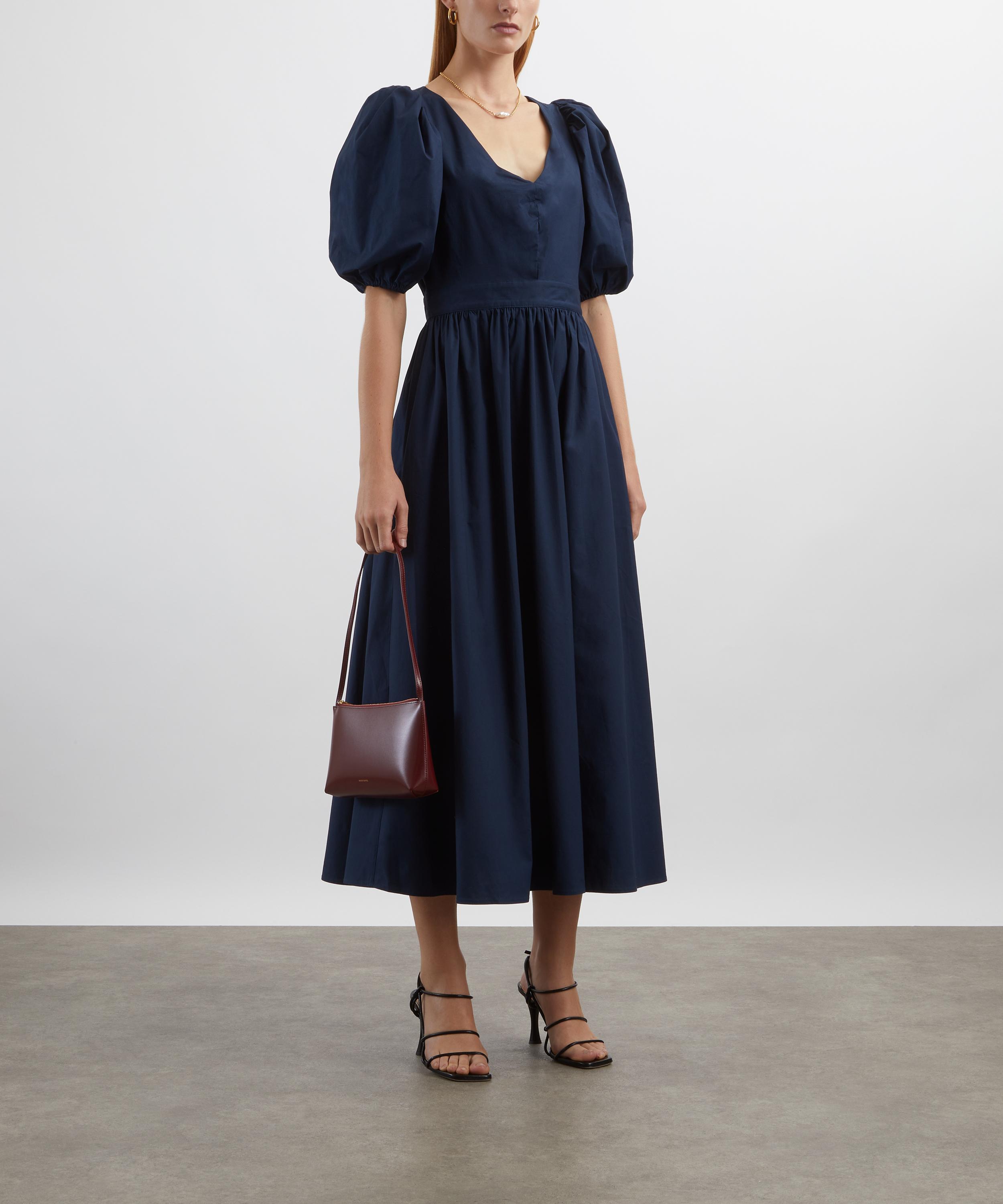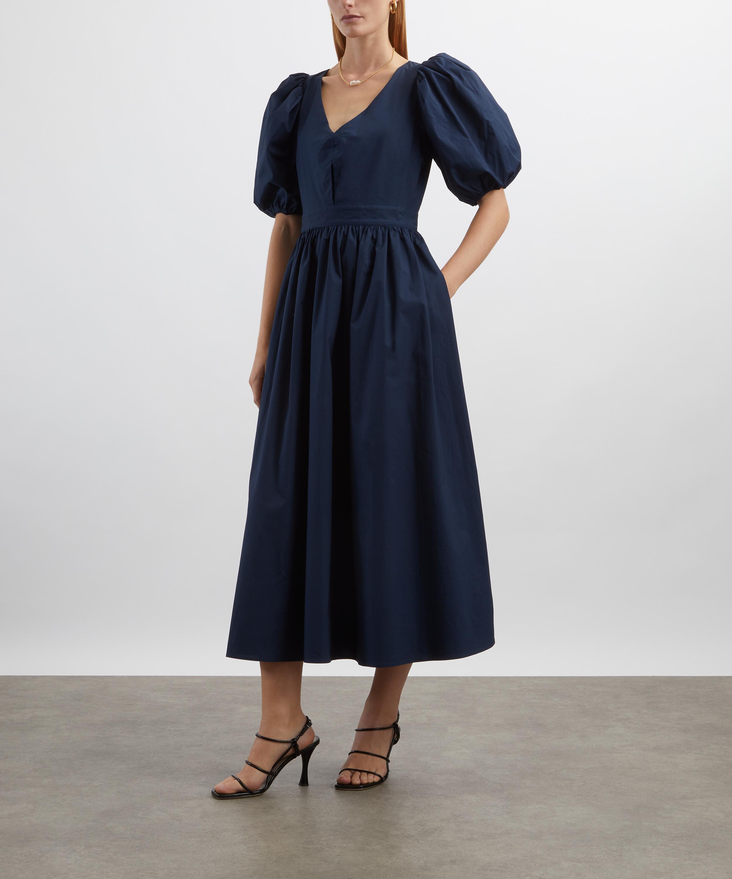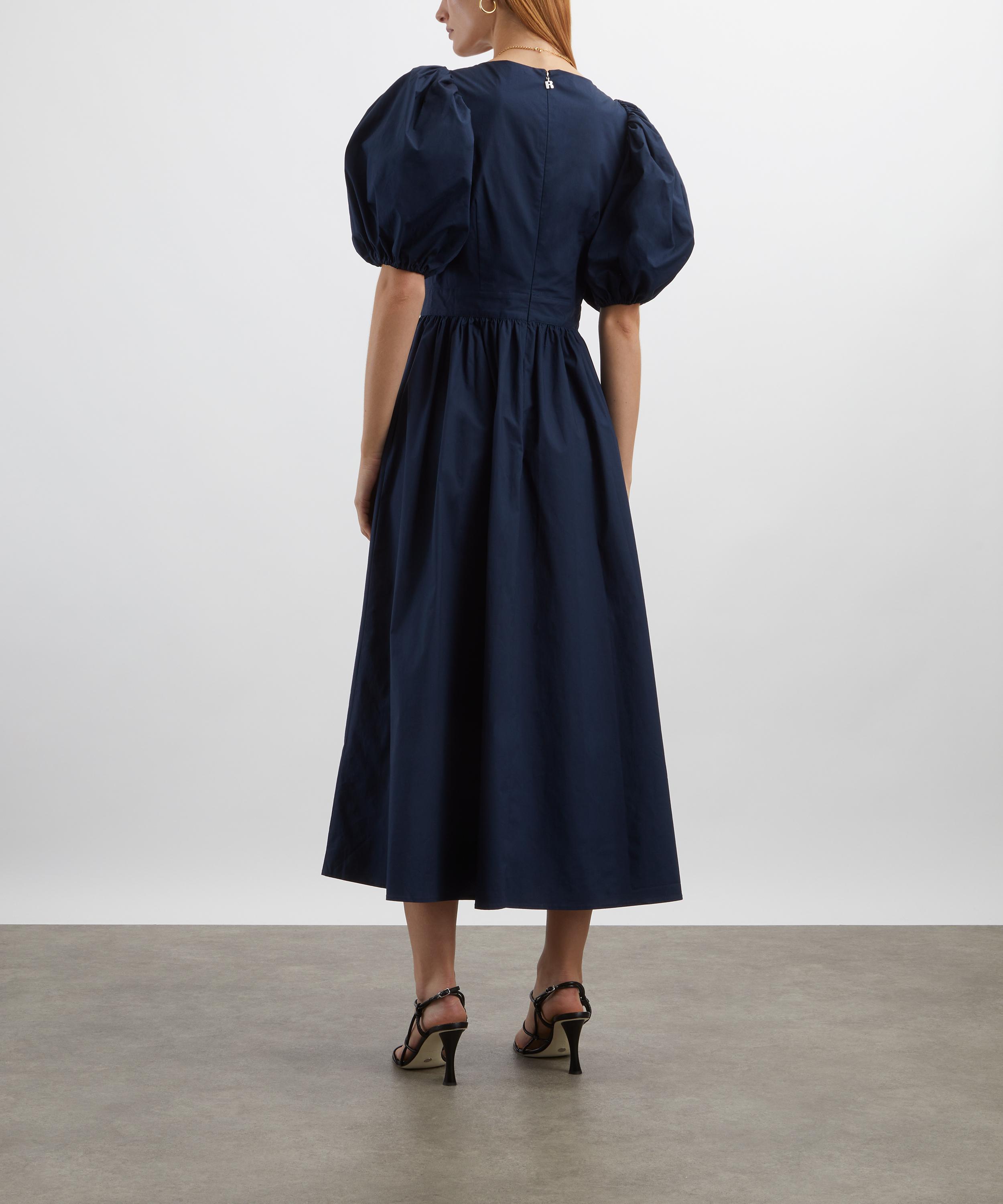 Crafted from cotton in a deep navy hue, this midi dress exudes timeless elegance with its short puff sleeves, fitted bodice, and deep V-neckline finished with a front tie detail. A wide waistband cinches the silhouette, flowing into a voluminous midi-length skirt.