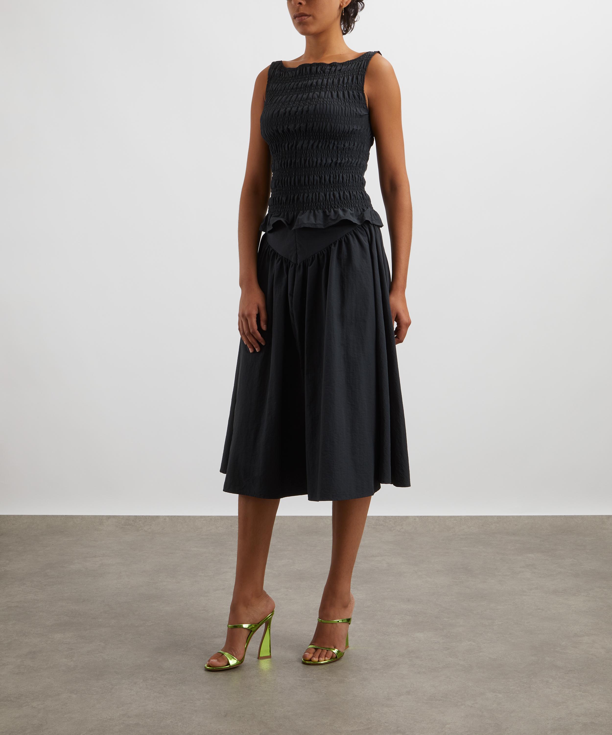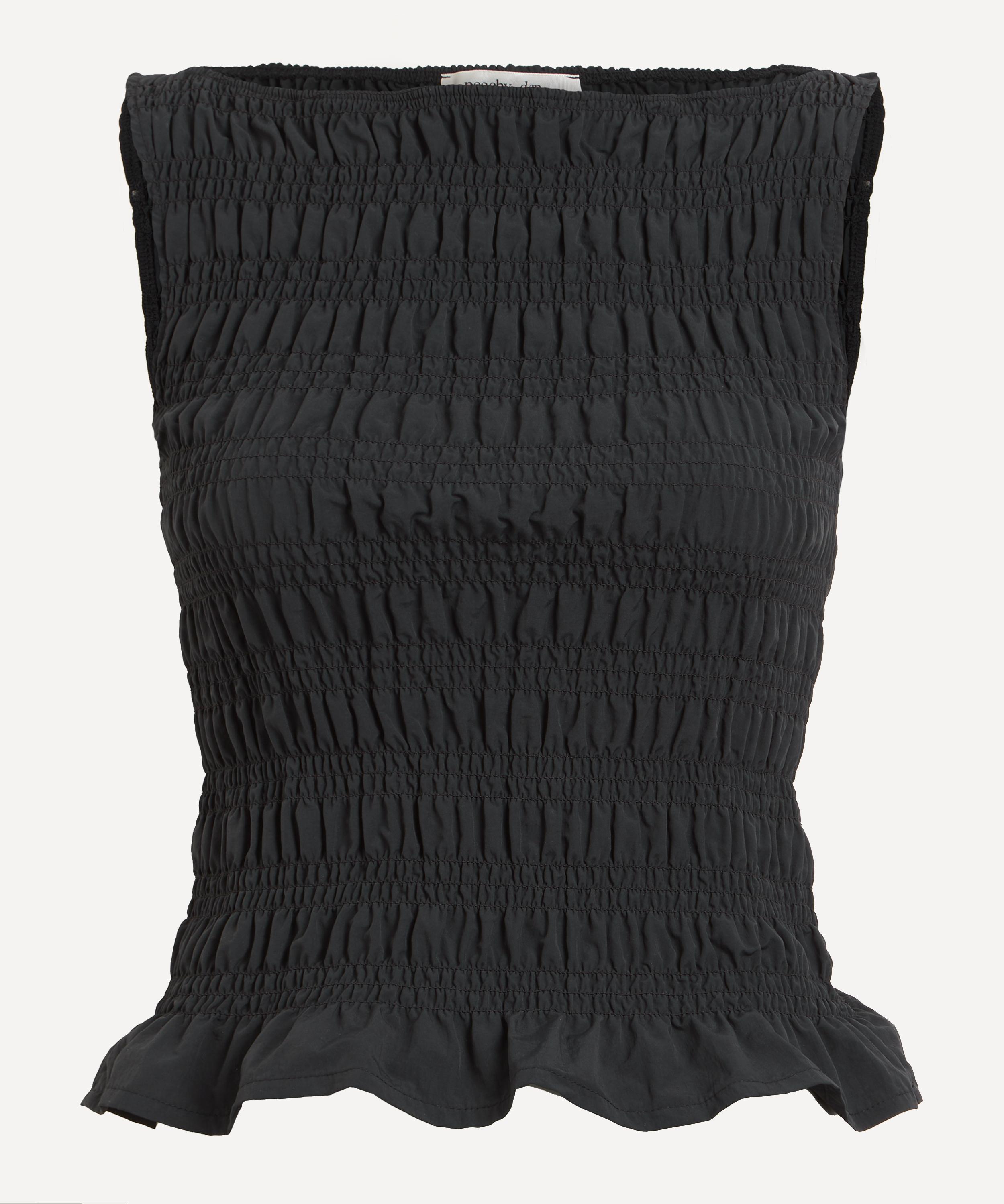 Effortlessly feminine, this sleeveless shirred top exudes elegance with its boat neckline and peplum hem. A form-fitting design, it’s made from Peachy Den’s signature core nylon.
