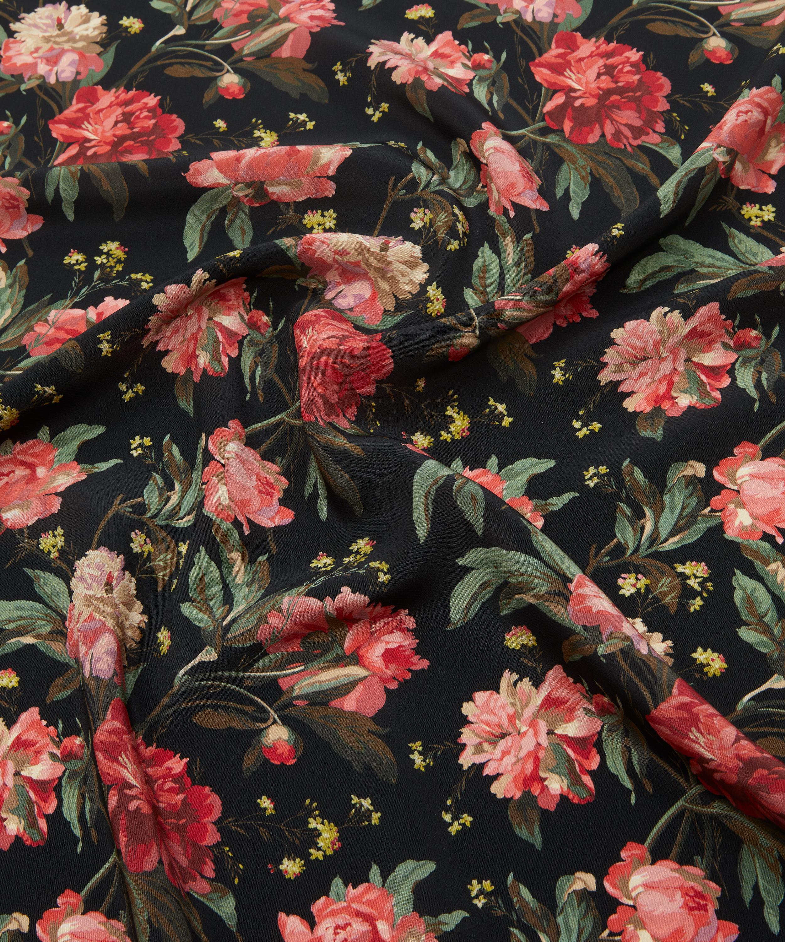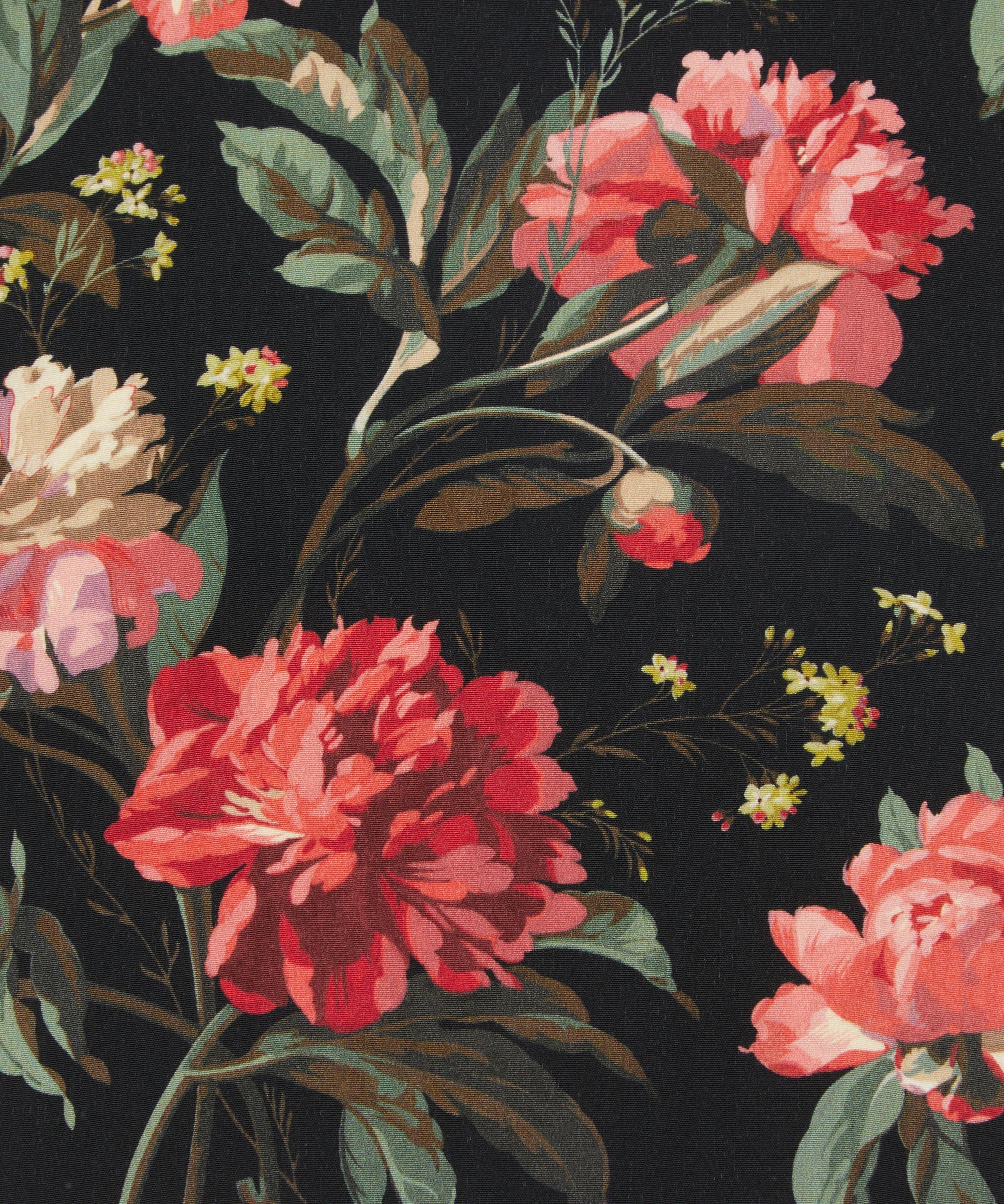 Decadent Blooms draws inspiration from a hand-painted artwork discovered in the Liberty archive. First introduced as a furnishing fabric in 1989, this magnificent botanical features large and bounteous bunches of roses, peonies, and forget-me-nots, gracefully trailing across the fabric. Set against richly dark backdrops, these flowers take centre stage, their warm hues accentuated and intensified, to add depth and visual contrast.