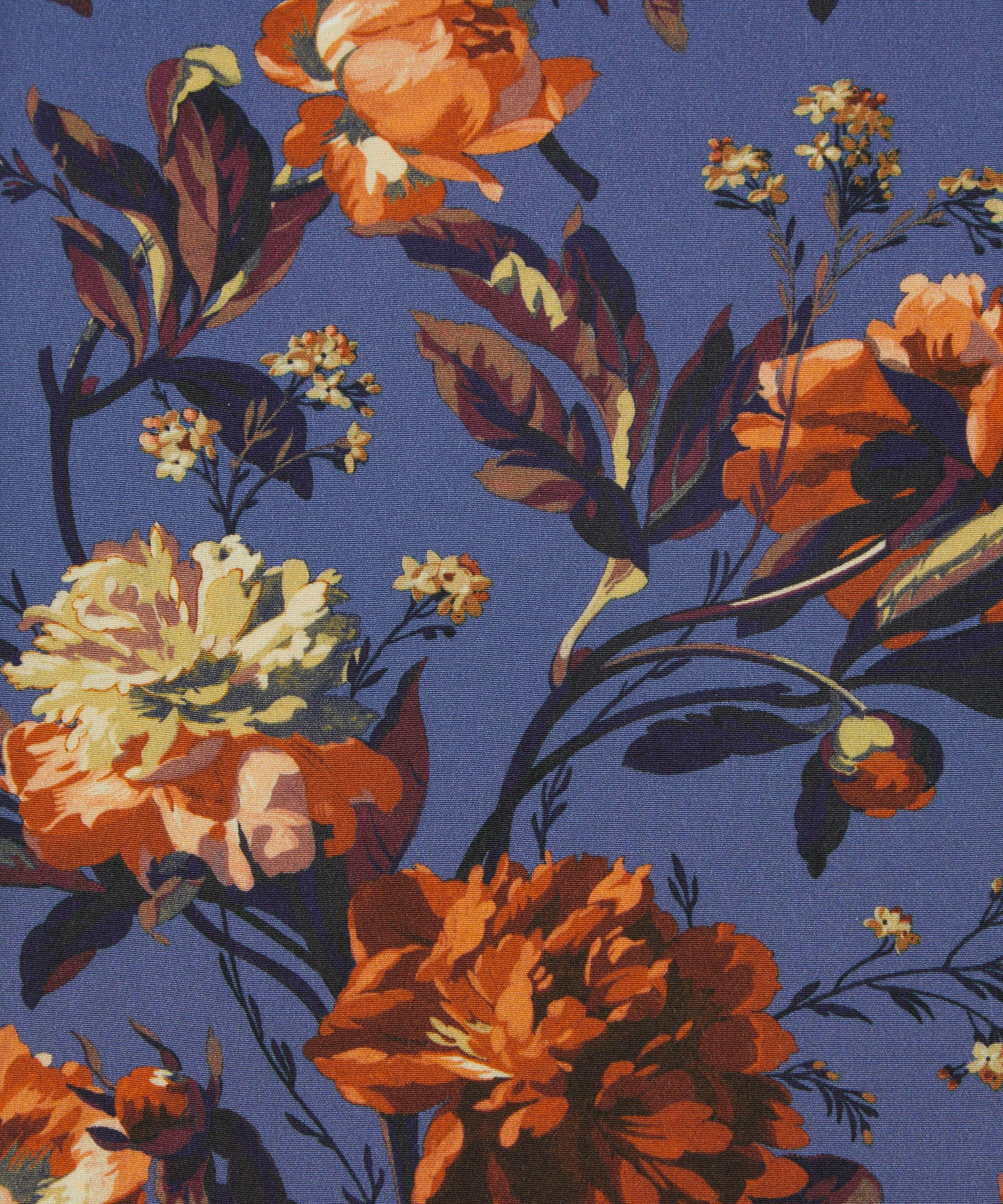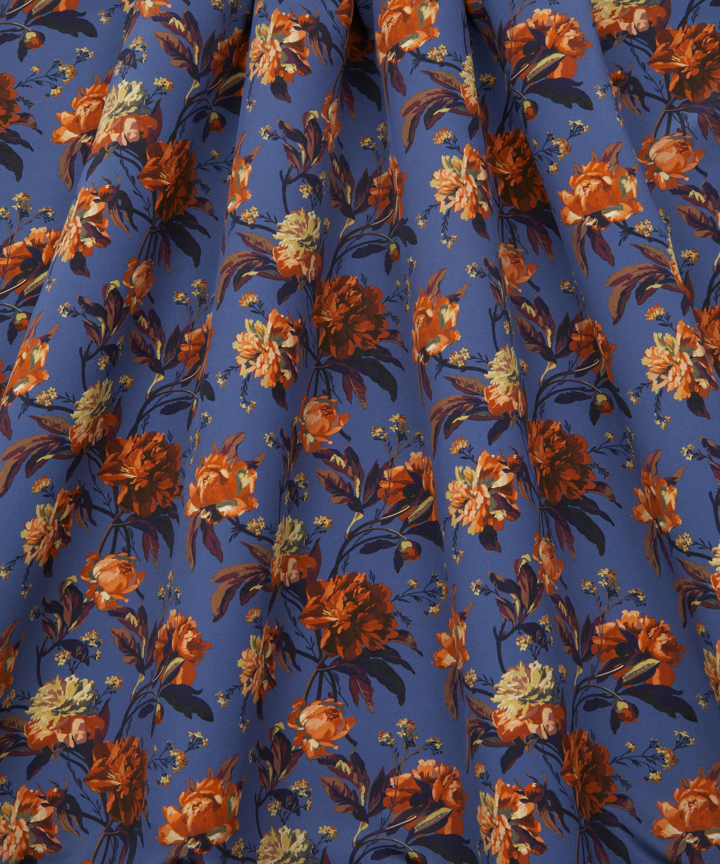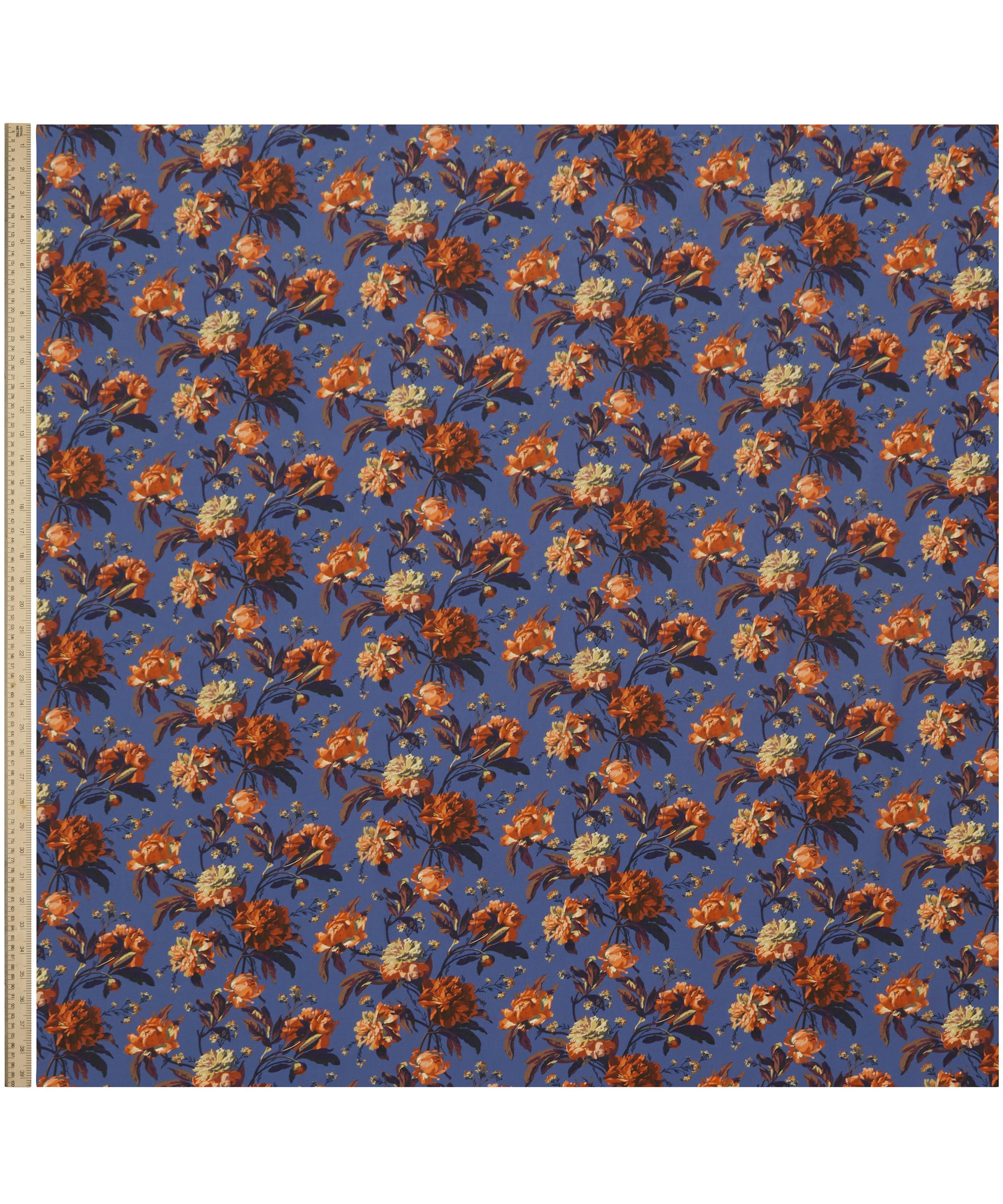 Decadent Blooms draws inspiration from a hand-painted artwork discovered in the Liberty archive. First introduced as a furnishing fabric in 1989, this magnificent botanical features large and bounteous bunches of roses, peonies, and forget-me-nots, gracefully trailing across the fabric. Set against richly dark backdrops, these flowers take centre stage, their warm hues accentuated and intensified, to add depth and visual contrast.