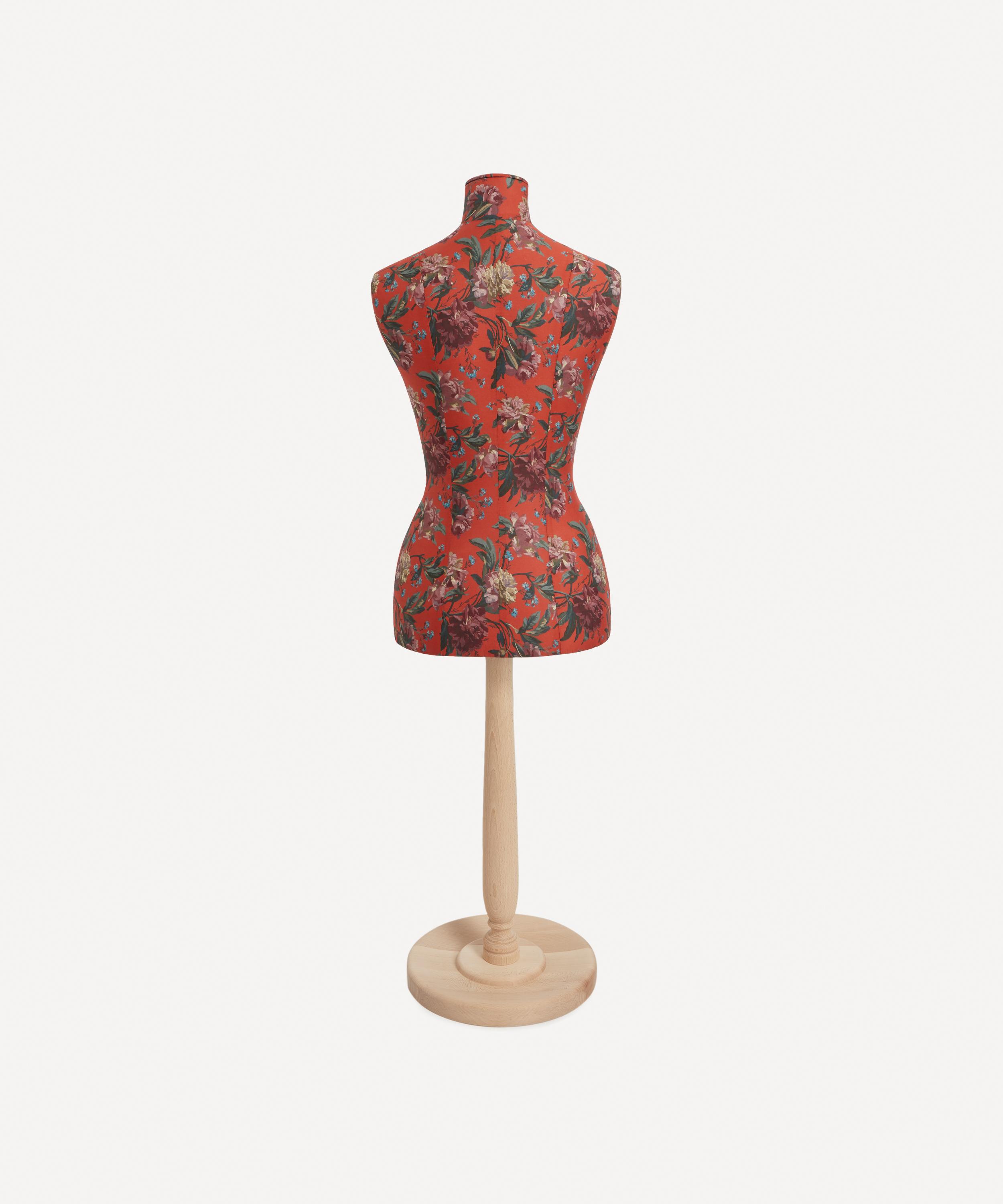 Our Liberty print tailor’s dummy has an adjustable height that makes it perfect for garment display or dressmaking, finished with a turned wooden base. The mannequin is covered with Tana Lawn™ cotton, in our iconic Decadent Blooms print. Originally printed as a furnishing fabric in 1989, this design is based on a painting unearthed in the Liberty archive and features large and bounteous bunches of roses, peonies and forget-me-nots.