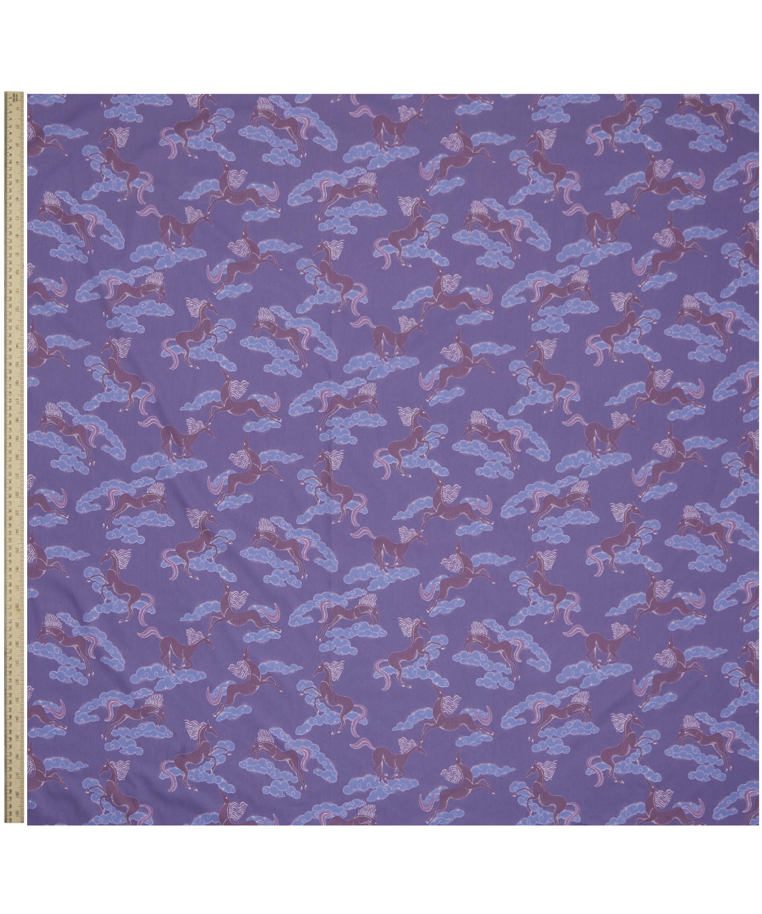 Hand-drawn in fine liner in the Liberty design studio, elegant horses leap across the sky where dense and dispersed areas of dots to add to the whimsical nature of the design. The style is reminiscent of Art Deco paintings and sculptures of horses from the 1920s, with their beautifully curved forms.