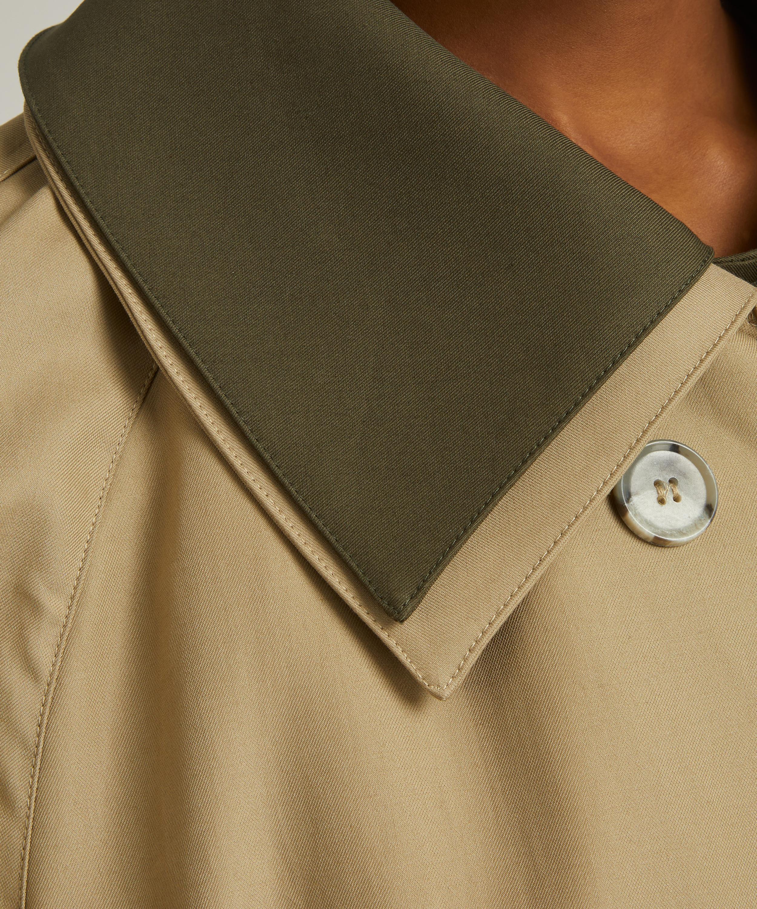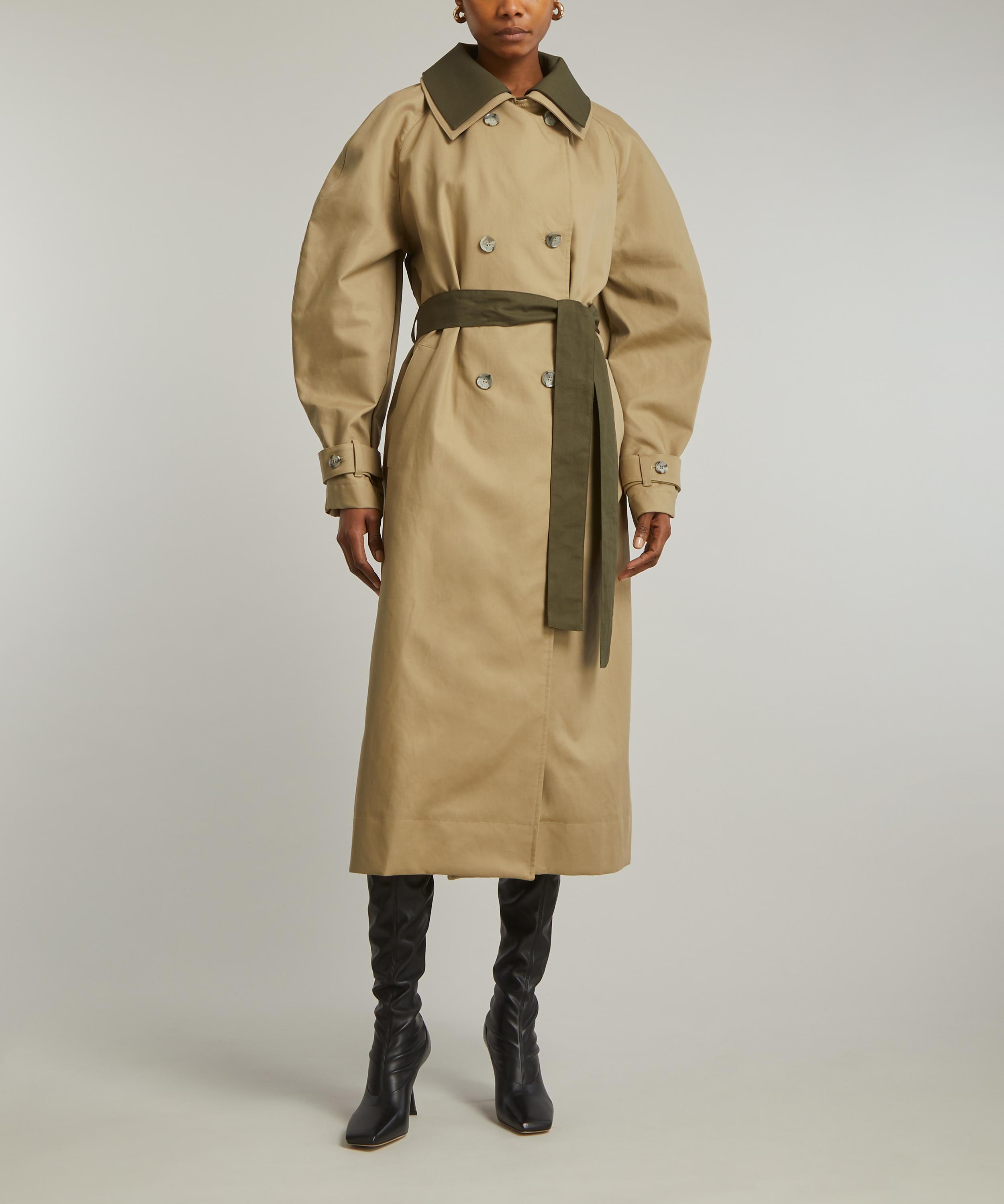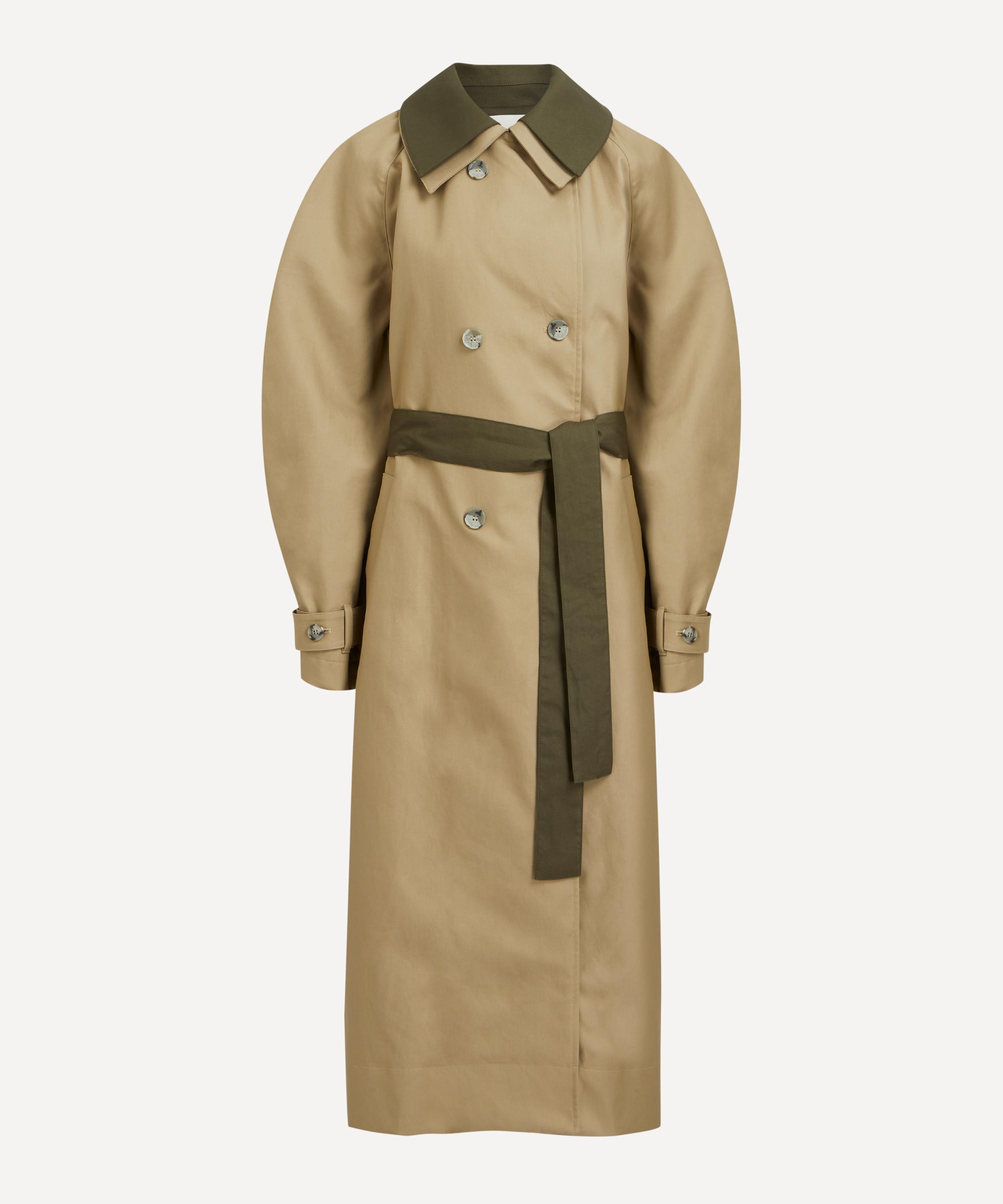 An elevated take on a classic design, this deconstructed trench coat is designed with a double-layered front which consists of contrasting khaki and beige panels. Crafted from a firm and luxurious cotton twill fabric, this water-repellent coat is structured with rounded raglan sleeves, and a double-breasted front closure, which is secured with buttons and a cinchable waist belt.