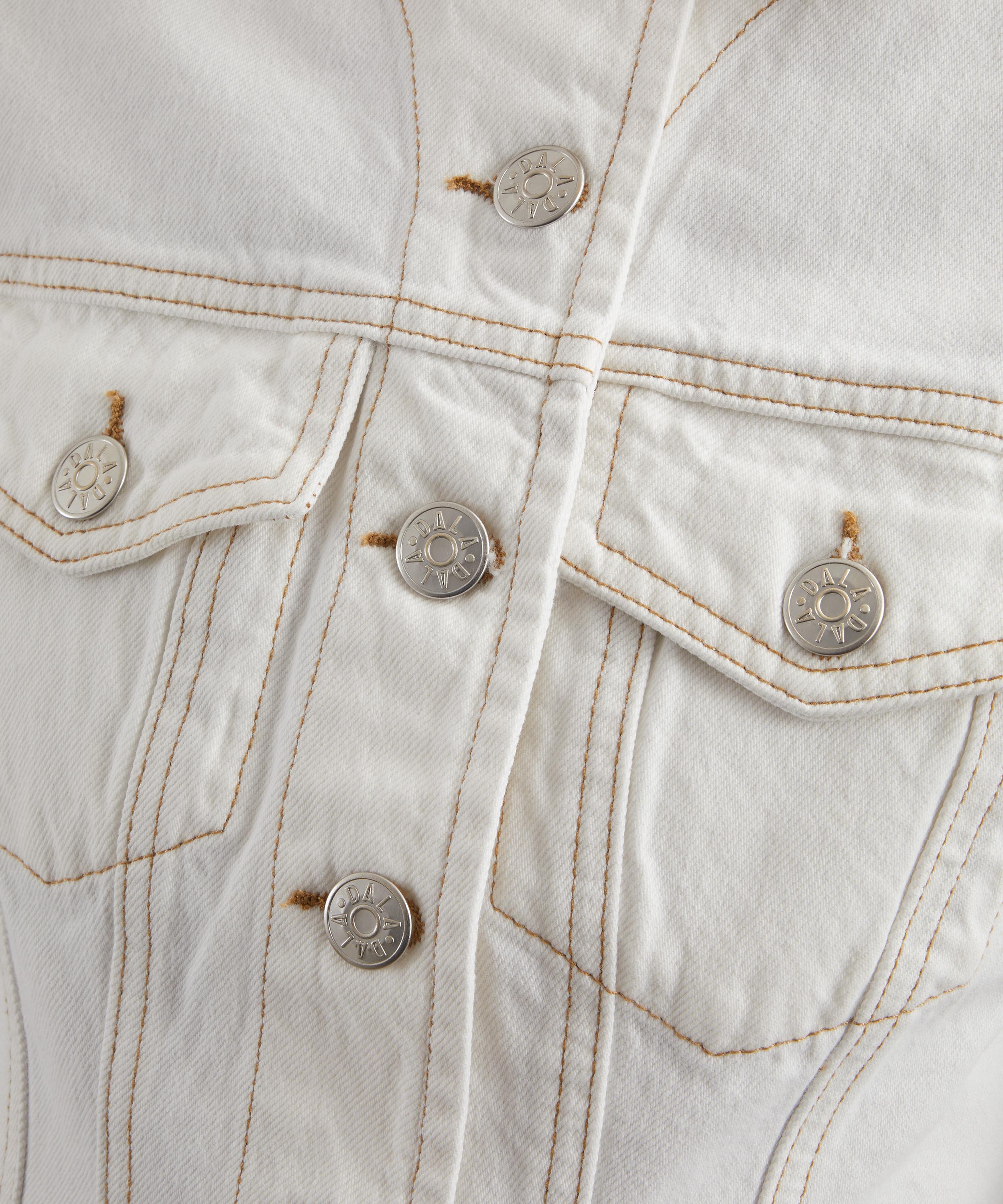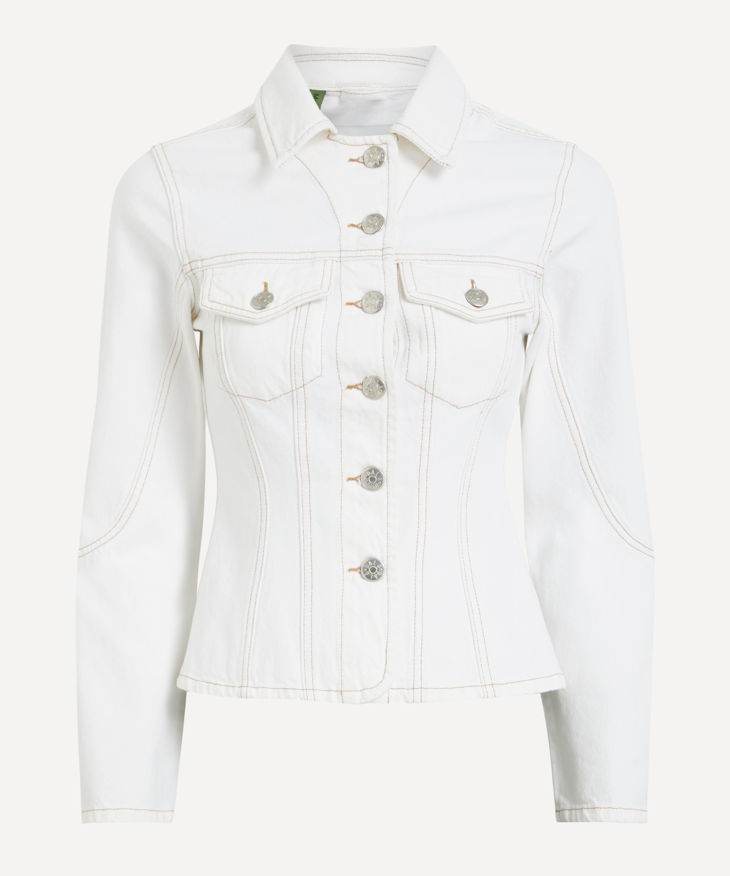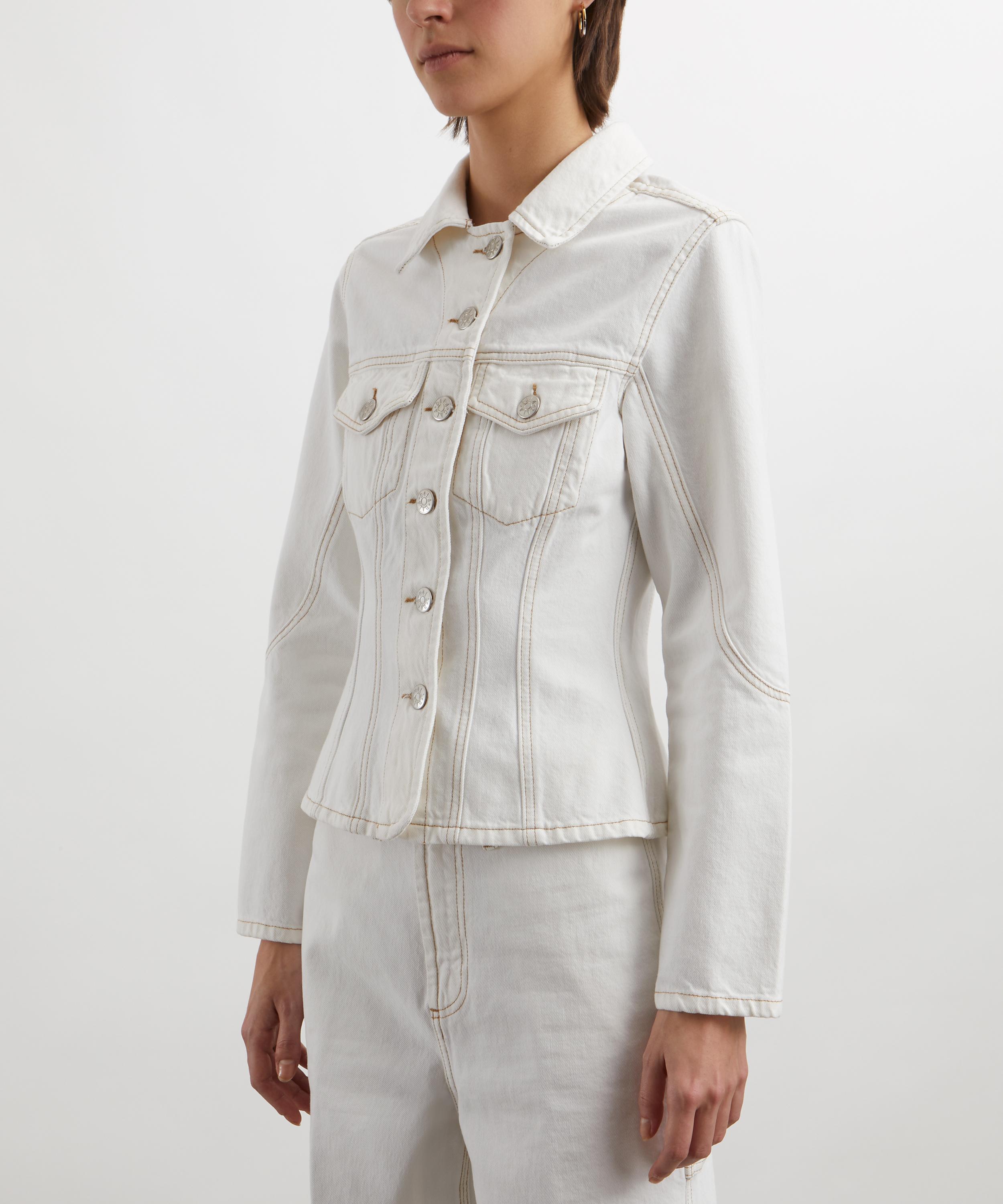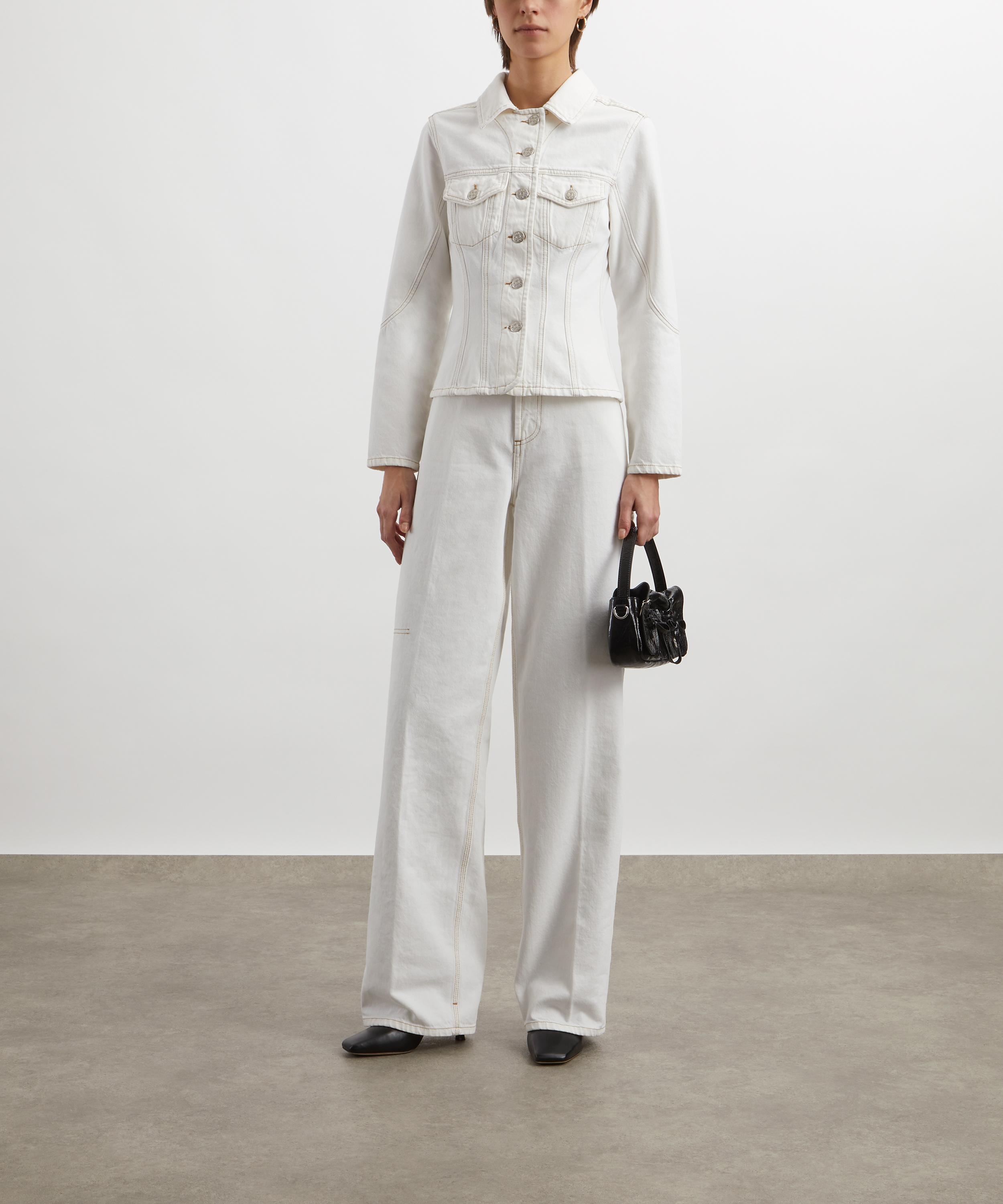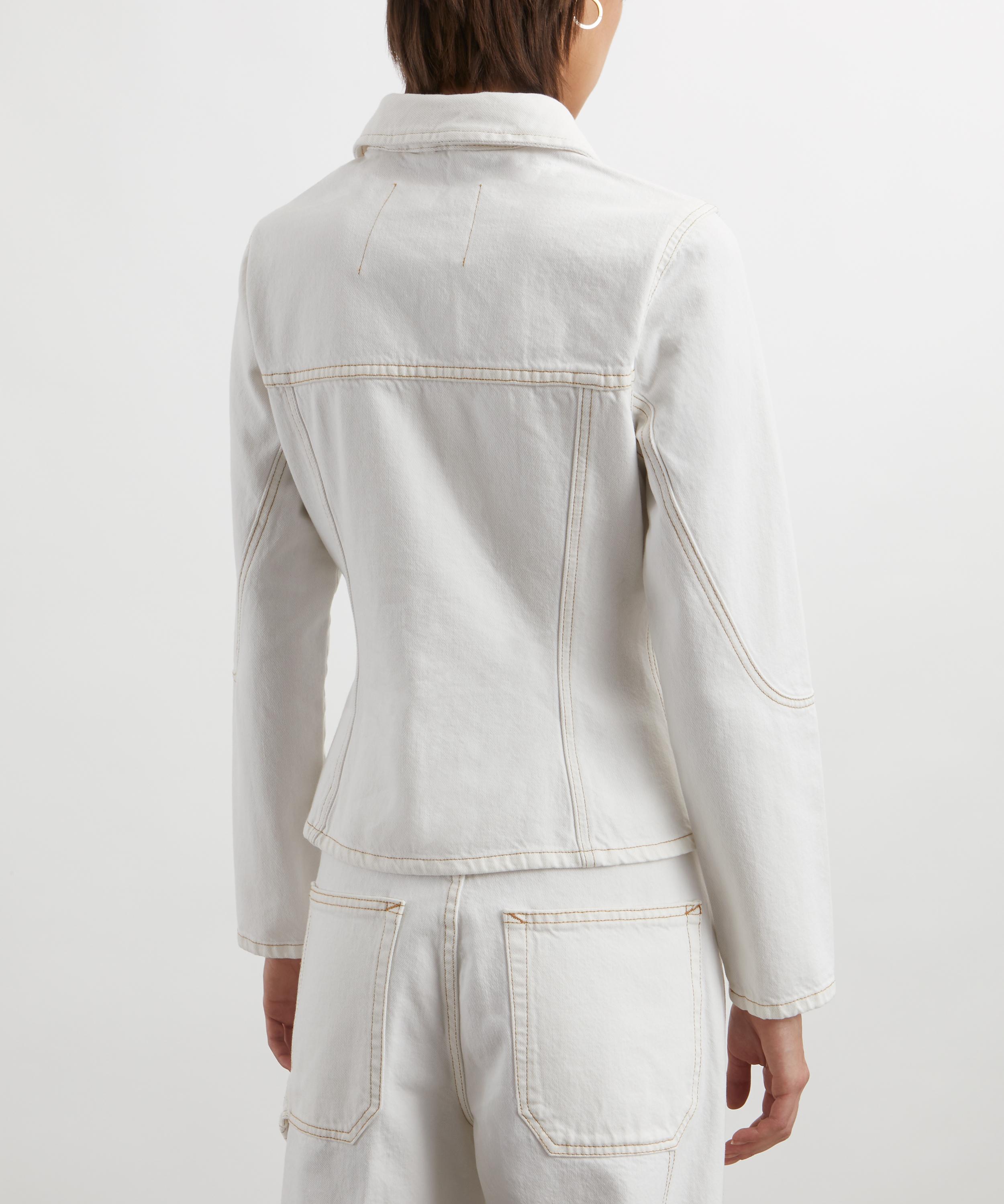 Crafted from rigid Italian denim in a clean white hue, the Suit Jacket features a shrunken fit with bracelet-length sleeves and seam detailing that subtly contours the waist for a tailored, feminine silhouette.