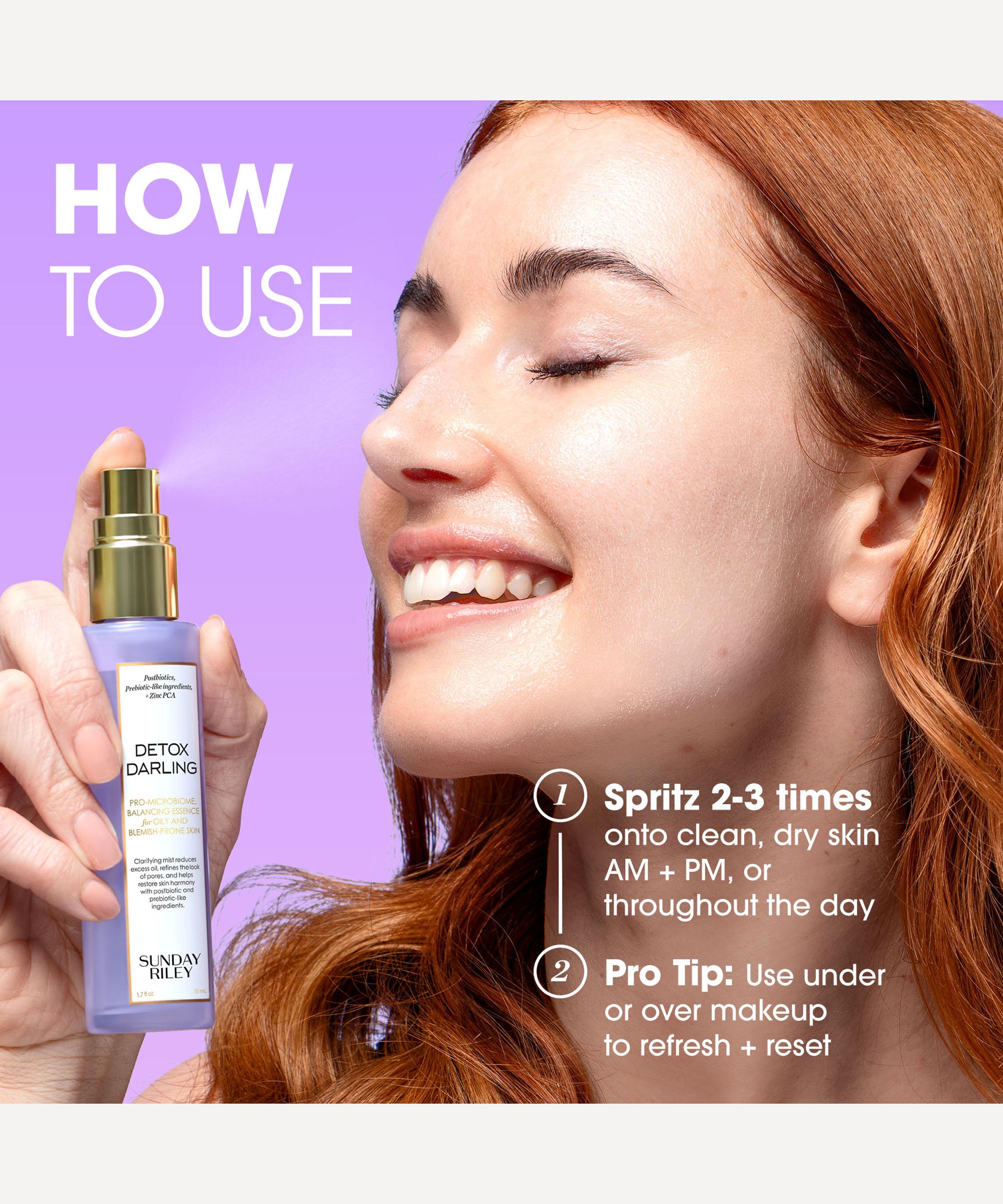 Purify your skin with Sunday Riley’s Detox Darling Microbiome Balancing Toner + Essence – a gentle skin toner that restores the skin's harmony to help refine the texture of your complexion.