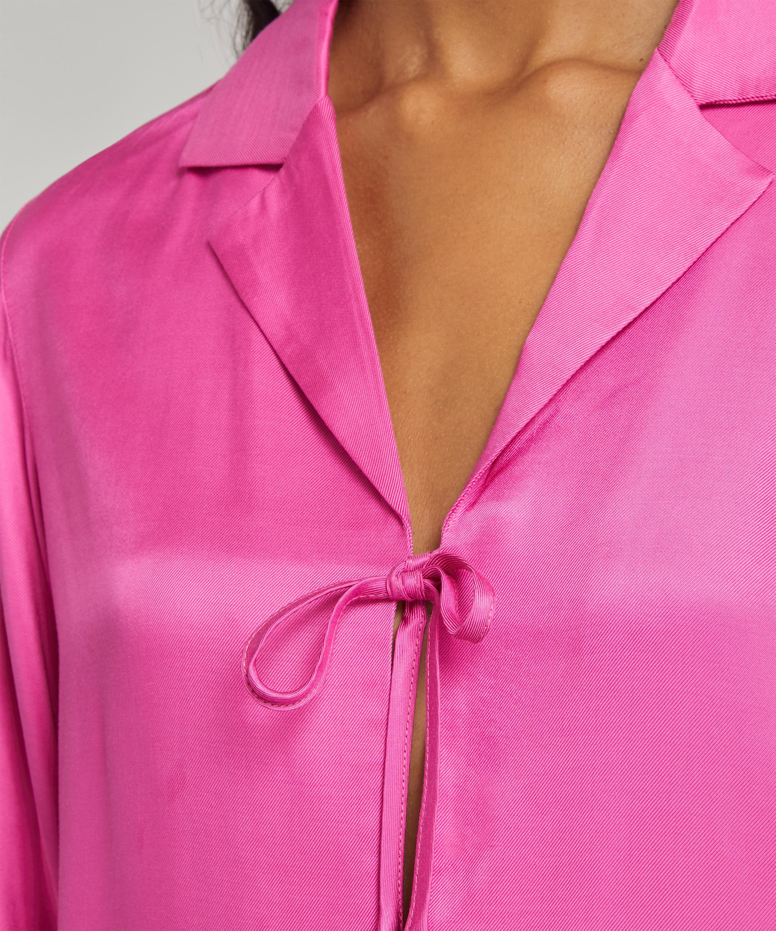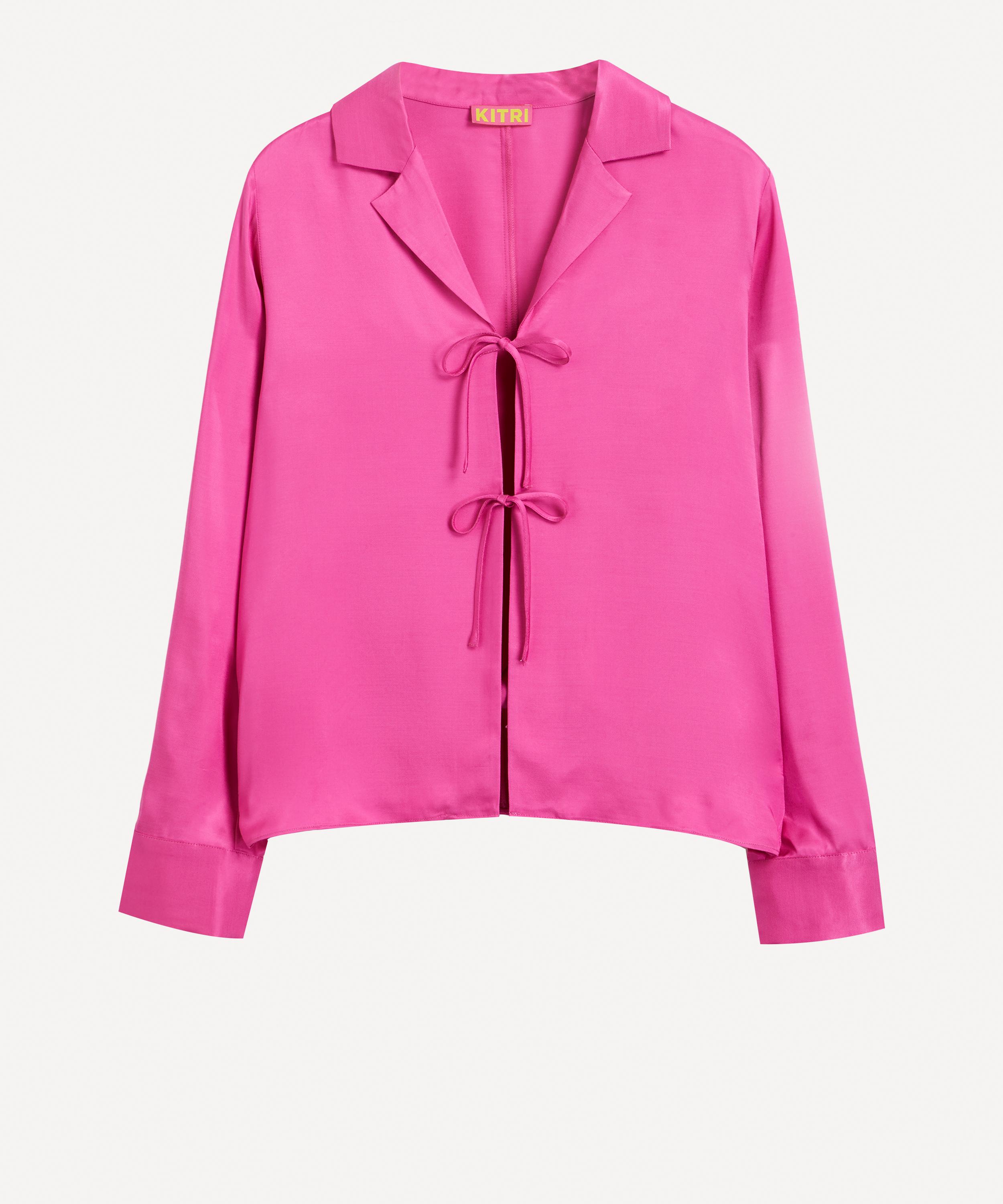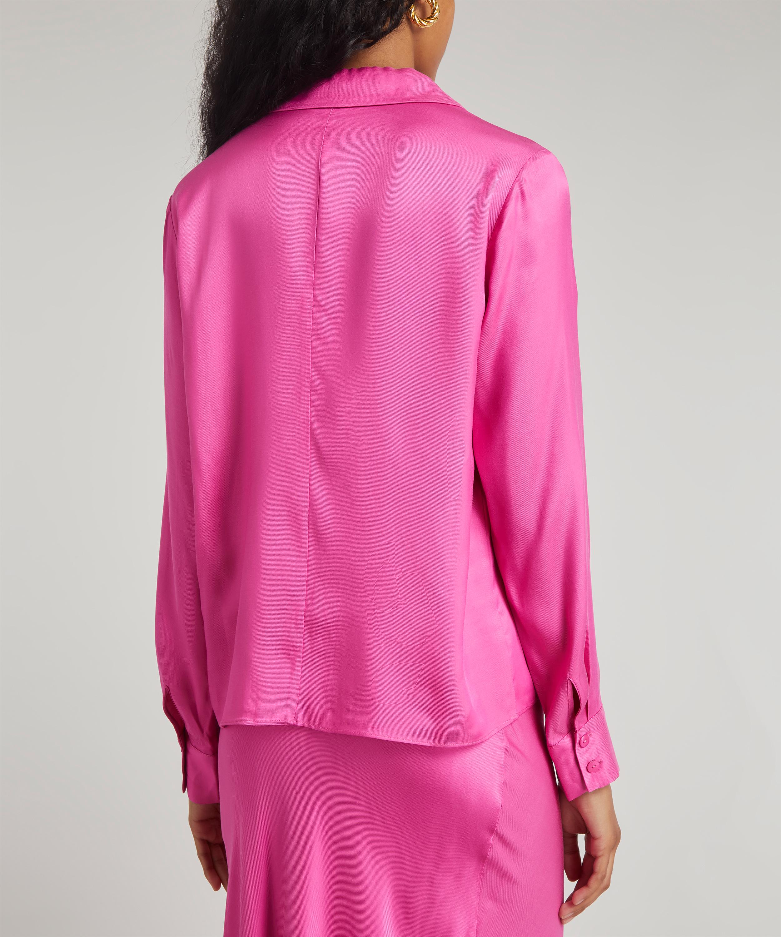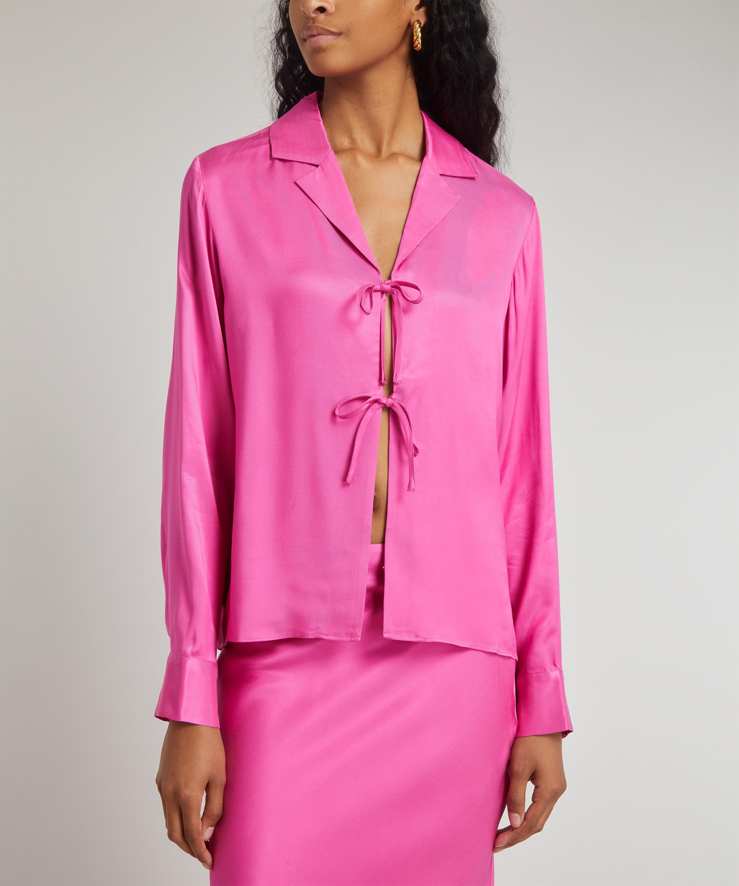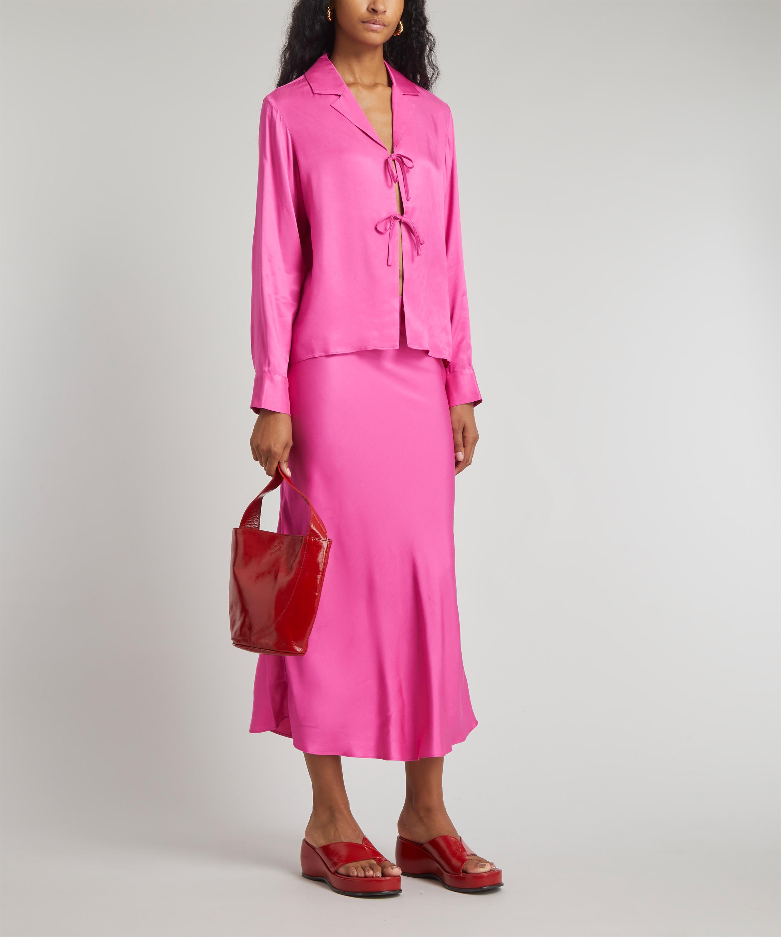 Crafted from a super-silky and sustainable Ecovero viscose-crepe blend, the Devon shirt-style top is cut to a slinky, skin-showing design with its open placket, secured by two adjustable front ties. Complete with a relaxed notched collar and long, cuffed sleeves, its punchy hot-pink hue will embolden your evening edit when paired with the matching Dylan skirt.