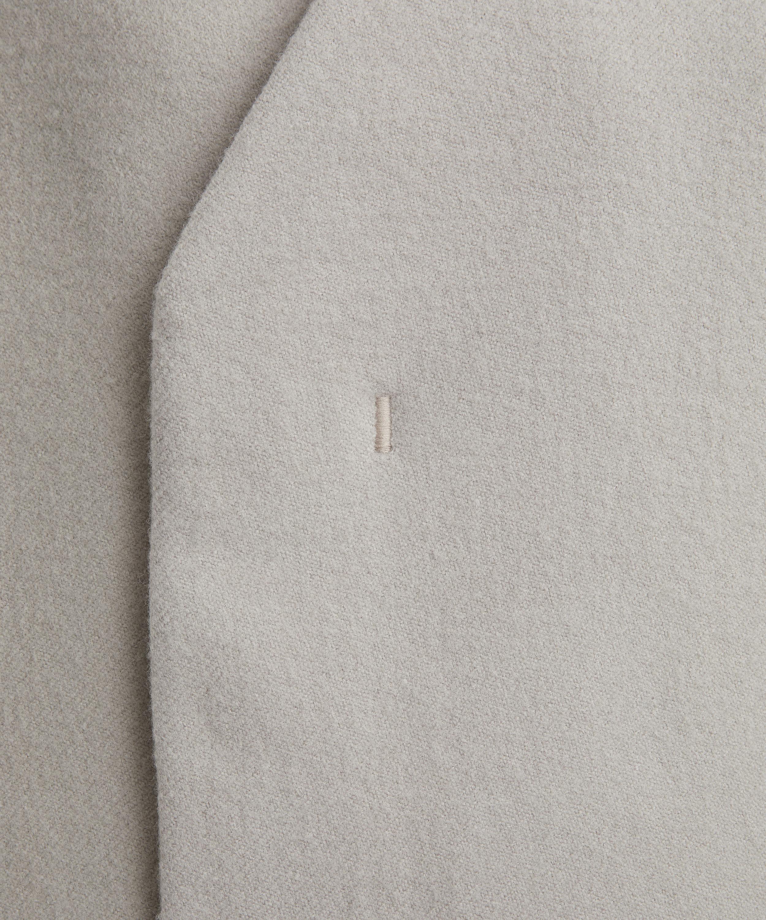 Crafted from wool, this double-breasted coat features a clean V-neckline, concealed button fastening, and contrast satin cuffs—offering a minimalist silhouette with a refined finish.