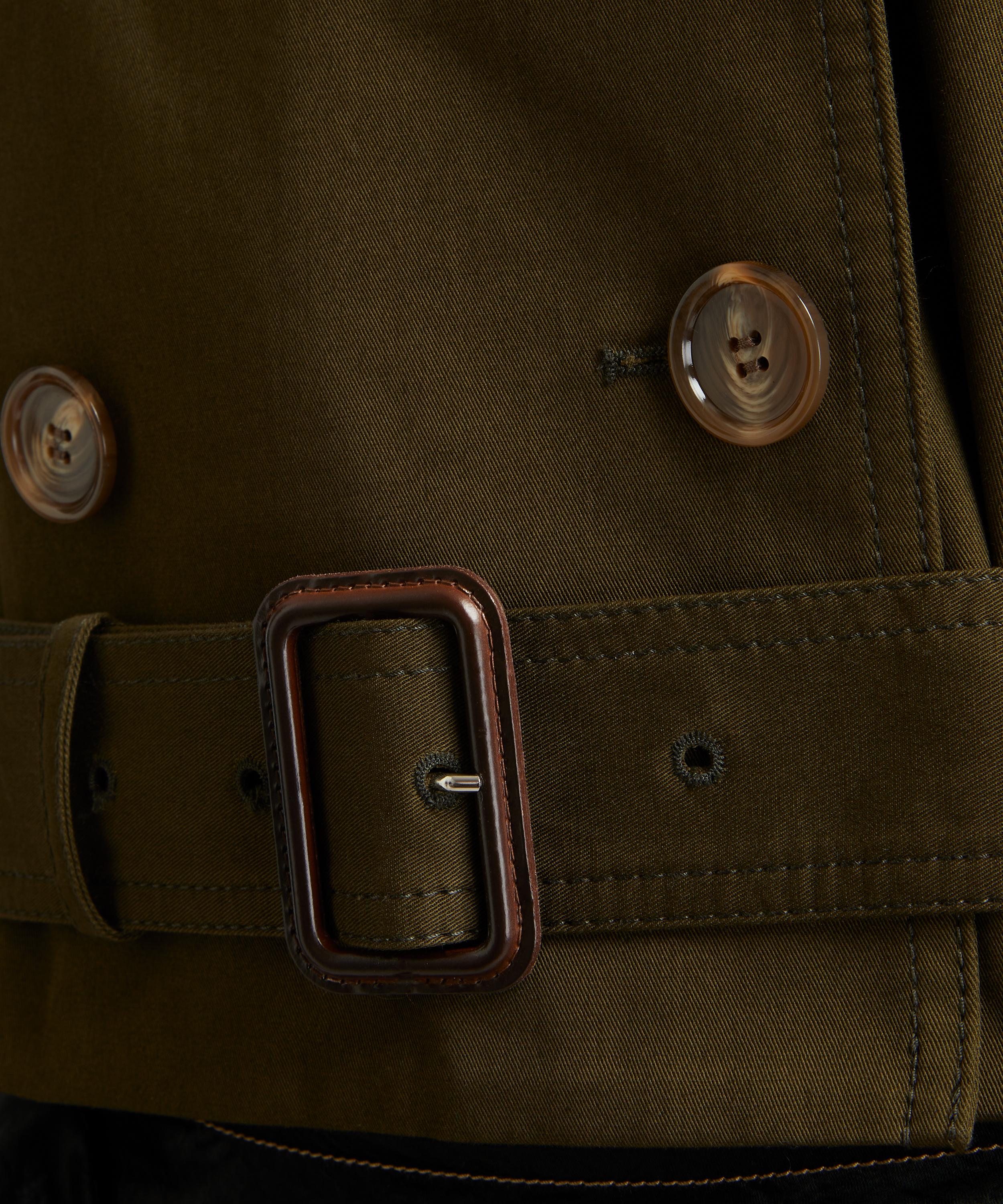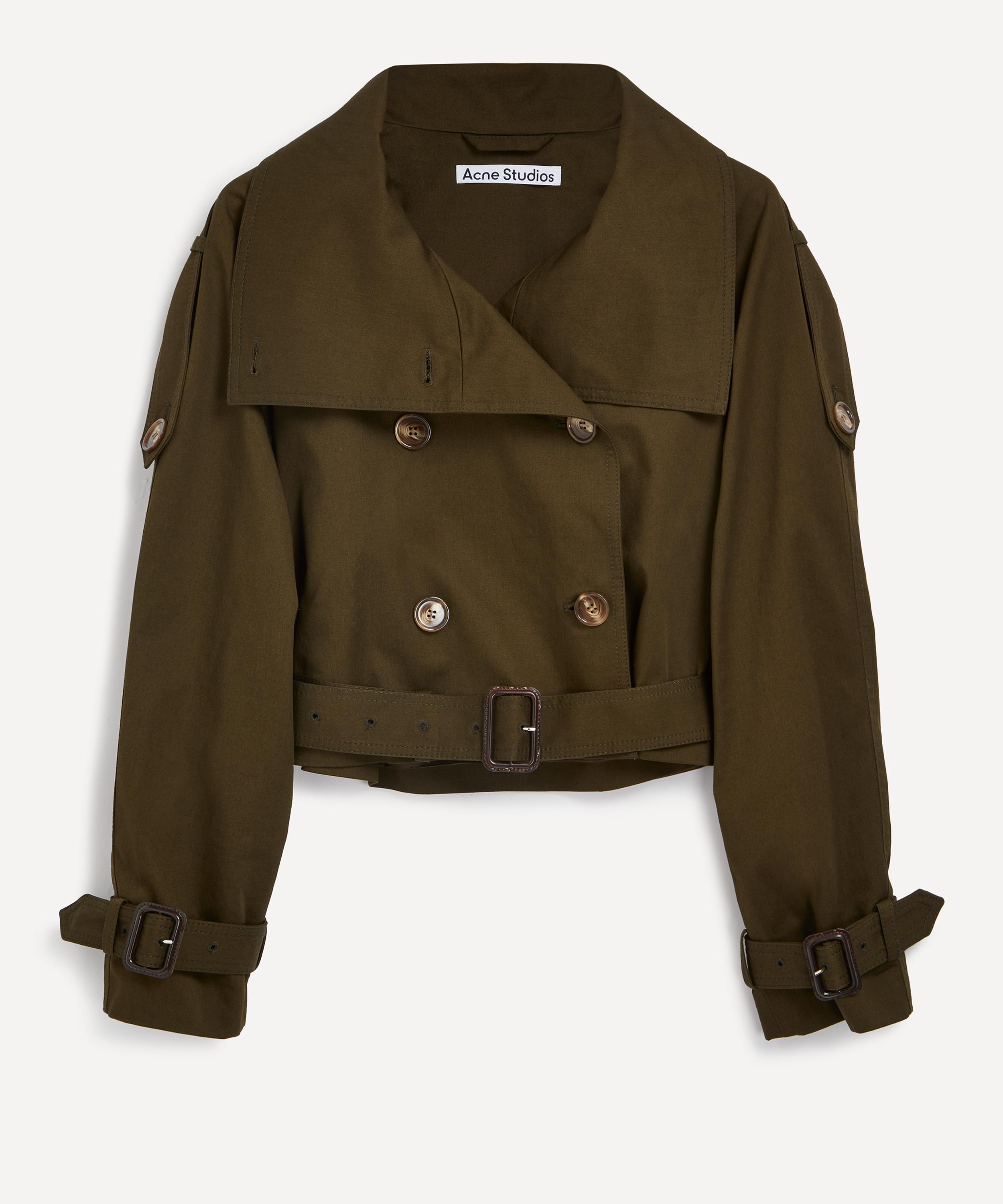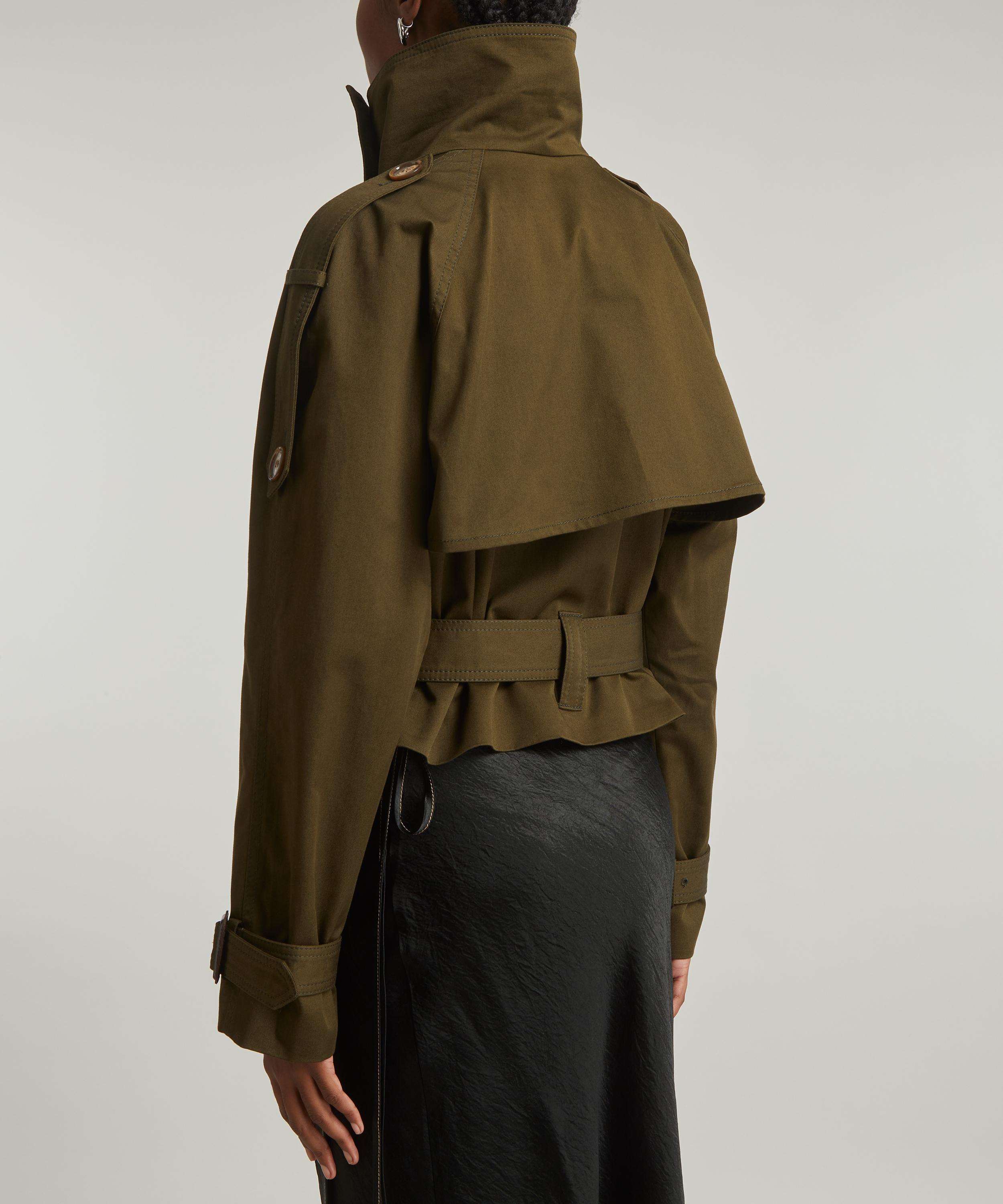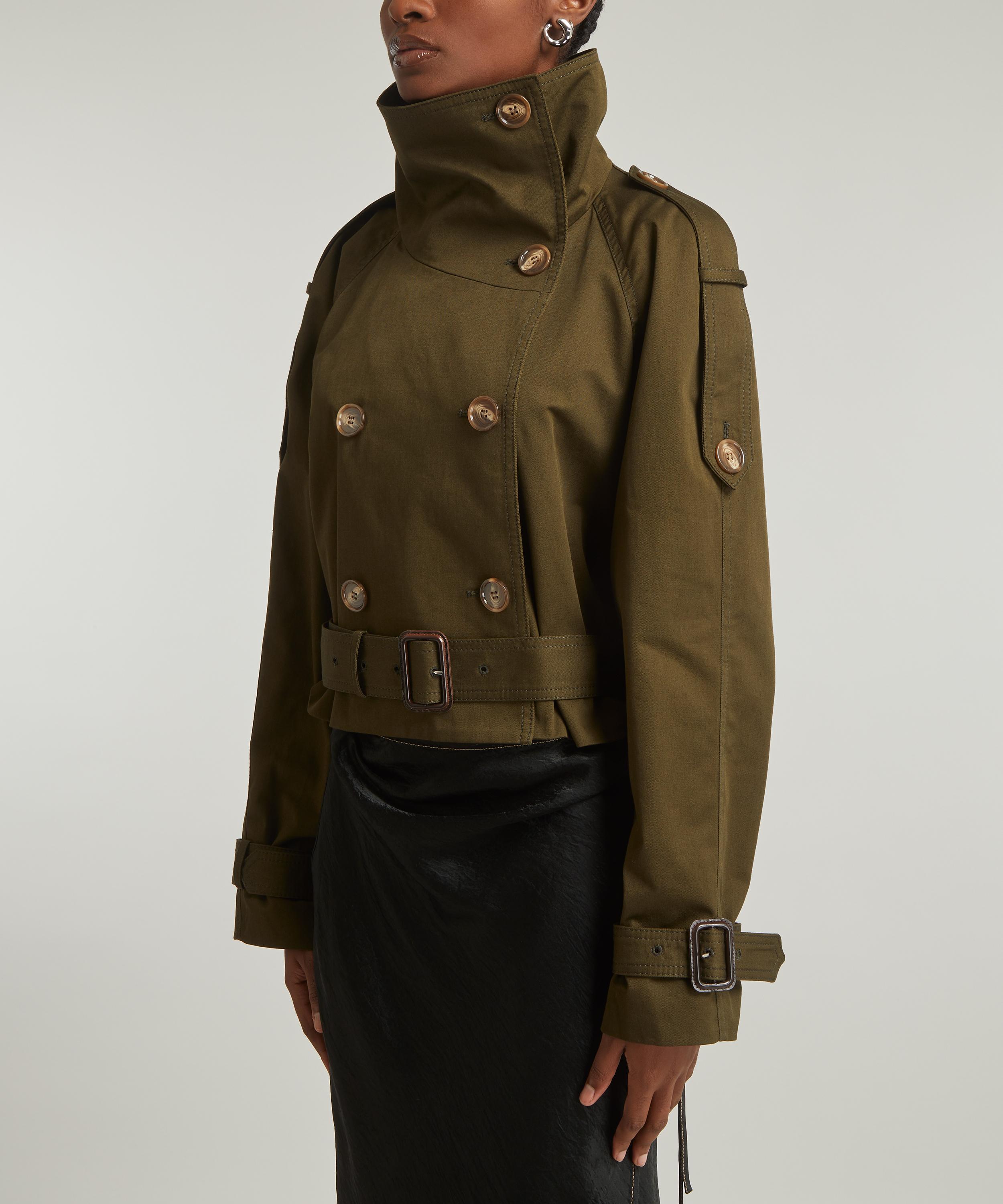 A subverted take on classic tailoring, this cropped trench in military-green boasts a relaxed, double-breasted silhouette complete with an adaptable funnel collar, button closure and a belt at the bottom hem for a cinched finish.