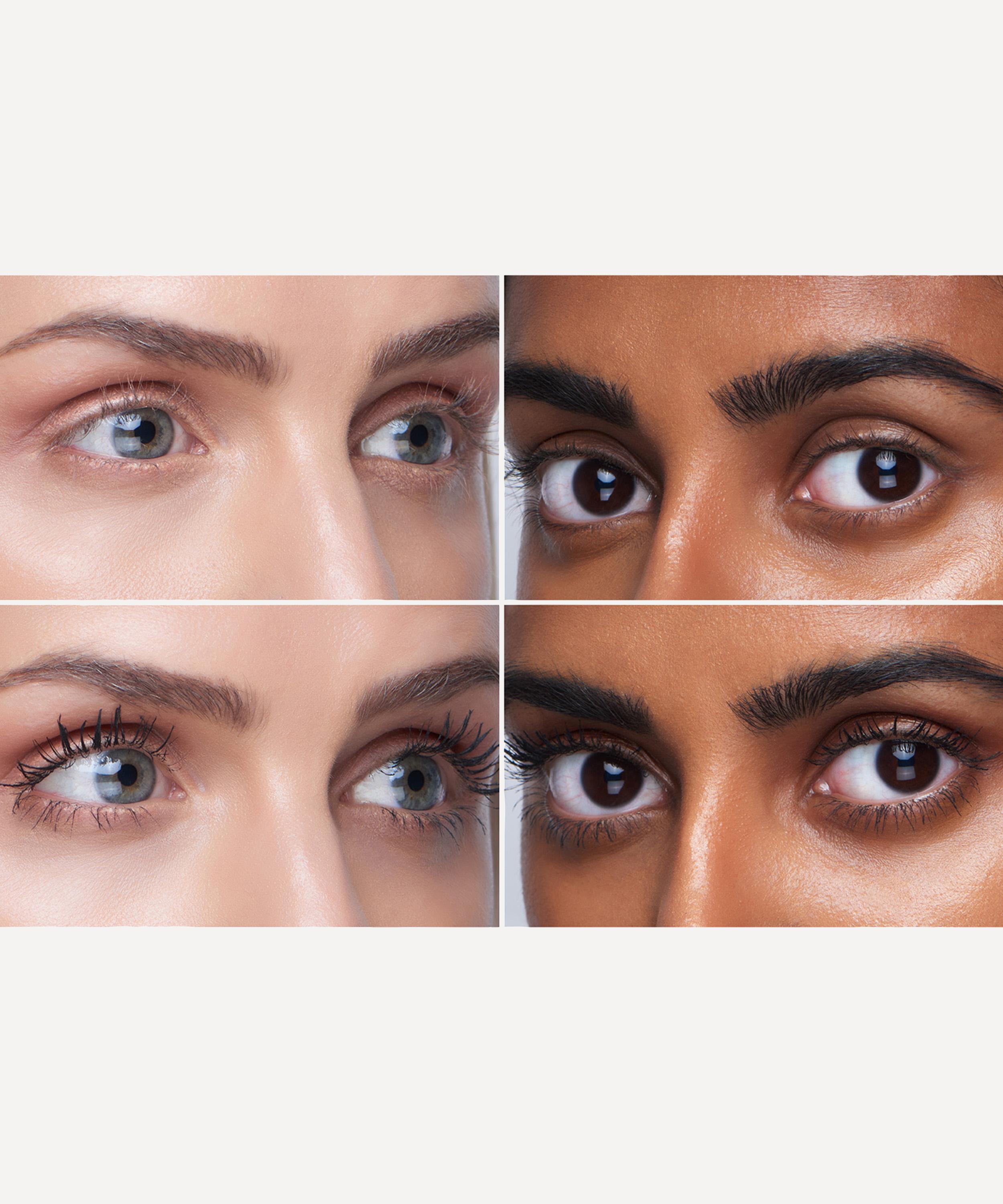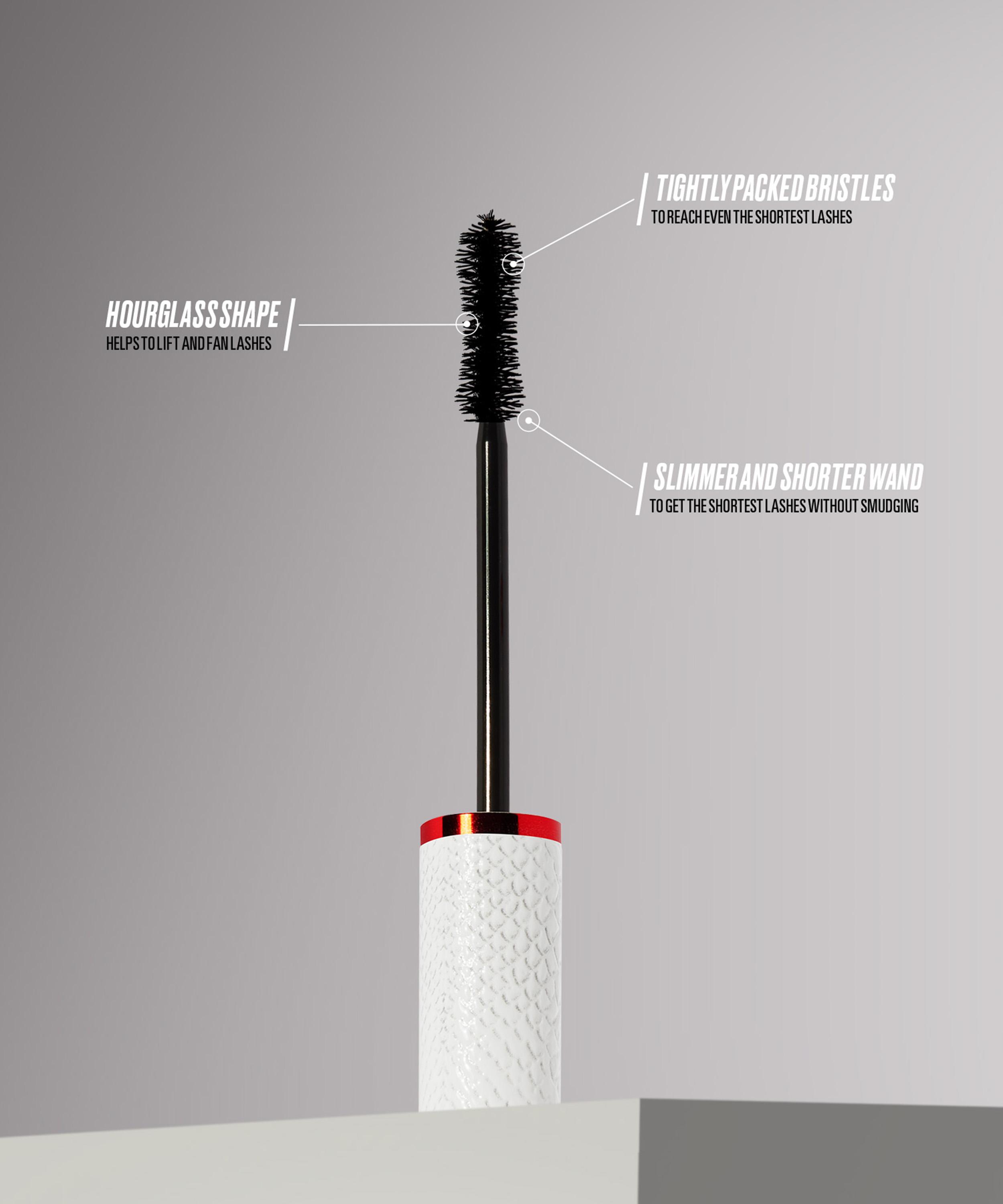Starting at the base of your lashes, stroke the wand upwards from root to tip. Gently wiggle the brush back and forth across lashes to increase thickness. Complete one full eye before moving on to the next. For maximum drama, generously coat your upper lashes using an upward stroke and wiggle motion. For the bottom lashes, aim the wand directly towards your lower lid and lightly brush the pointed tip against your lashes in a swift vertical motion.