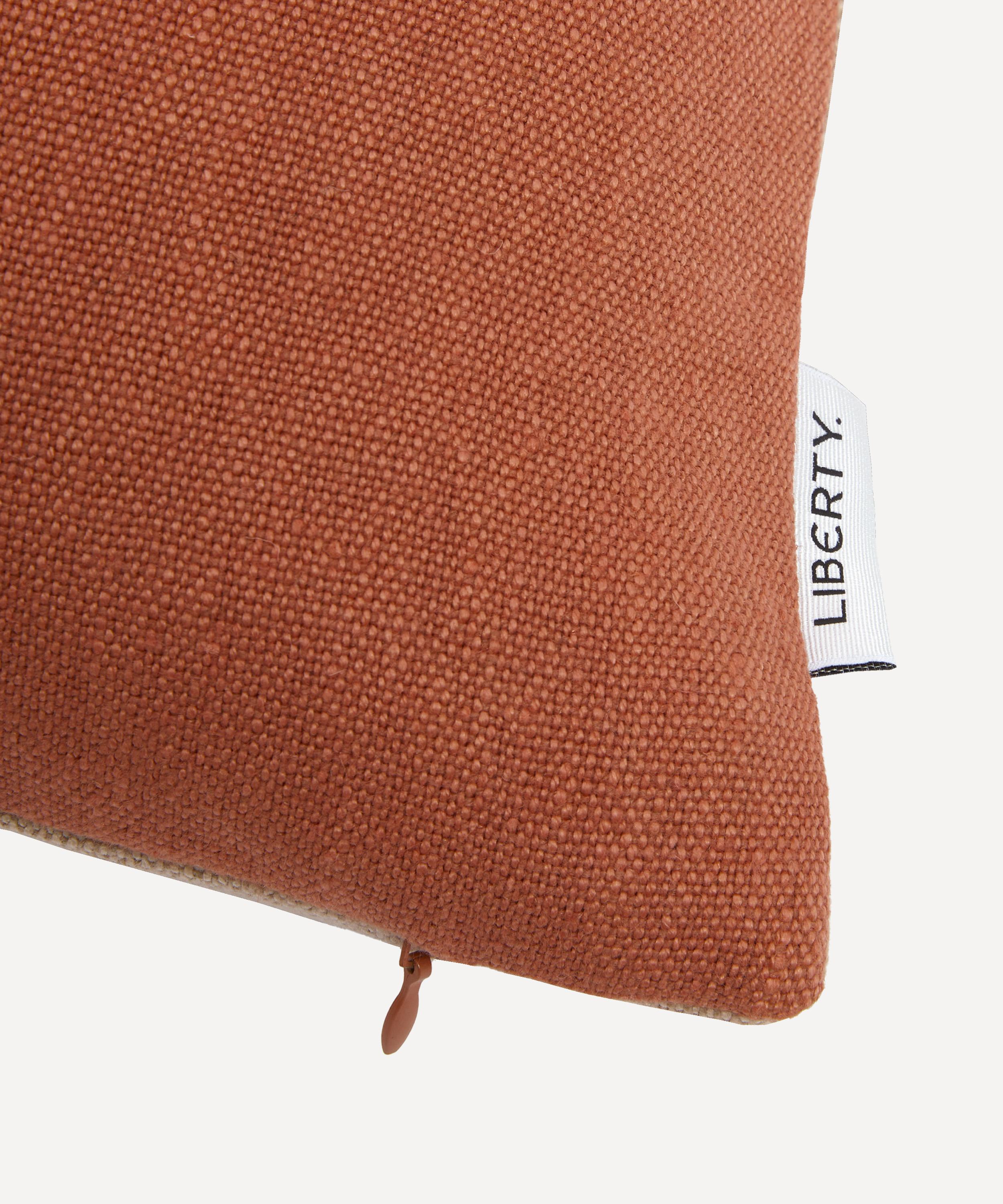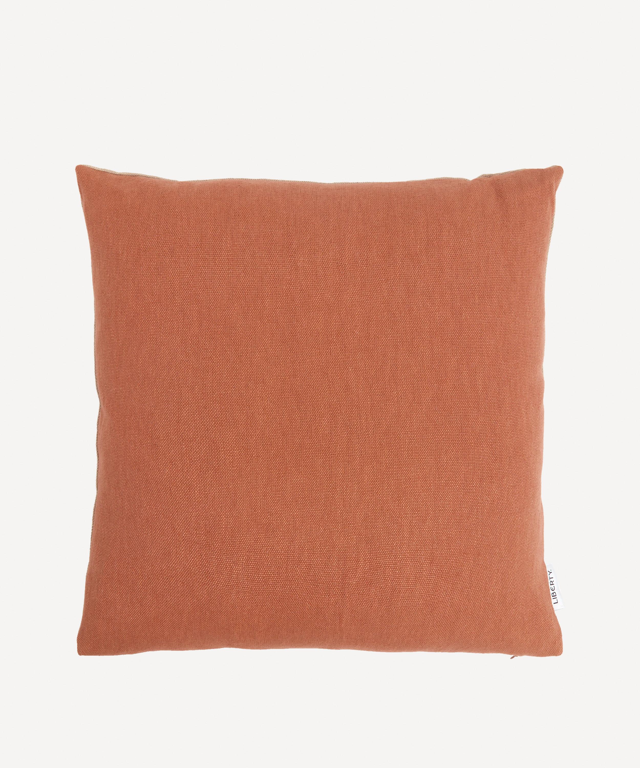 Liberty’s square cushion is crafted in England from a soft linen in two contrasting tones of pink.