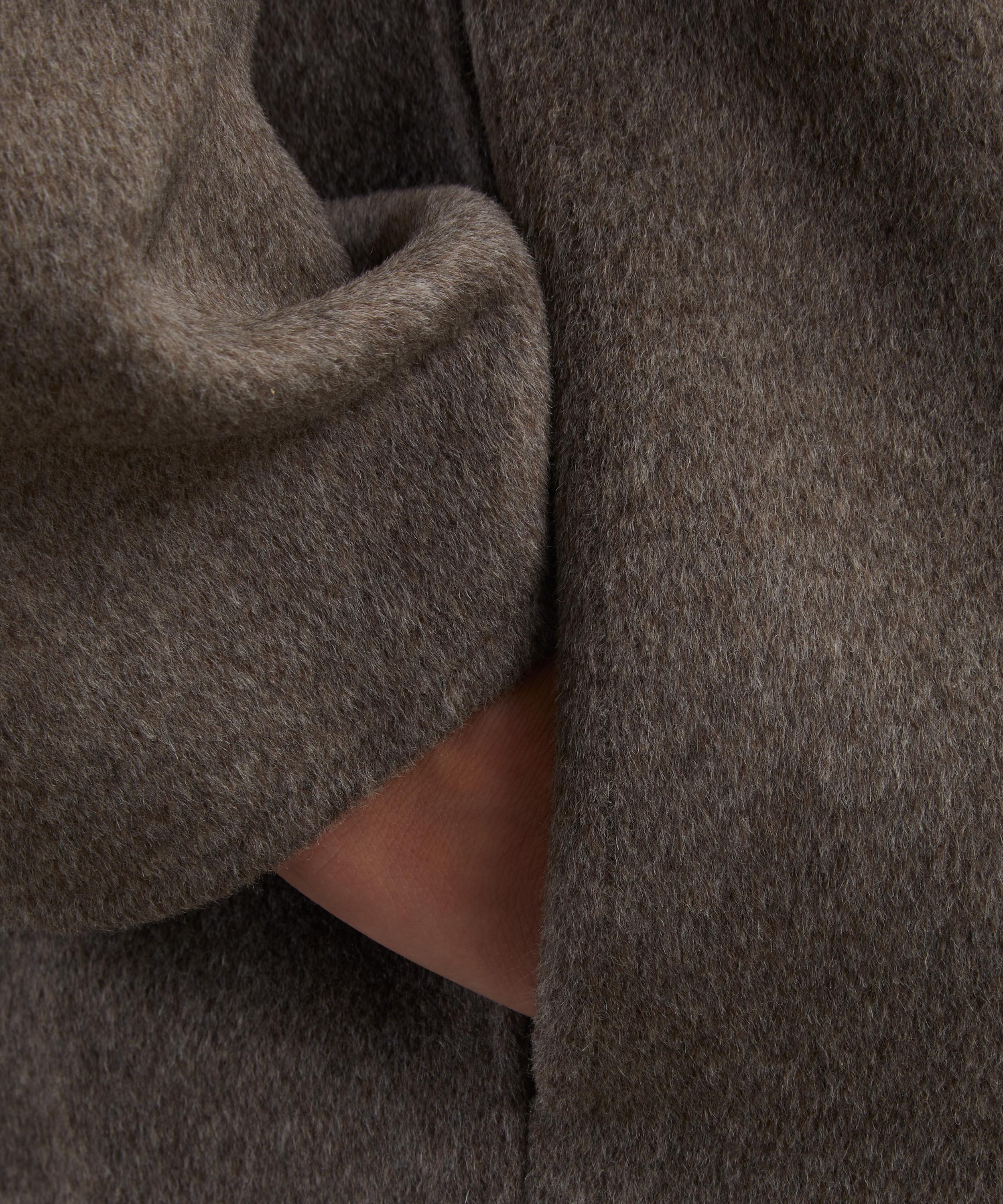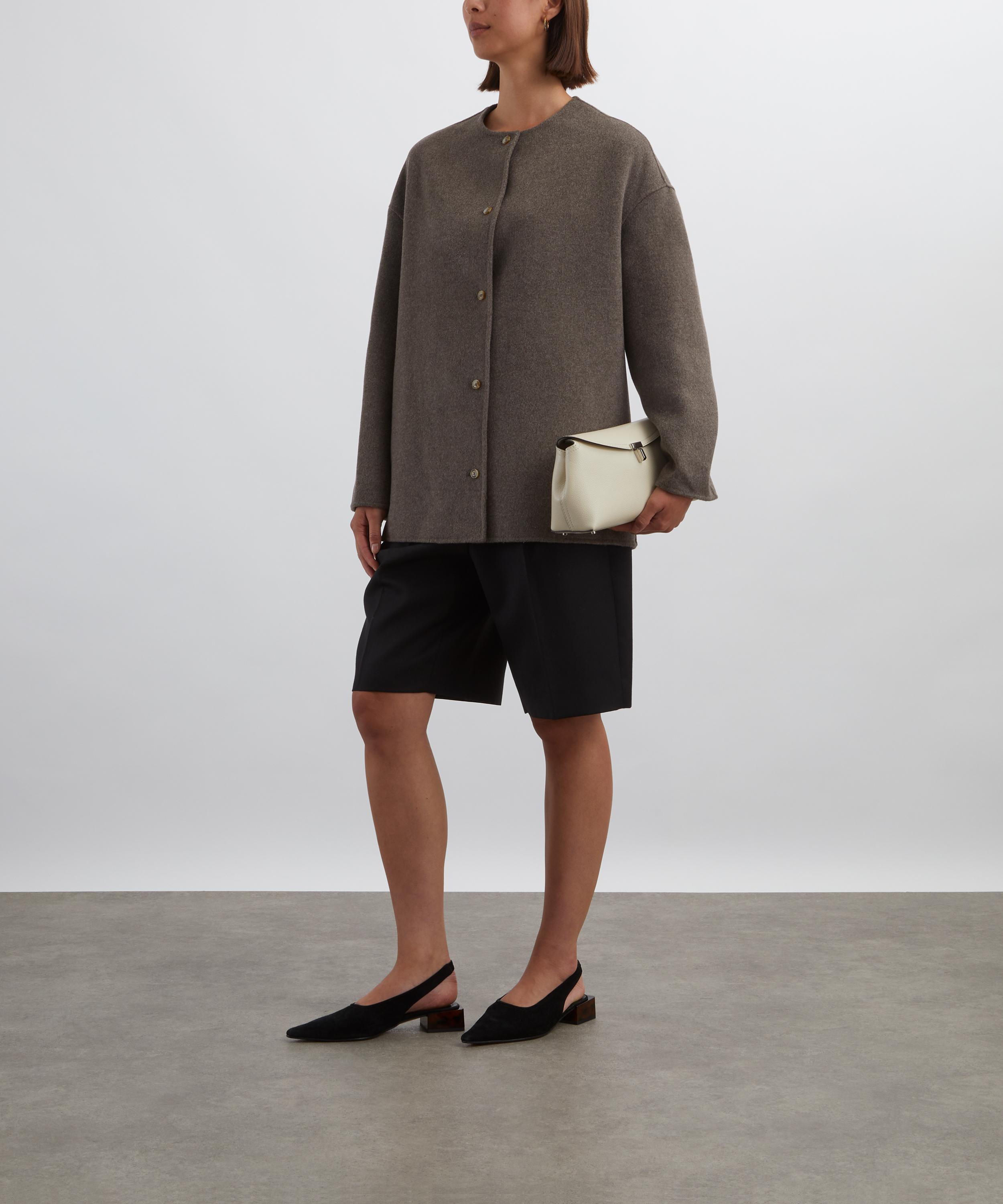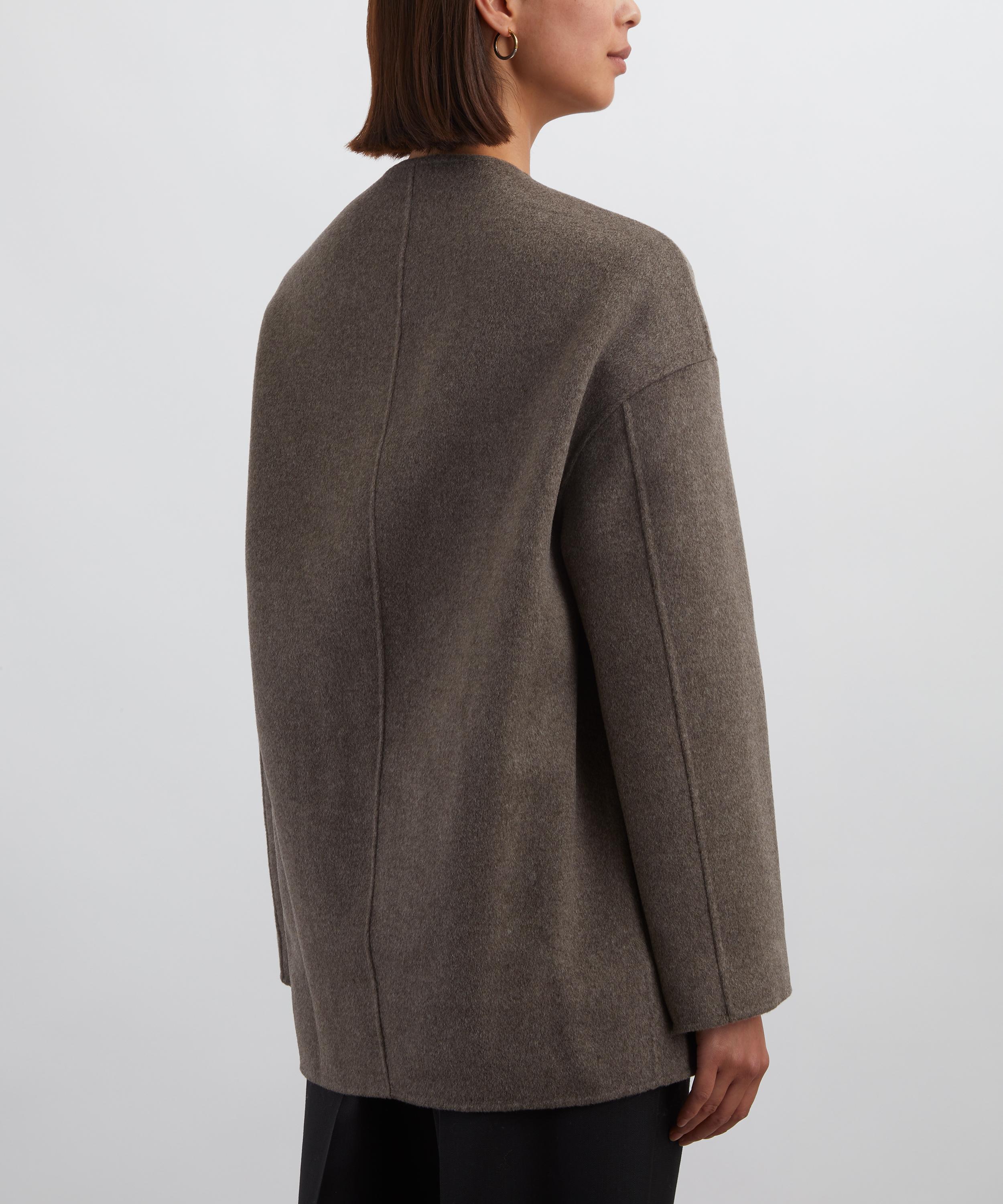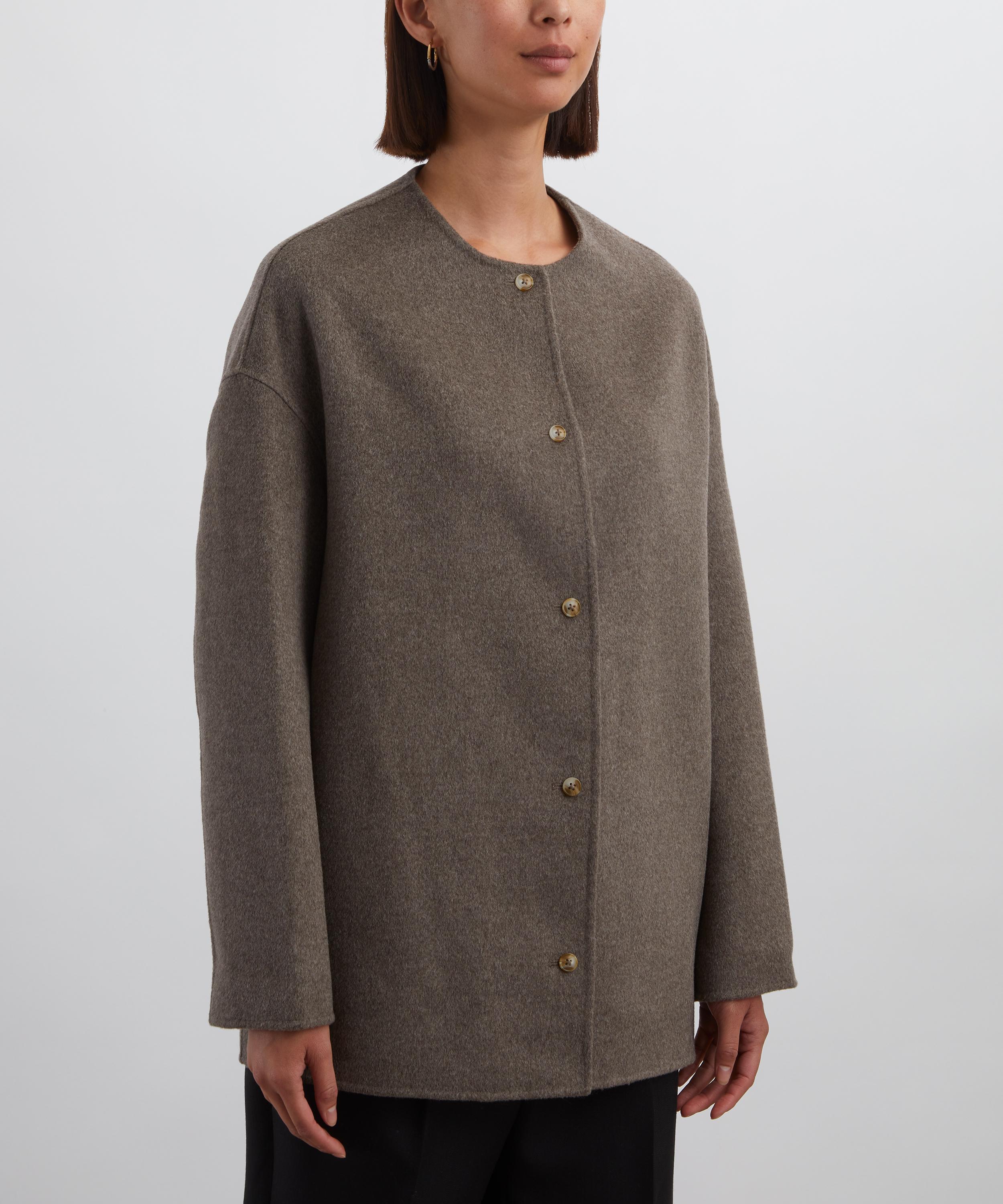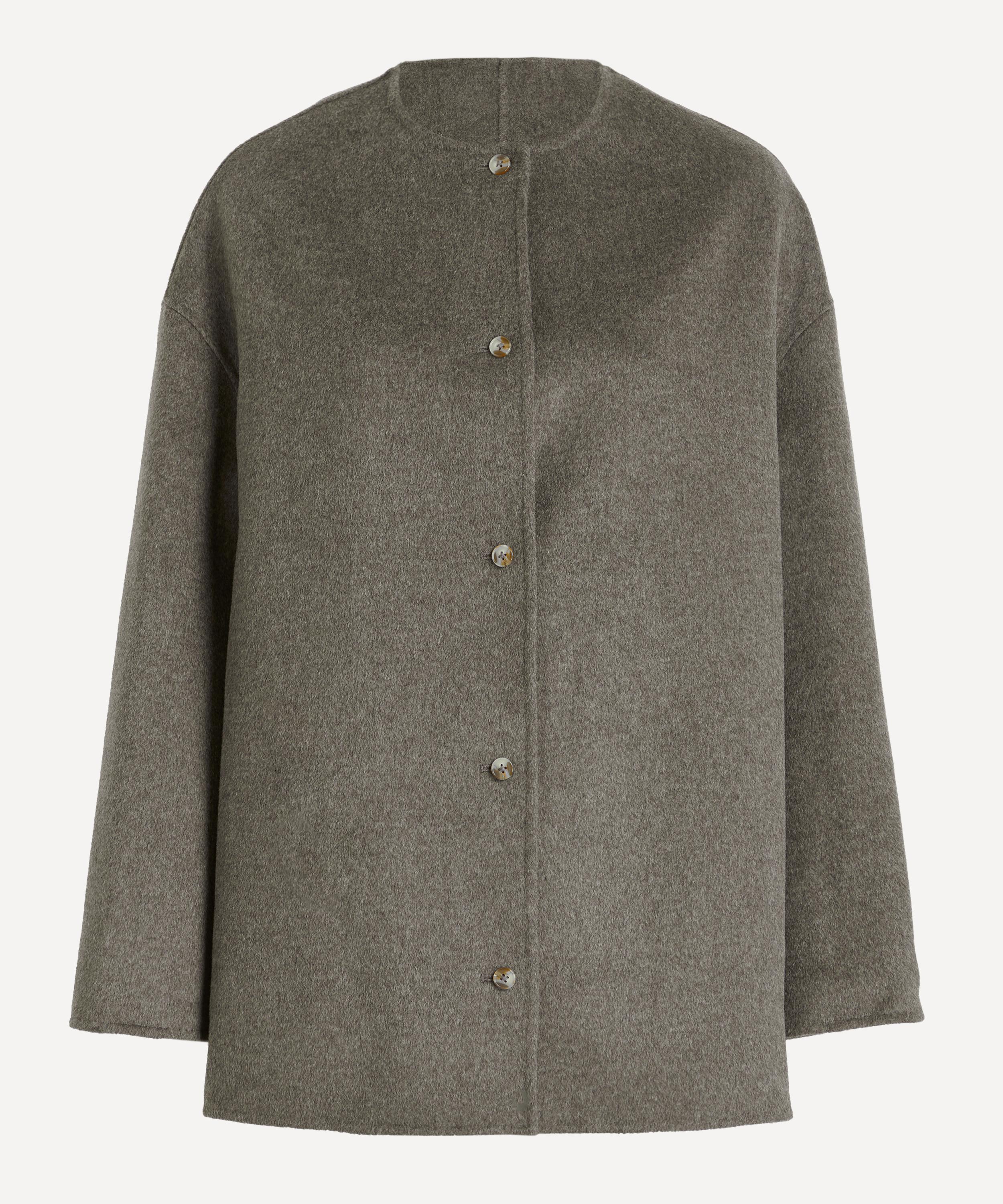 Crafted from soft wool-cashmere drap, this short coat features a straight fit and single-breasted front, underscoring its minimalist design. A collarless crew neckline and dropped shoulders complete the understated silhouette.