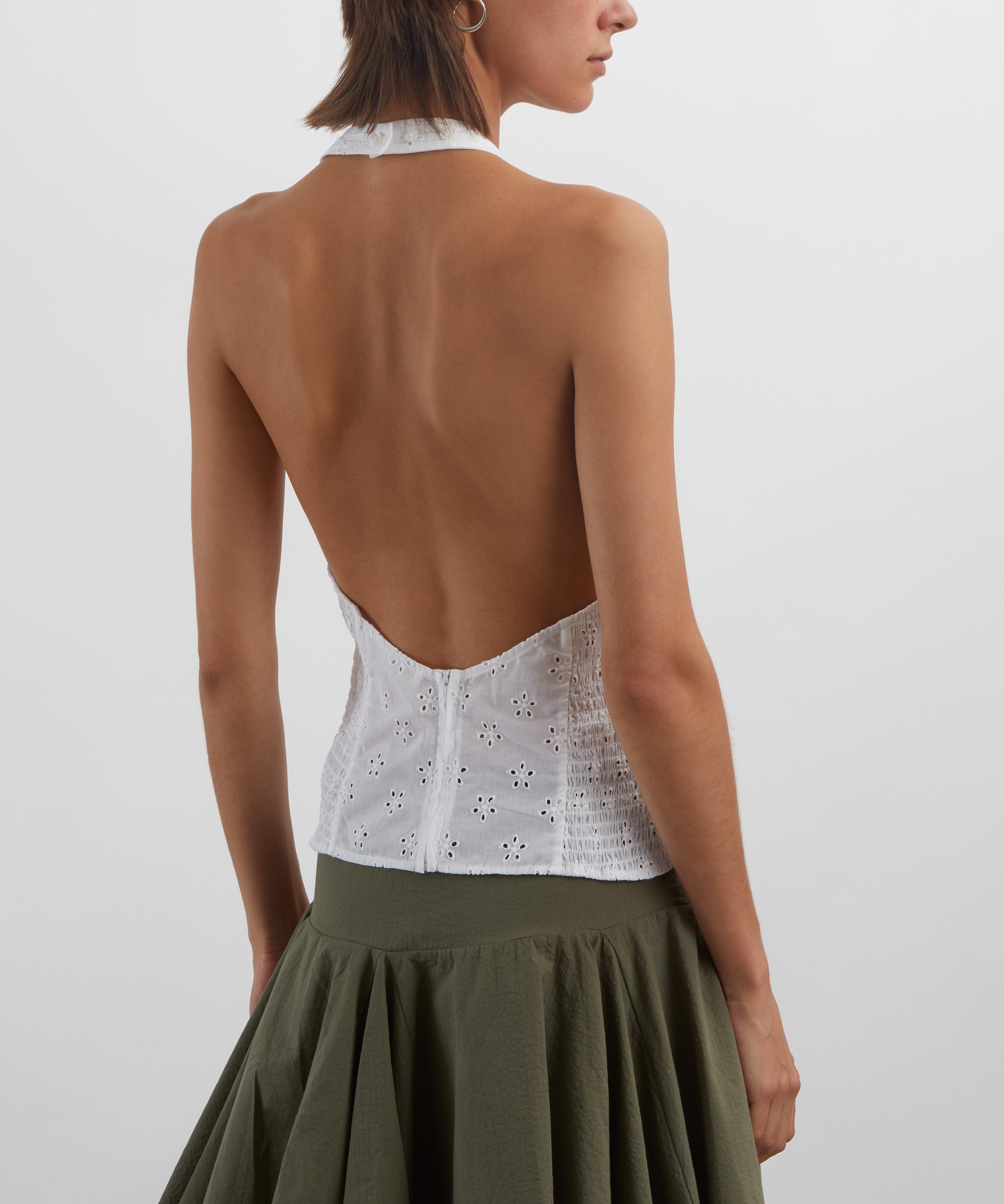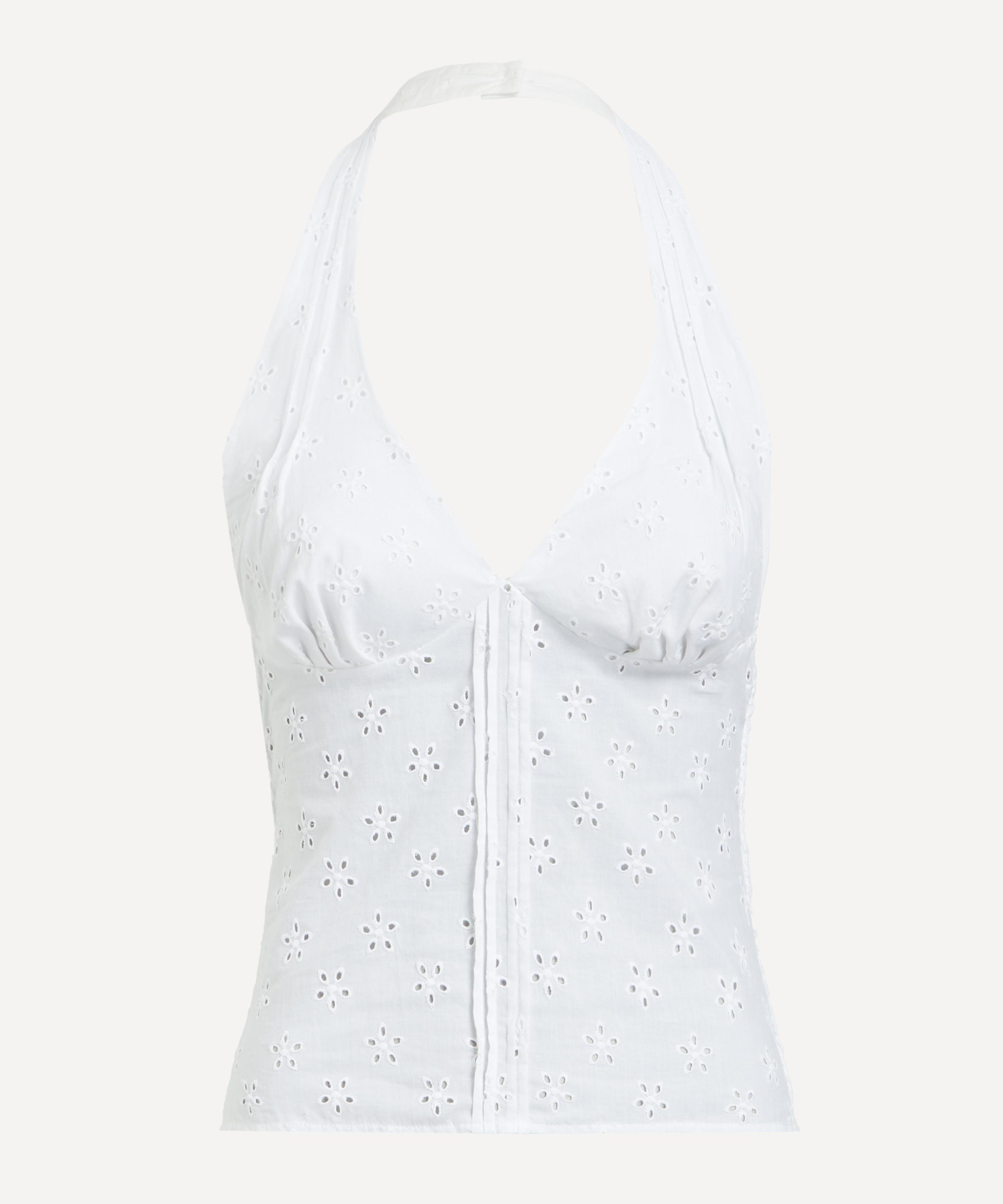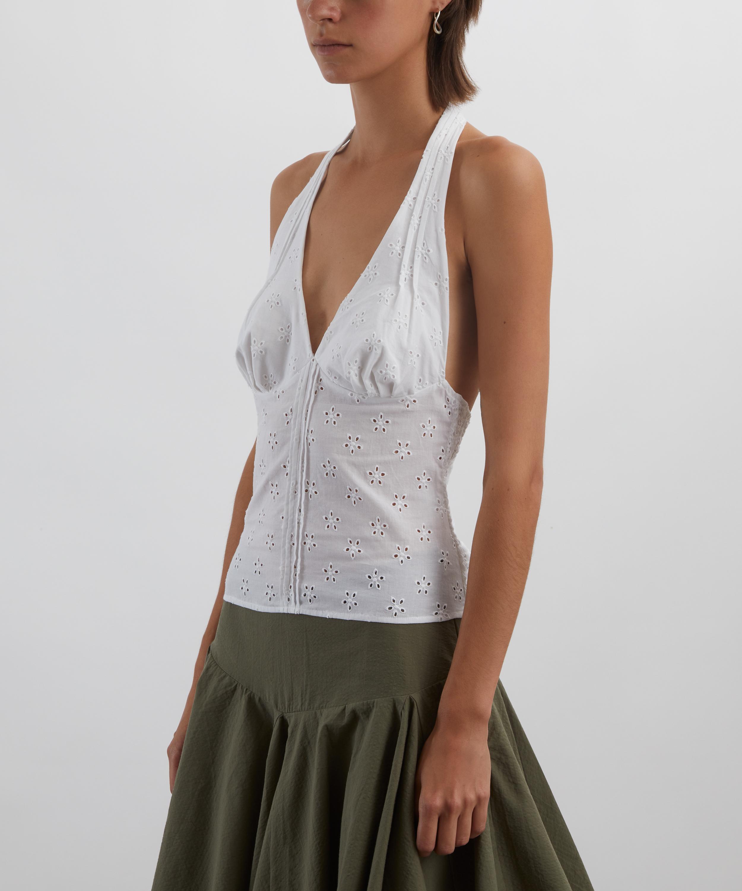 Crafted from cotton adorned with delicate broderie anglaise, the Dylan Top features a plunging halter neckline, a structured bodice, and an open back for a playful yet refined finish.