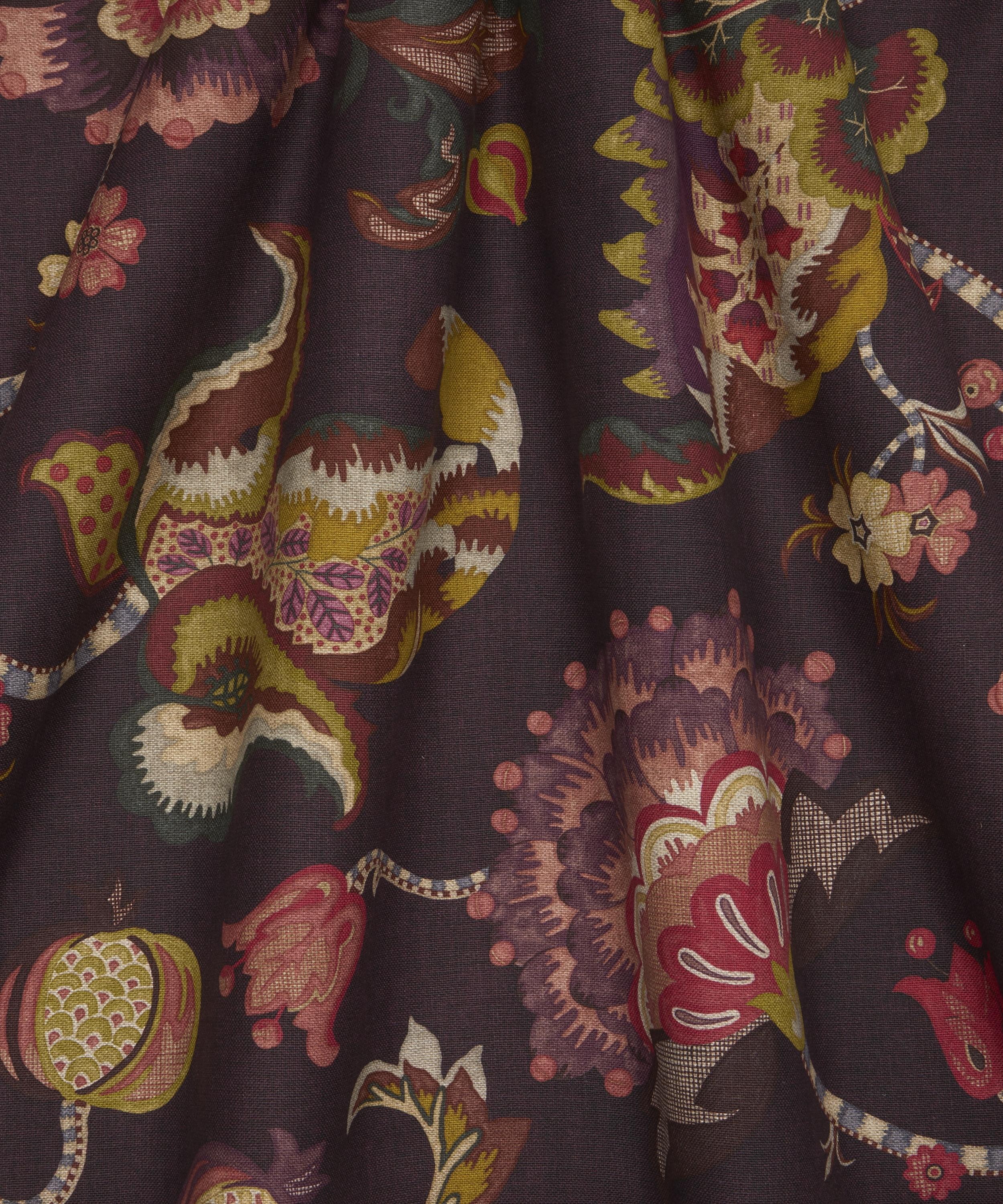 Drawing inspiration from a collection of Jacobean-style, hand-painted artworks discovered in the Liberty archive, this striking ornamental design showcases the grandeur of early 17th century textiles. Oversized flowers enveloped by lush foliage are depicted in refreshing hues and arranged in a trailing Tree of Life-style pattern, highlighting the richness of flow and form. Expertly printed in Italy onto a linen base with a heavy drape and soft tumbled finish, Eden Orchard is suitable for upholstery, drapery, cushions, and accessories.