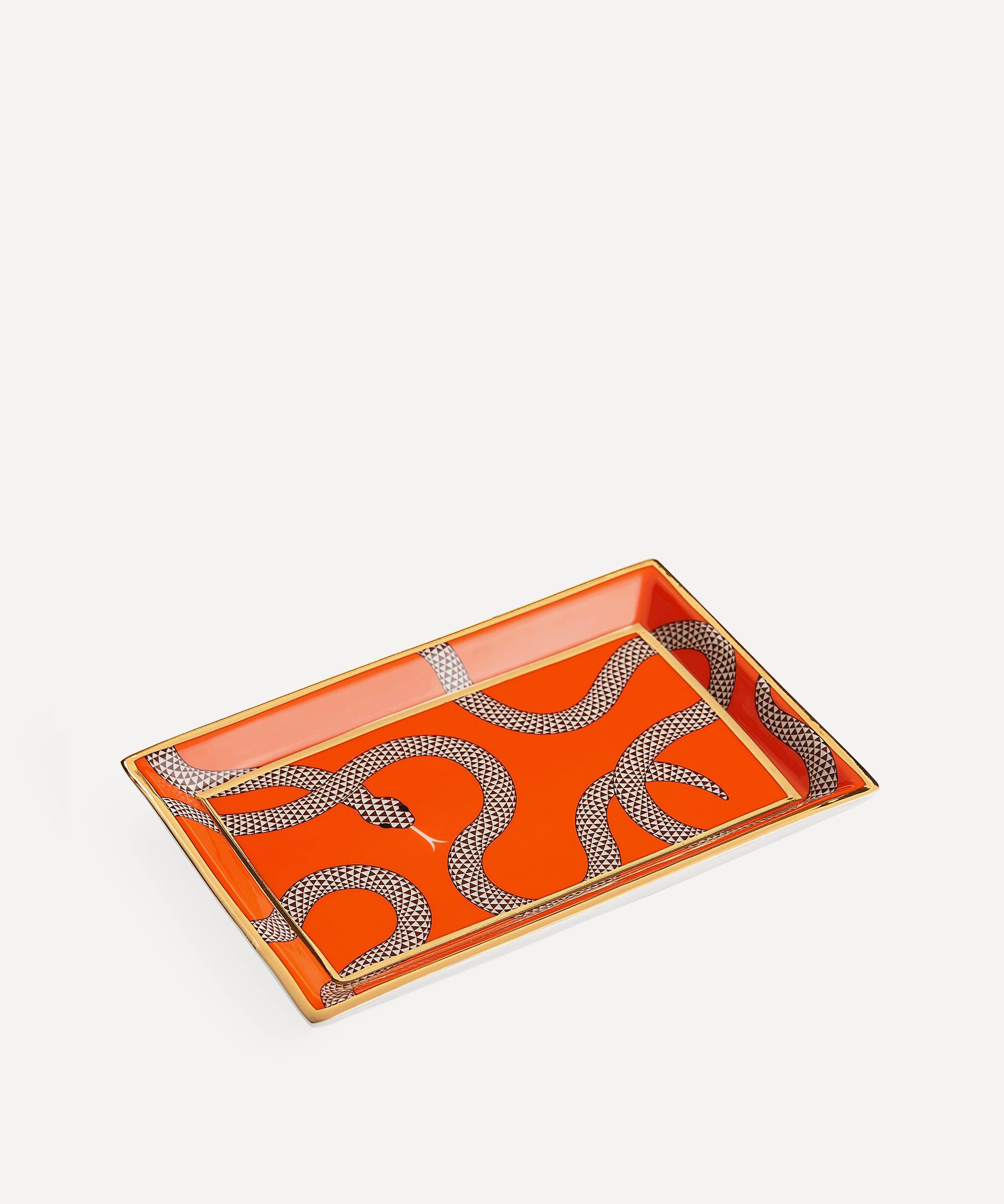 The tray is expertly crafted from high-fired porcelain and defined by a standout serpent-inspired design, accentuated by the alluring, rich orange backdrop and warm gold accents. The ideal gift for hosts and hostesses, it adds charm to your cocktail hours and styles effortlessly with other pieces from Jonathan Adler’s Eden collection.