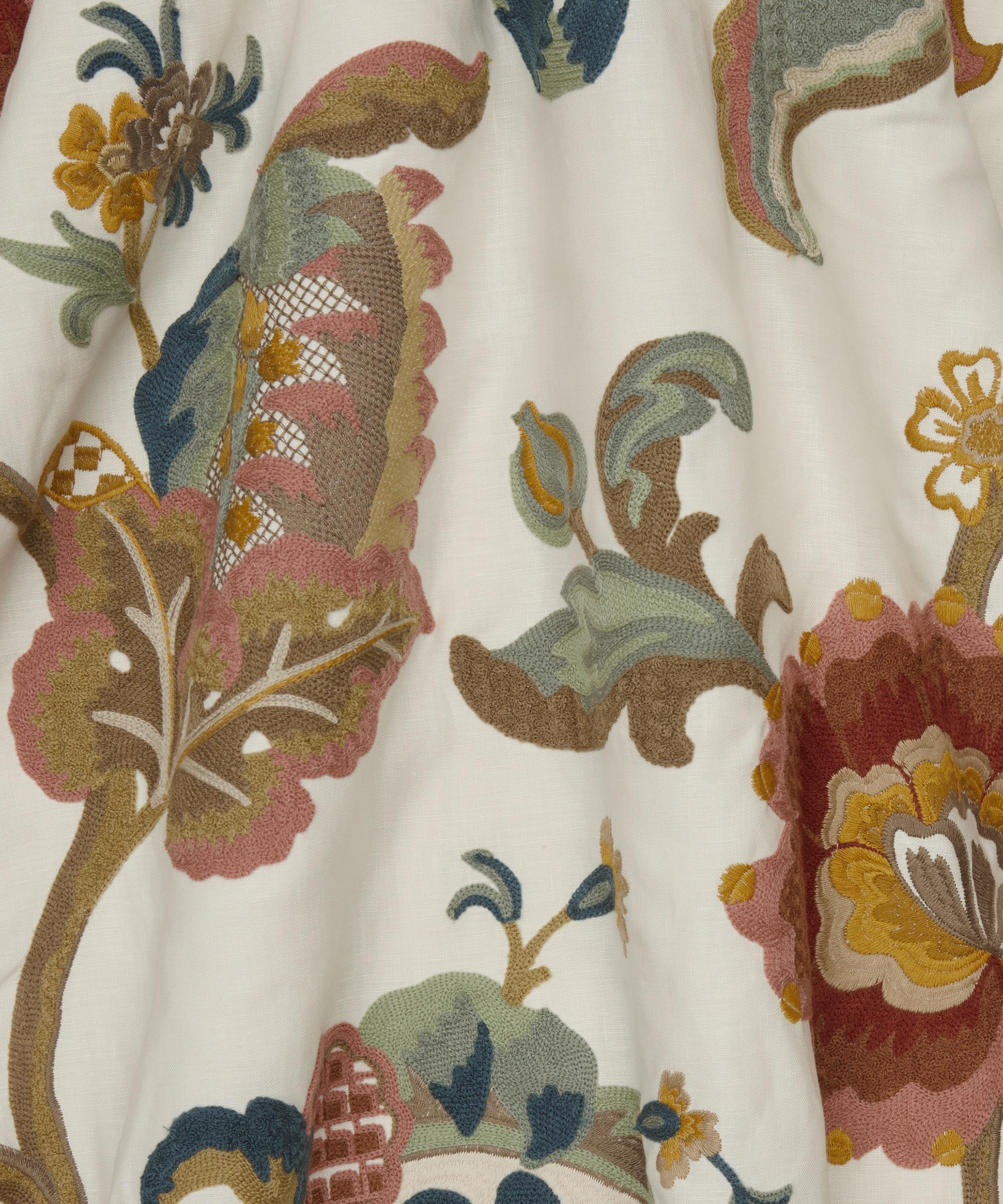 Drawing inspiration from a collection of Jacobean-style, hand-painted artworks discovered in the Liberty archive, this striking ornamental embroidery showcases the grandeur of early 17th century textiles. Oversized flowers enveloped by lush foliage are depicted in refreshing hues and arranged in a trailing Tree of Life-style pattern, highlighting the richness of flow and form. Carefully crafted by expert embroiderers in India using brightly hued yarns, Eden Stitch is ideal for upholstery, drapery, and cushions.