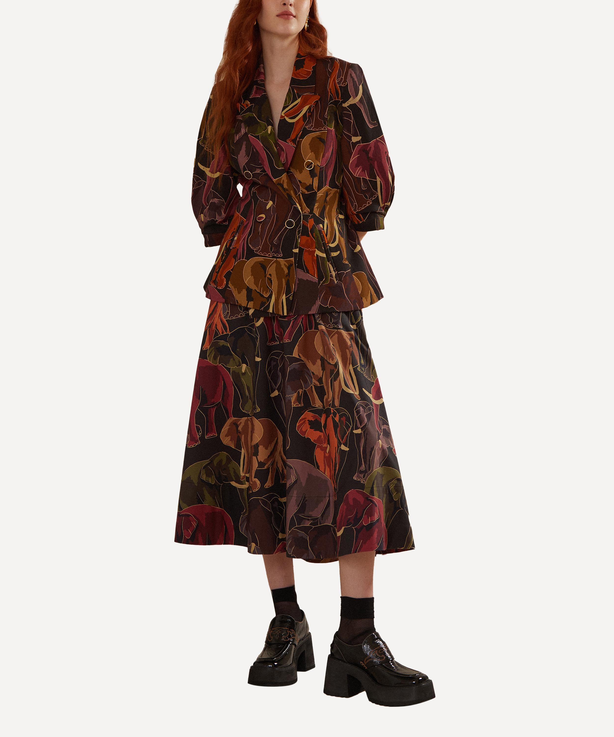 An elevated take on traditional tailoring with its smart pleating and waisted design, this beautiful skirt playfully presents an idiosyncratic elephant print throughout, meticulously finished with a self-fabric covered button fastening – style with the Elephants Blazer for a slick, statement co-ord.