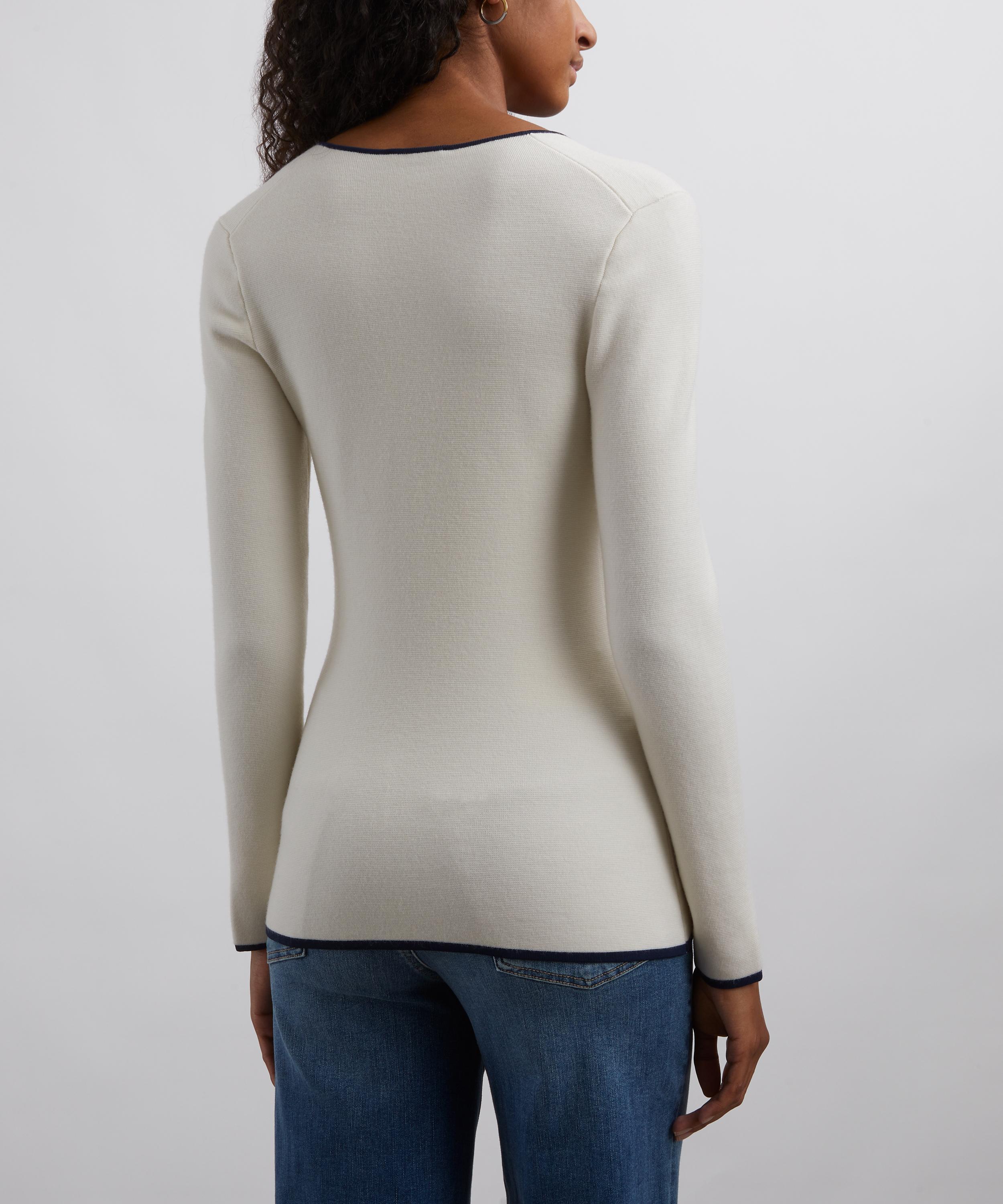 Crafted from a soft yet structured Merino wool blend, this contrast trim cardigan is a refined staple with a modern twist. It features an elegant scoop neckline, subtle front pockets, and a concealed zip closure, offering both style and sophistication.