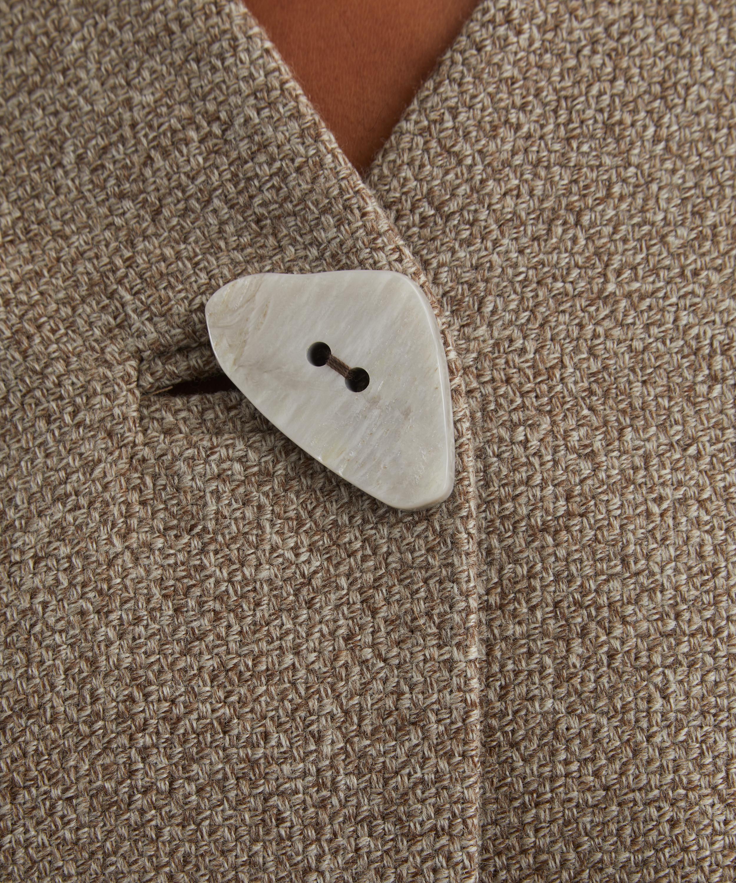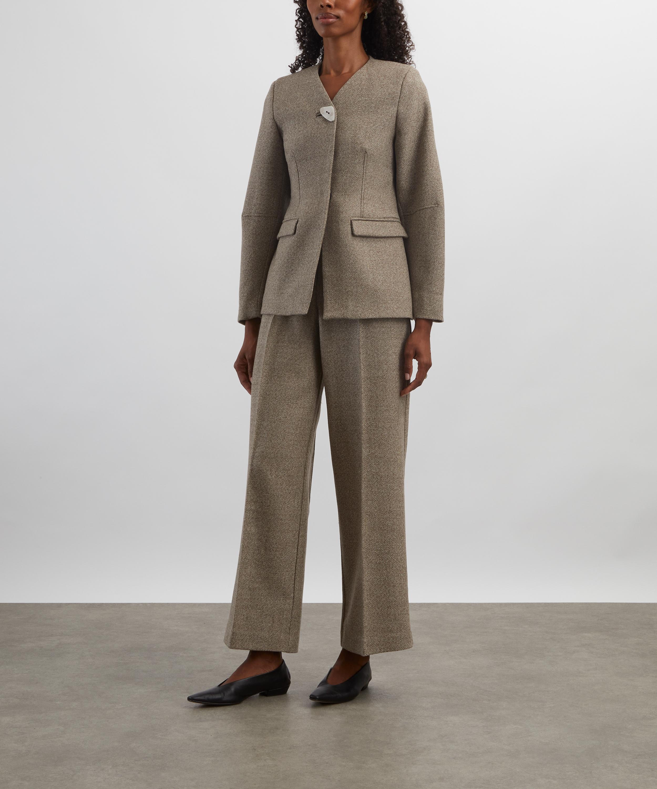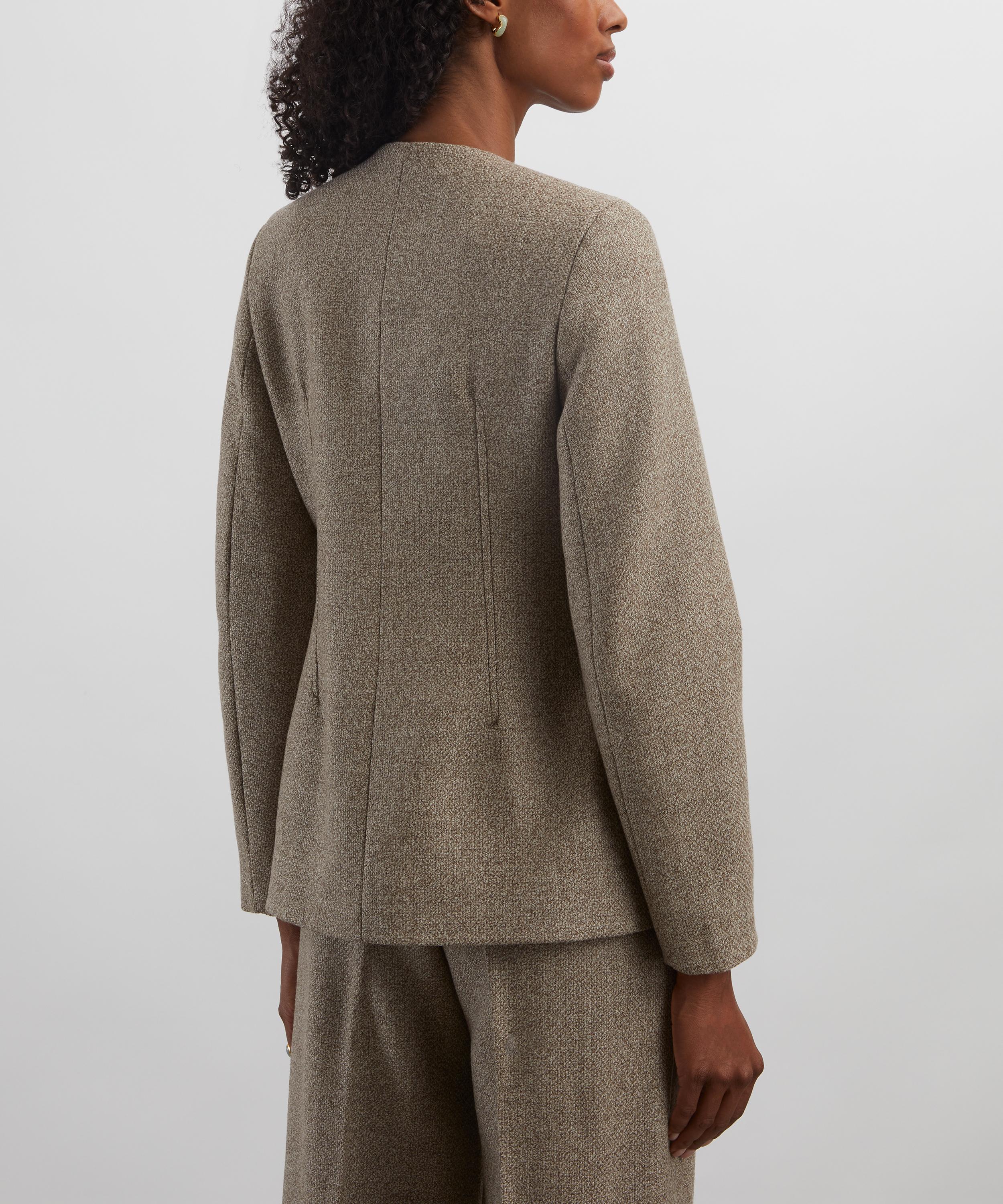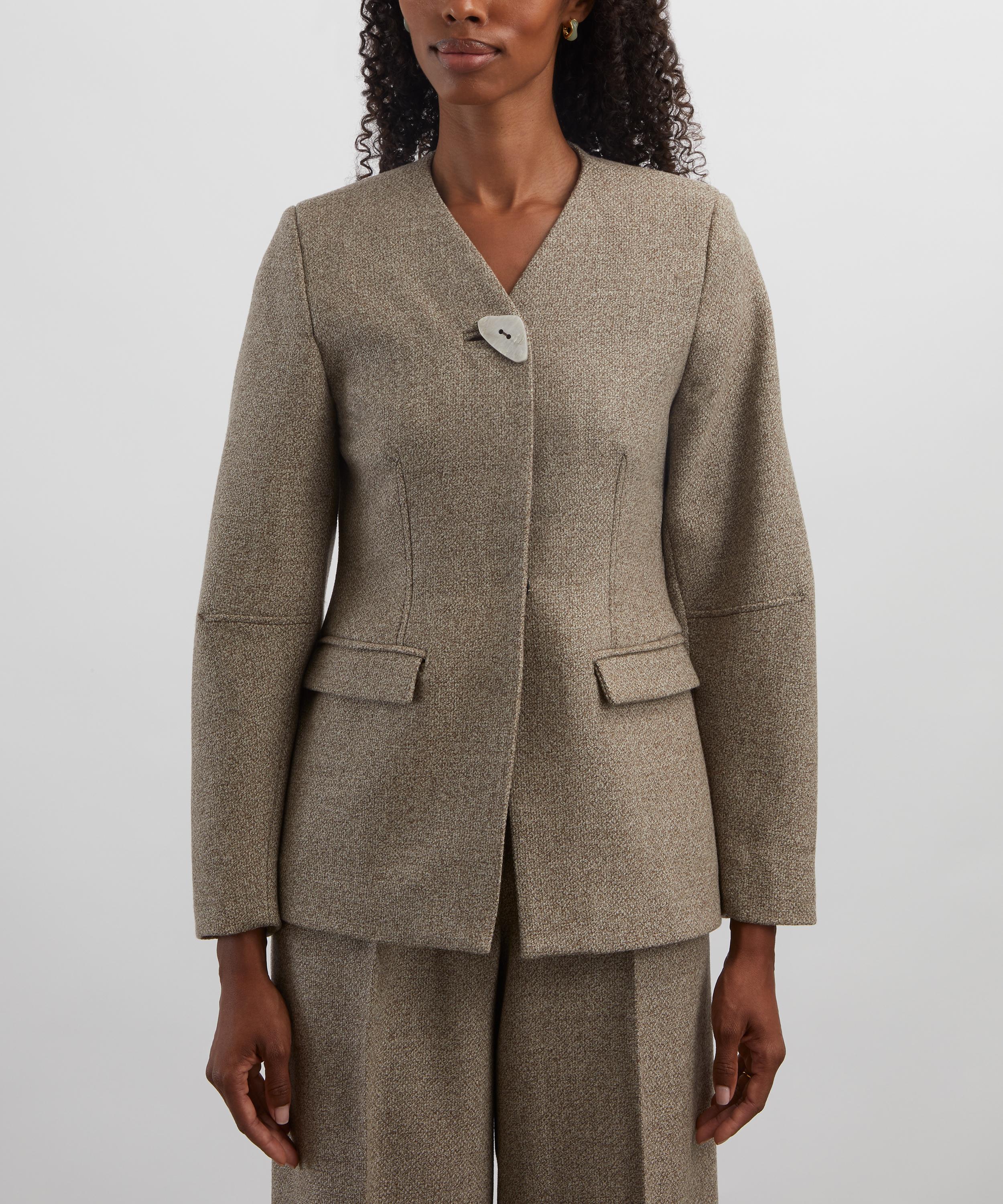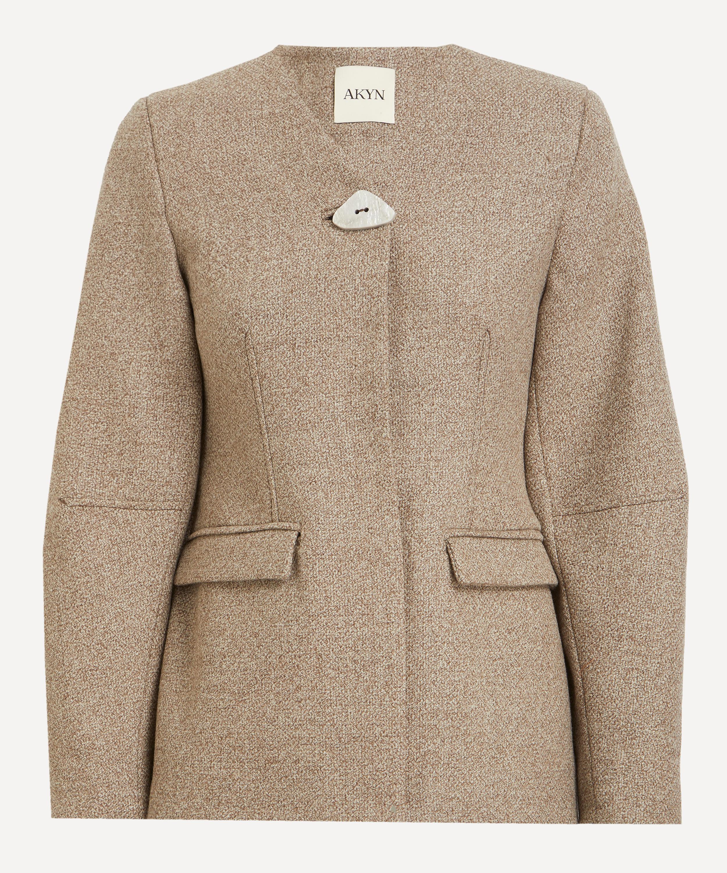 Crafted from a linen, wool and lyocell blend, the Elsie jacket is tailored with a sculpted silhouette that contours the frame. Sharp seam detailing along the sleeves accentuates its structure, while a clean V-neckline adds refined femininity. A single faux shell button completes the look for a minimalist touch, capturing AKYN’s signature balance of elegance and design.