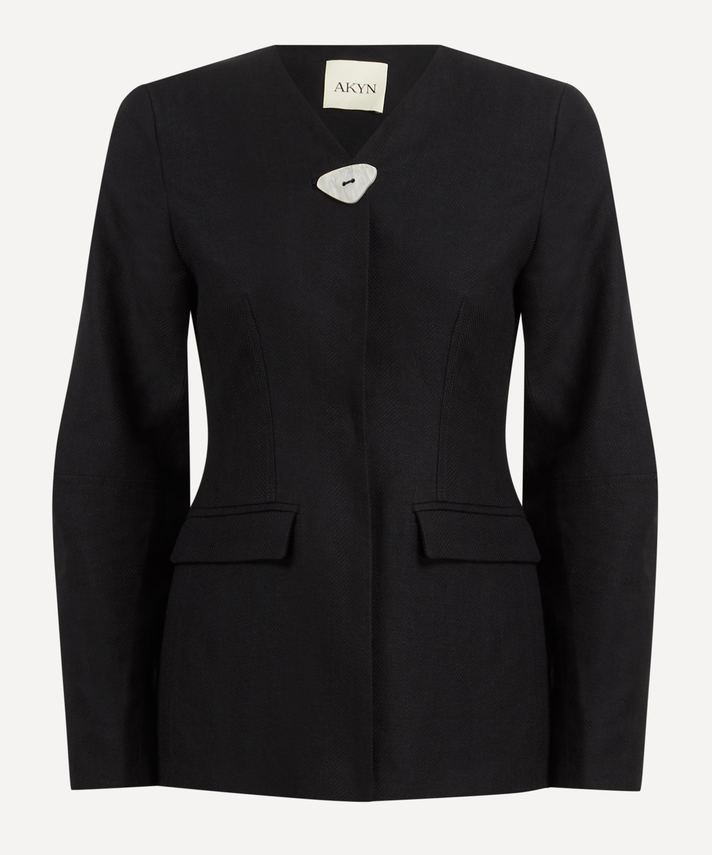 Crafted from a linen, wool and lyocell blend, the Elsie jacket is tailored with a sculpted silhouette that contours the frame. Sharp seam detailing along the sleeves accentuates its structure, while a clean V-neckline adds refined femininity. A single faux shell button completes the look for a minimalist touch, capturing AKYN’s signature balance of elegance and design.
